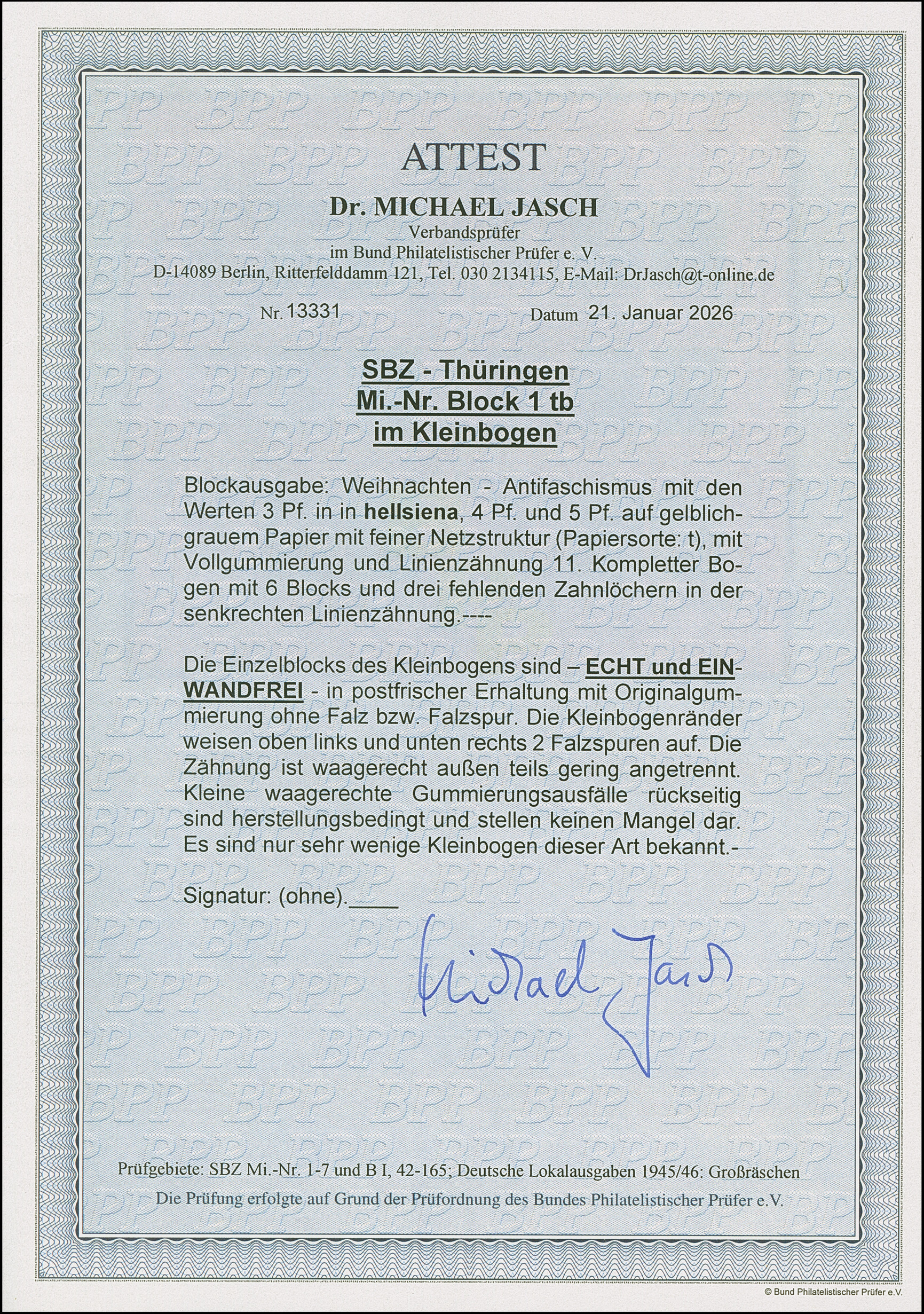 1945, Antifa-Block mit 3 Pfg. in der seltenen Farbe Hellsiena auf gelblichgrauem Papier, kompletter Kleinbogen mit 6 postfrischen Exemplaren; im Bogenrand leichte Falzspuren und gering angetrennt. Blocks tadellos. Kleinbogen der sogenannten ‘Fehlfarbe’ zählen zu den großen SBZ-Seltenheiten. PROFI hat keinen weiteren registriert. Unsigniert, Fotoattest Dr. Jasch BPP (2026)