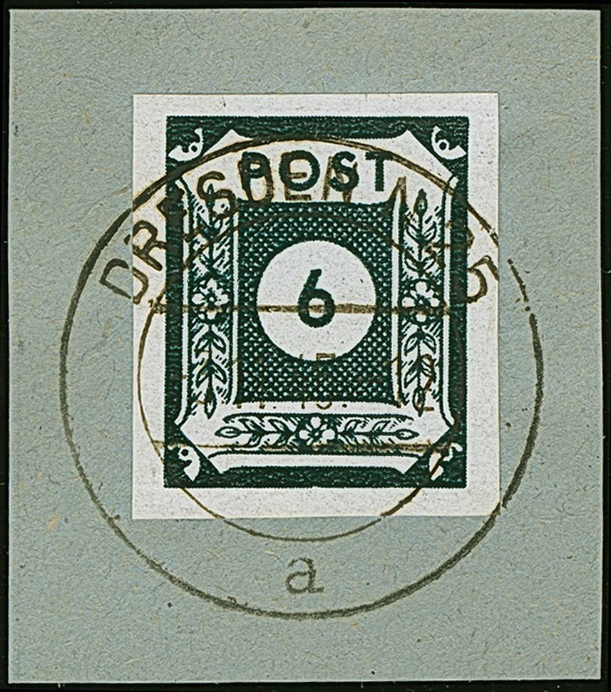6 Pfg. grünlichschwarz in fast schwarzer Nuance (fetter Druck) mit Stempel “DRESDEN N25 3.11.45” auf Briefstück in tadelloser Erhaltung. Ein sehr schönes Exemplar dieser seltenen Farbe, Fotoattest Ströh BPP (1996)