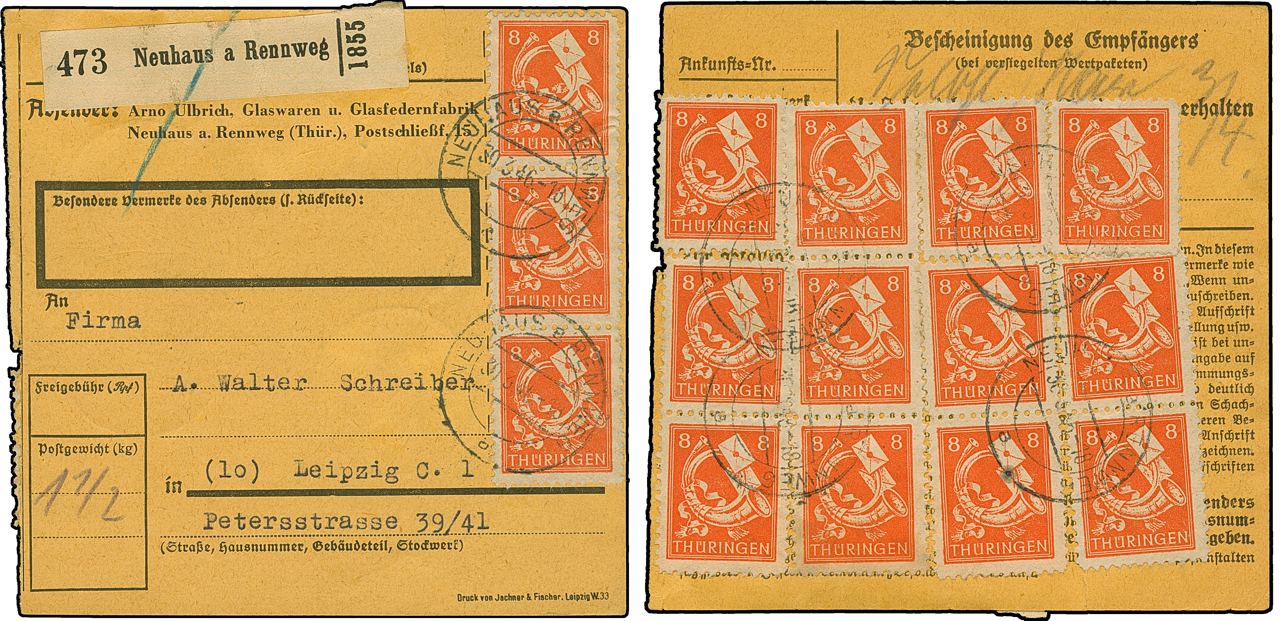 1945, 8 Pfg. rotorange, 15 Stück mit Stempel “NEUHAUS a. RENNWEG 30.3.46” als tarifgerechte Mehrfachfrankatur vorder- und rückseitig auf Paketkarte nach Leipzig. Die Marken zum Teil mit kleinen Zahnfehlern bzw. Knitterspuren und das Formular oben mit kleinem Einriss, ansonsten in guter Erhaltung. Eine seltene “Massen”-Frankatur