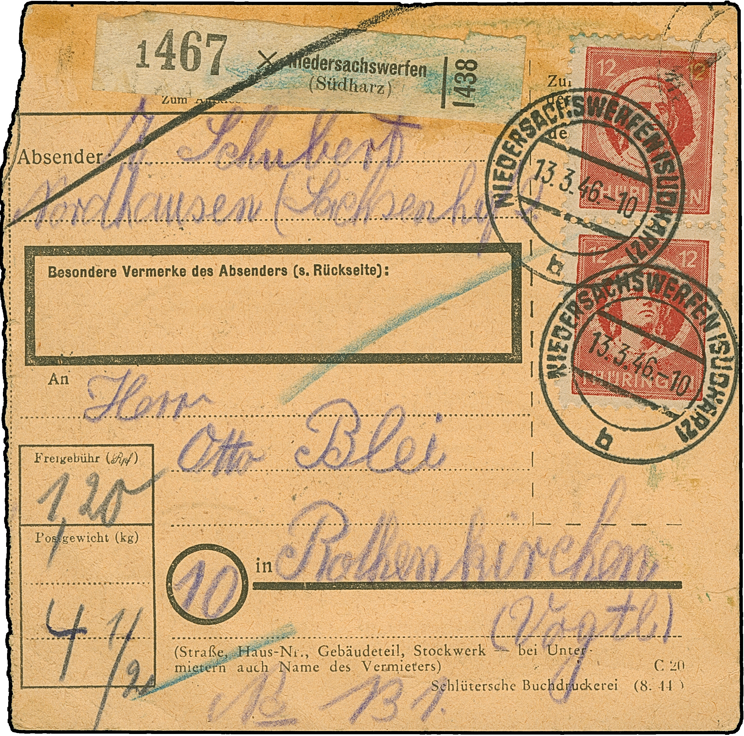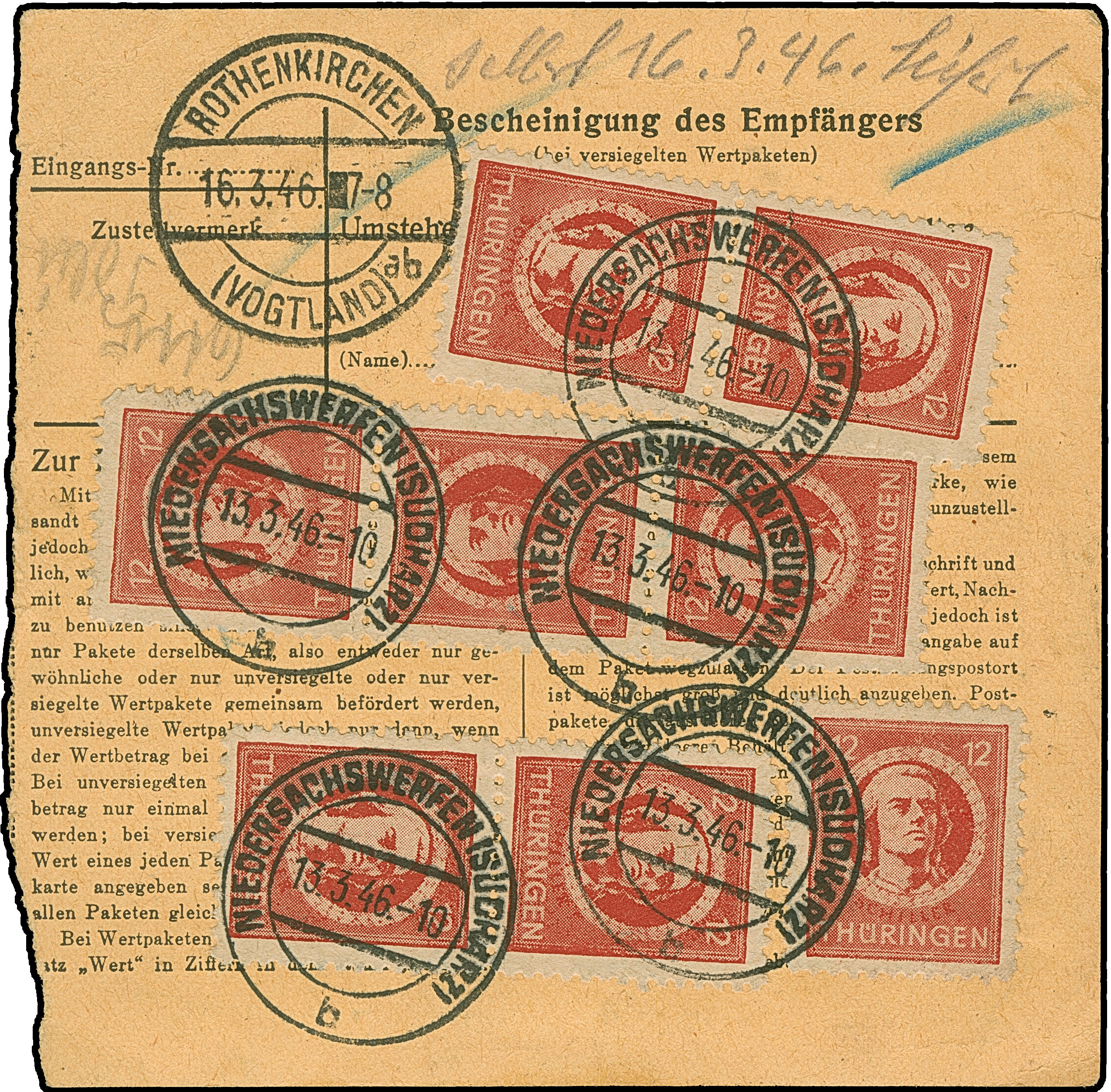 1945, 12 Pfg. dunkelbräunlichrot, 10 Stück mit Stempel "NIEDERSACHSENWERFEN (SÜDHARZ) 13.3.46” als tarifgerechte Mehrfachfrankatur vorder- und rückseitig auf Paketkarte nach Rothenkirchen. Eine Marke mit Gummiflecken oben, ansonsten in guter Erhaltung. Eine seltene “Massen”-Frankatur