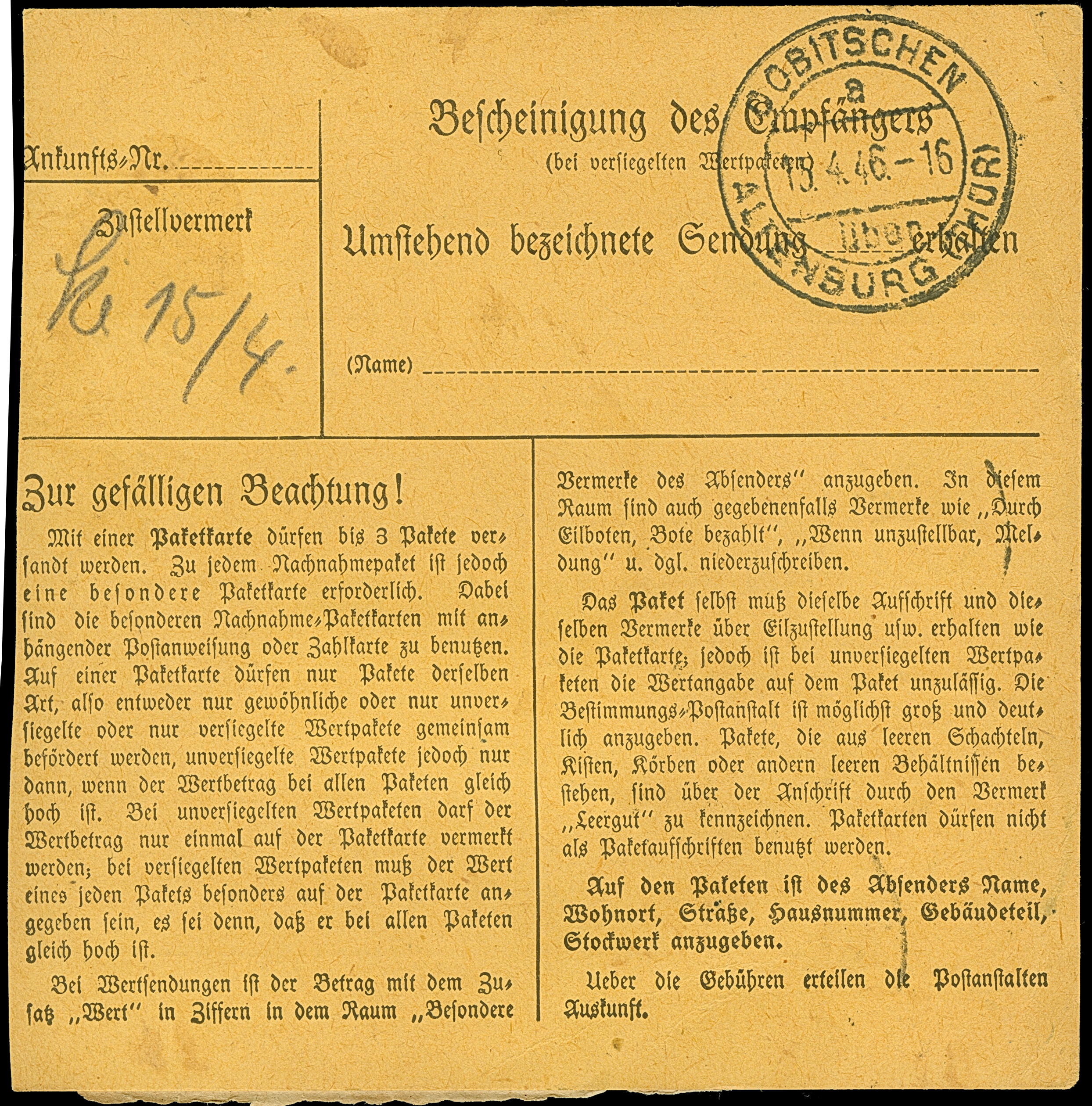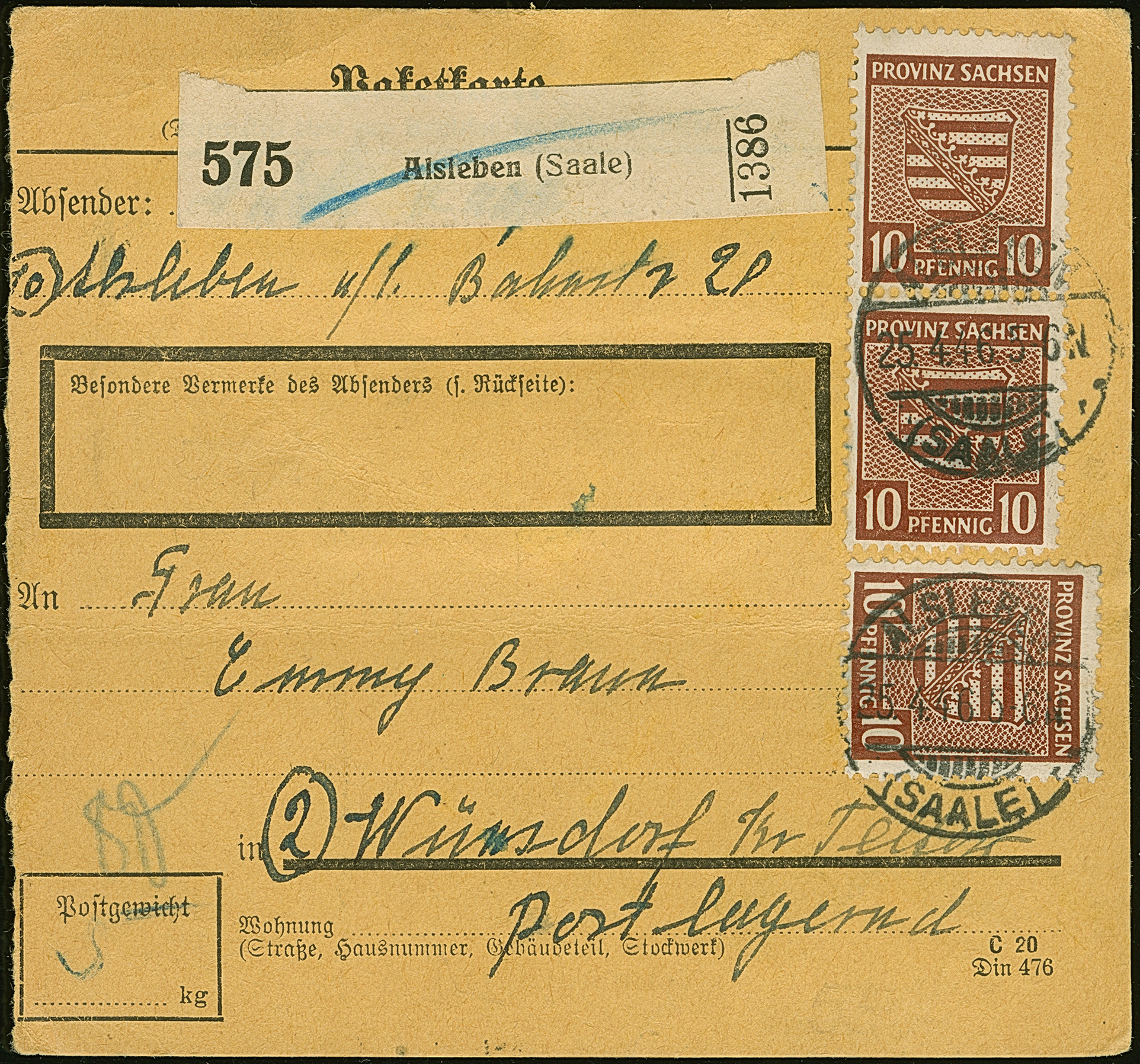 1945, Wappen 10 Pfg., 8 Stück mit Stempel “ALSEBEN 25.4..46" als portogerechte Mehrfachfrankatur vorder- und rückseitig auf Paketkarte nach Wünsdorf mit Vermerk “postlagernd”, in guter Erhaltung. Eine nicht häufige Mehrfachfrankatur