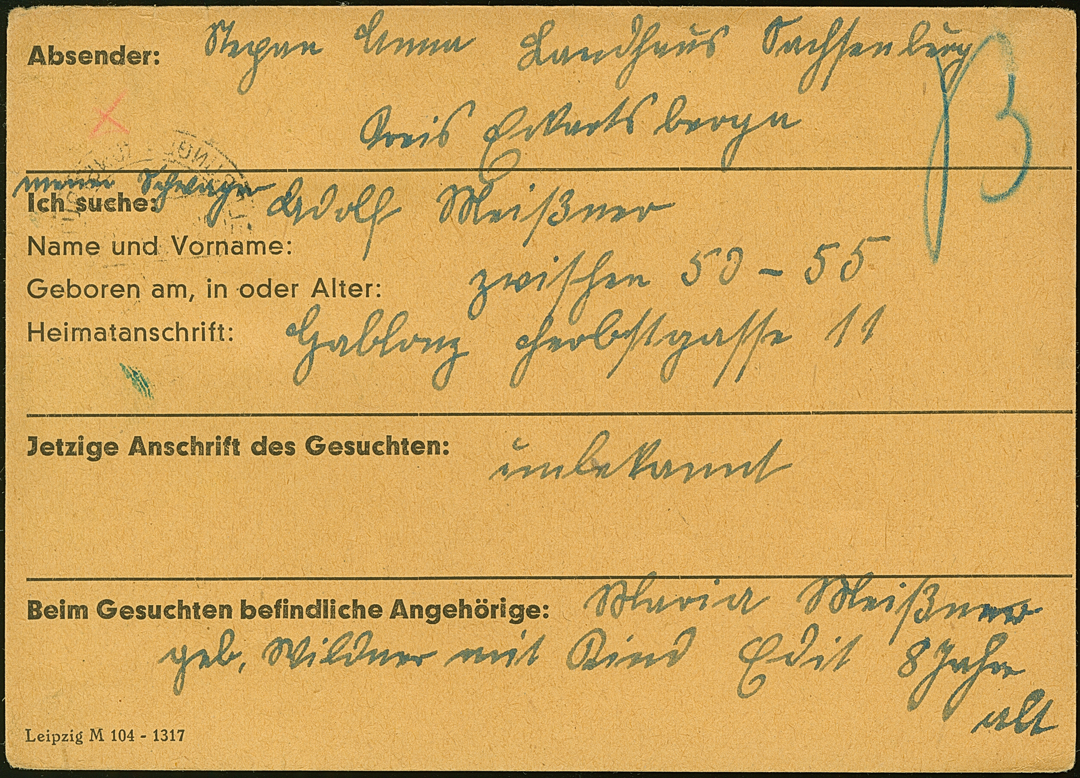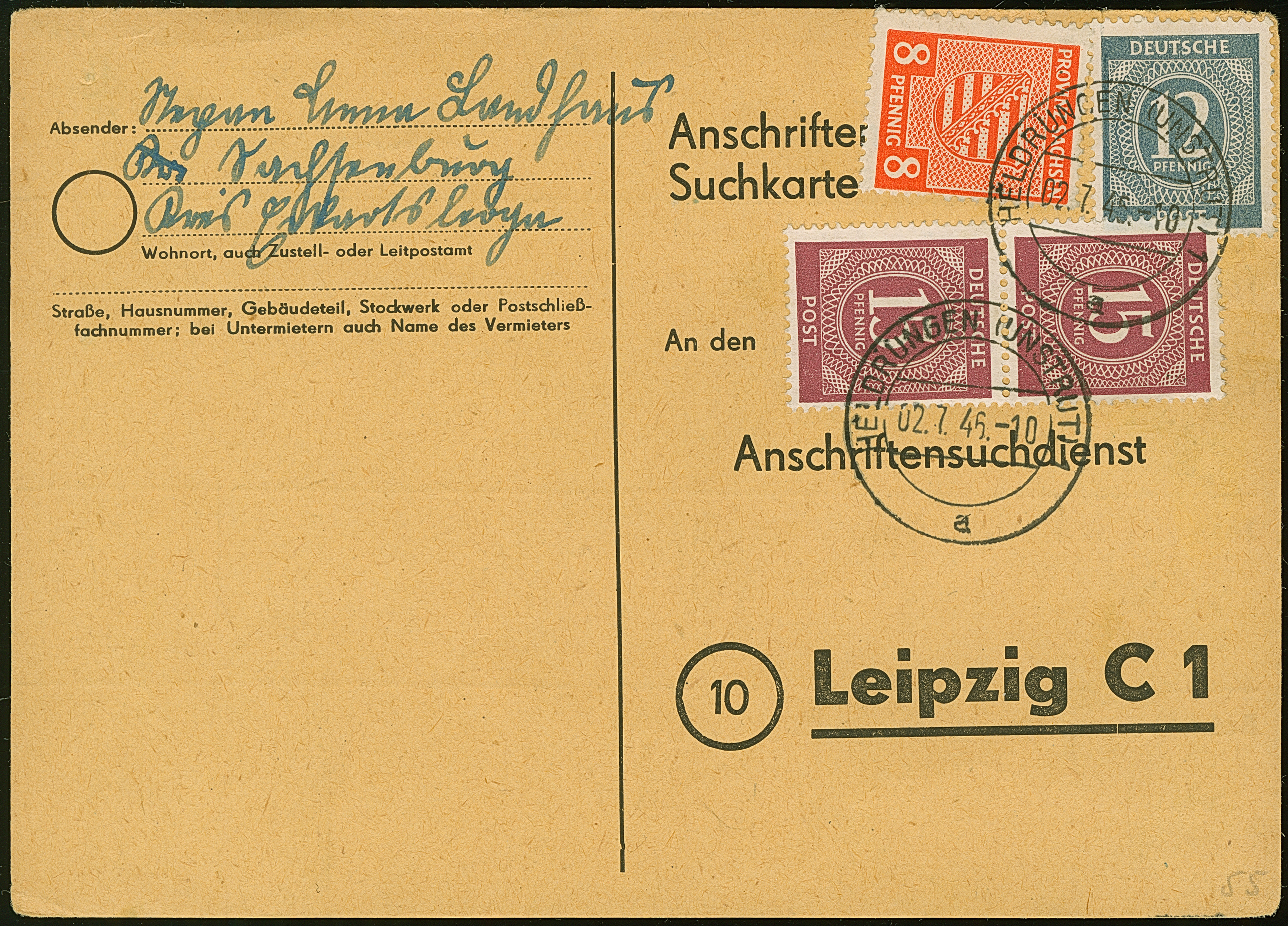 1945, Wappen 8 Pfg. in Mischfrankatur mit Ziffer 12 Pfg. grau und senkrechtes Paar 15 Pfg. lila mit Stempel “HELDRÜNGEN 2.7.46” als portogerechte Verwendung auf Anschriftensuchdienst-Karte nach Leipzig in guter Erhaltung