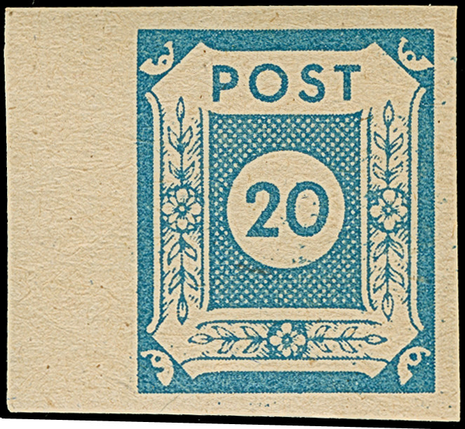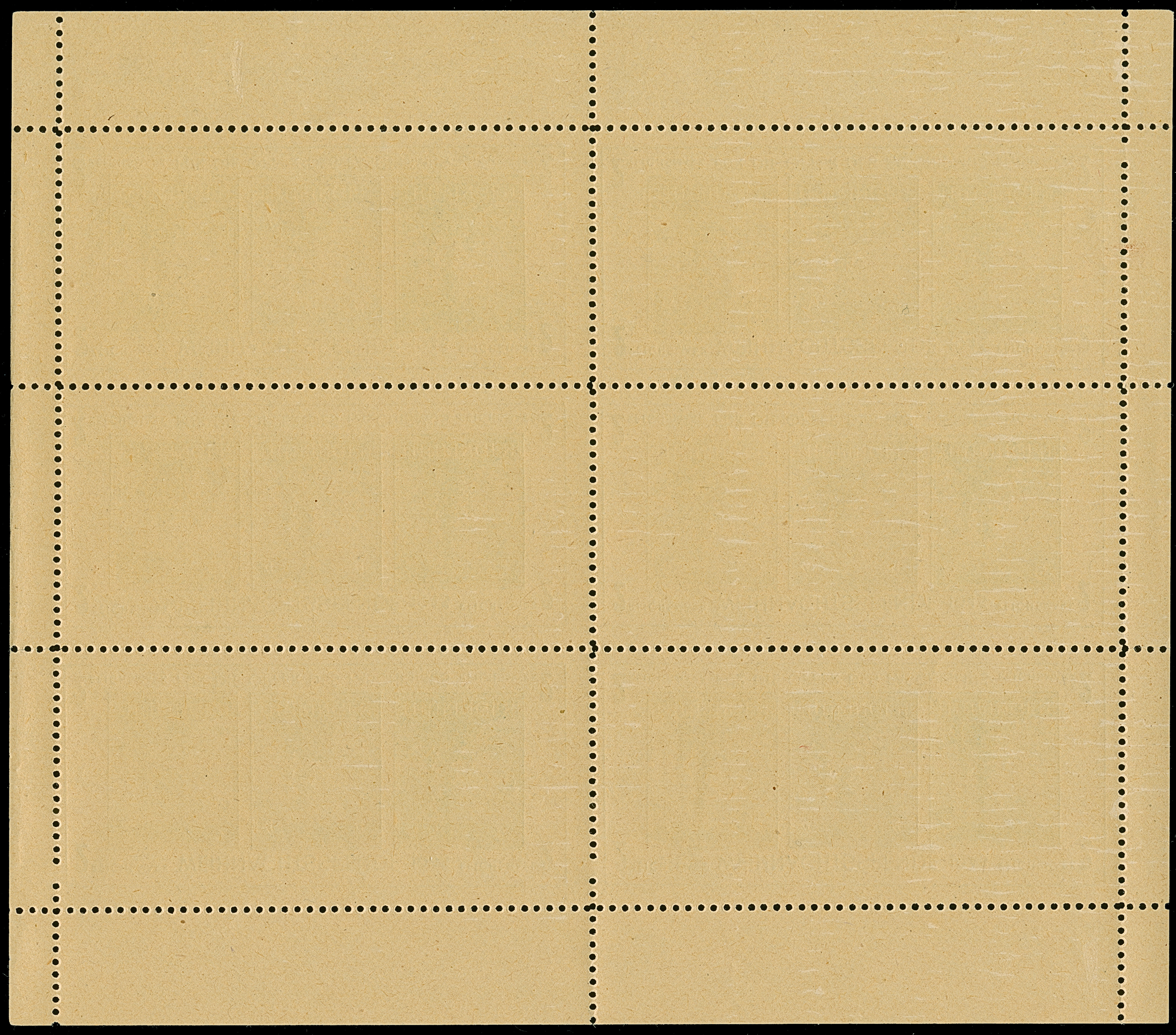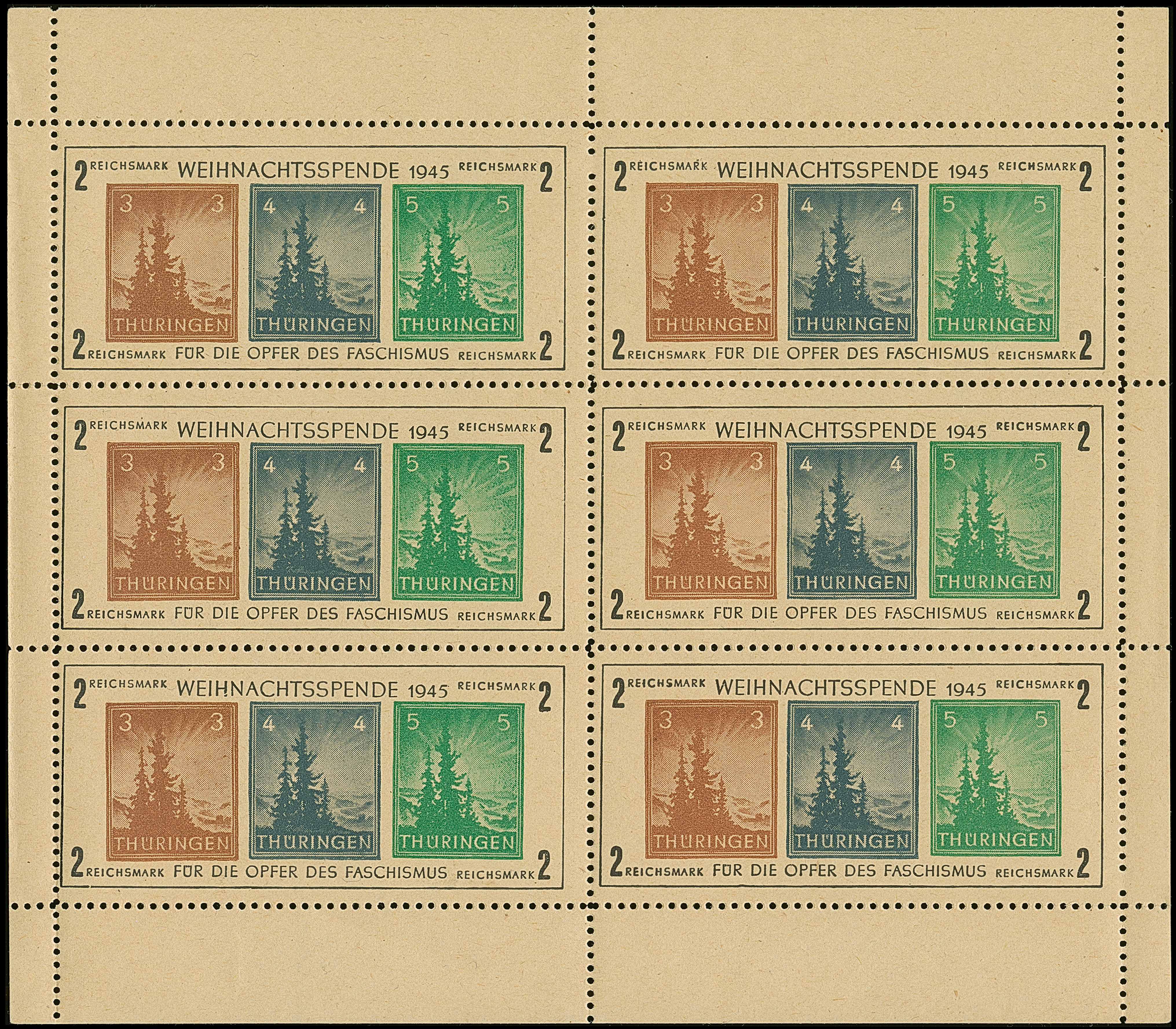1946, Bodenreform 6 Pfg. dunkelopalgrün auf sogen. Zigarettenpapier (Steuerpapier) mit Wasserzeichen “nach rechts liegend”, im 10er-Streifen der 3. und 4. waagerechten Bogenreihe mit Bogenrand links und rechts, dabei der linke Bogenrand sowie die Felder 21/22 und 31/32 allseits ungezähnt, Felder 23/33 links ungezähnt sowie dreiseitig mit doppelt versetzter sogen. “Diamantzähnung”. Die restlichen Marken normal gezähnt. Postfrisch und ungefaltet, tadellos. Eine der großen Seltenheiten der SBZ-Philatelie. Wir haben kein ähnliches Stück registriert.