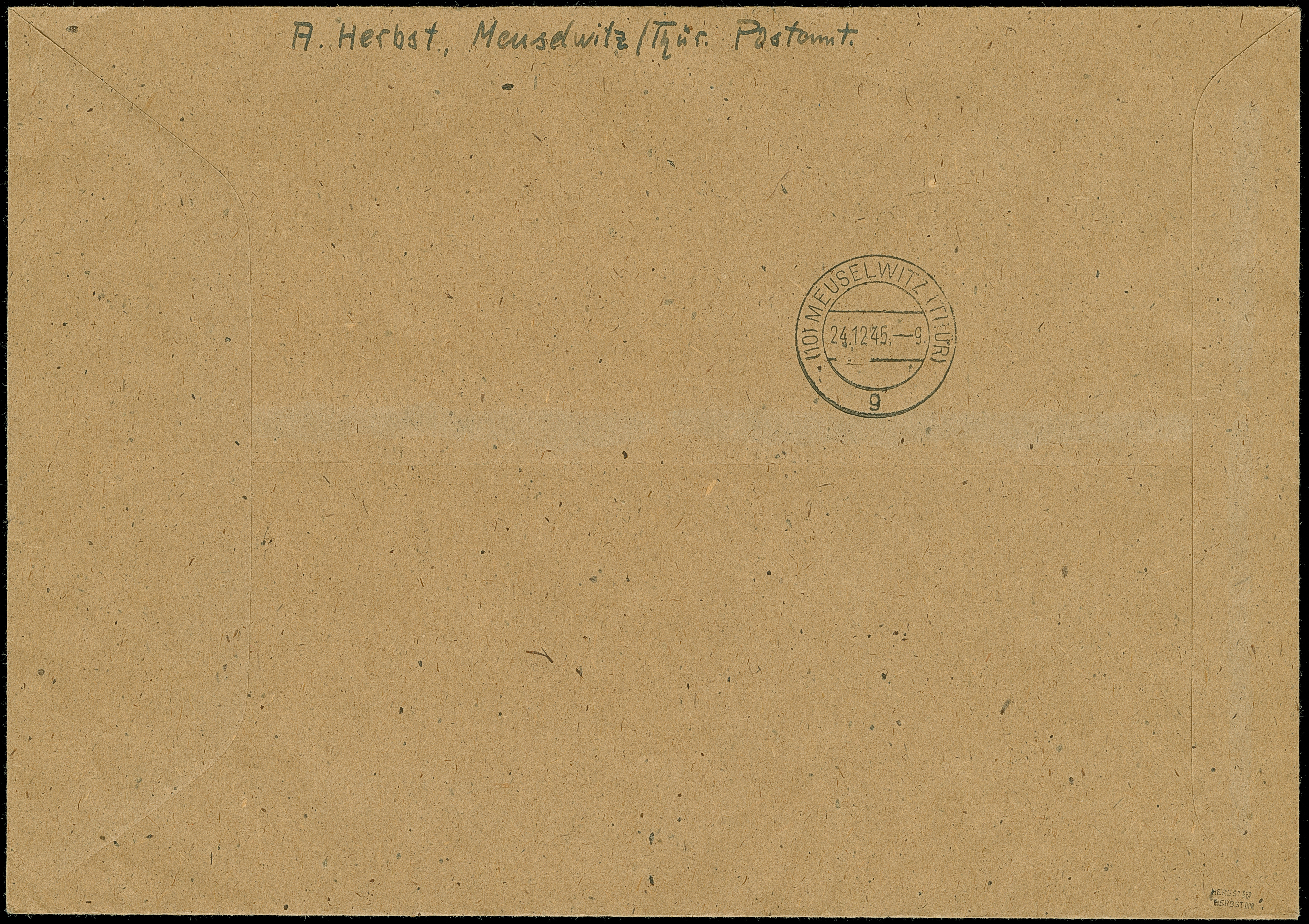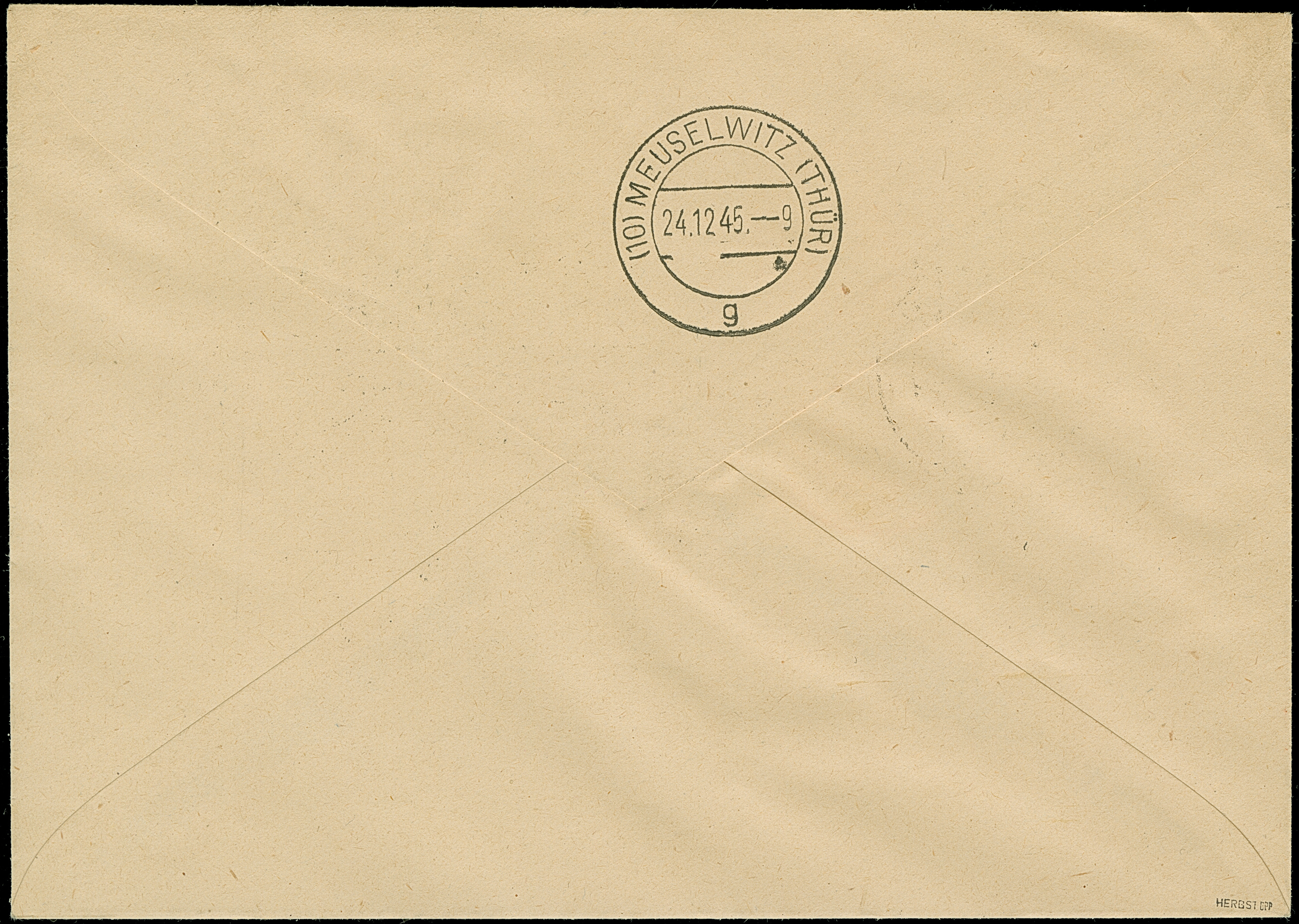 Antifa-Block auf gelblichgrauem Papier, linke untere Bogenecke mit Zufrankatur, portogerecht auf kleinem R-Brief von "GERA 1 b 19.12.45", nach Meuselwitz, mit Ankunftsstempel. Signiert Herbst BPP