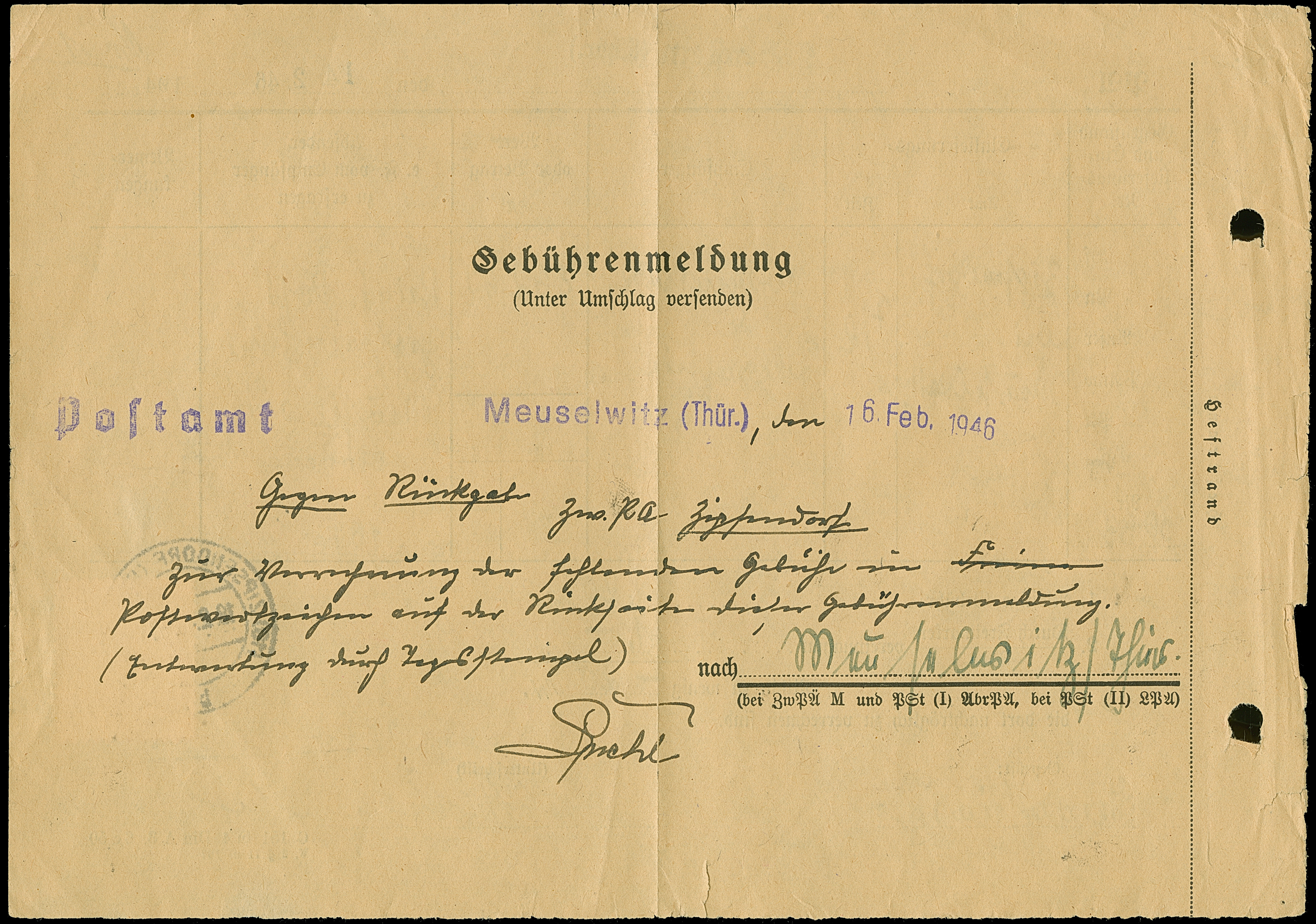 1945, Johann Wolfgang von Goethe 20 Pfg. gezähnt mit Stempel “ZIPSENDORF 18.2.46” auf Gebührenmeldung für eine unterfrankierter Postanweisung mit Eingangsstempel vom Postamt Meuselwitz. Das Formular mit senkrechter Faltung und Lochung links mit Randfehlern, ansonsten in guter Erhaltung. Eine außergewöhnliche und seltene Verwendung, ProFi hat kein weiteres Exemplar in dieser Art registriert