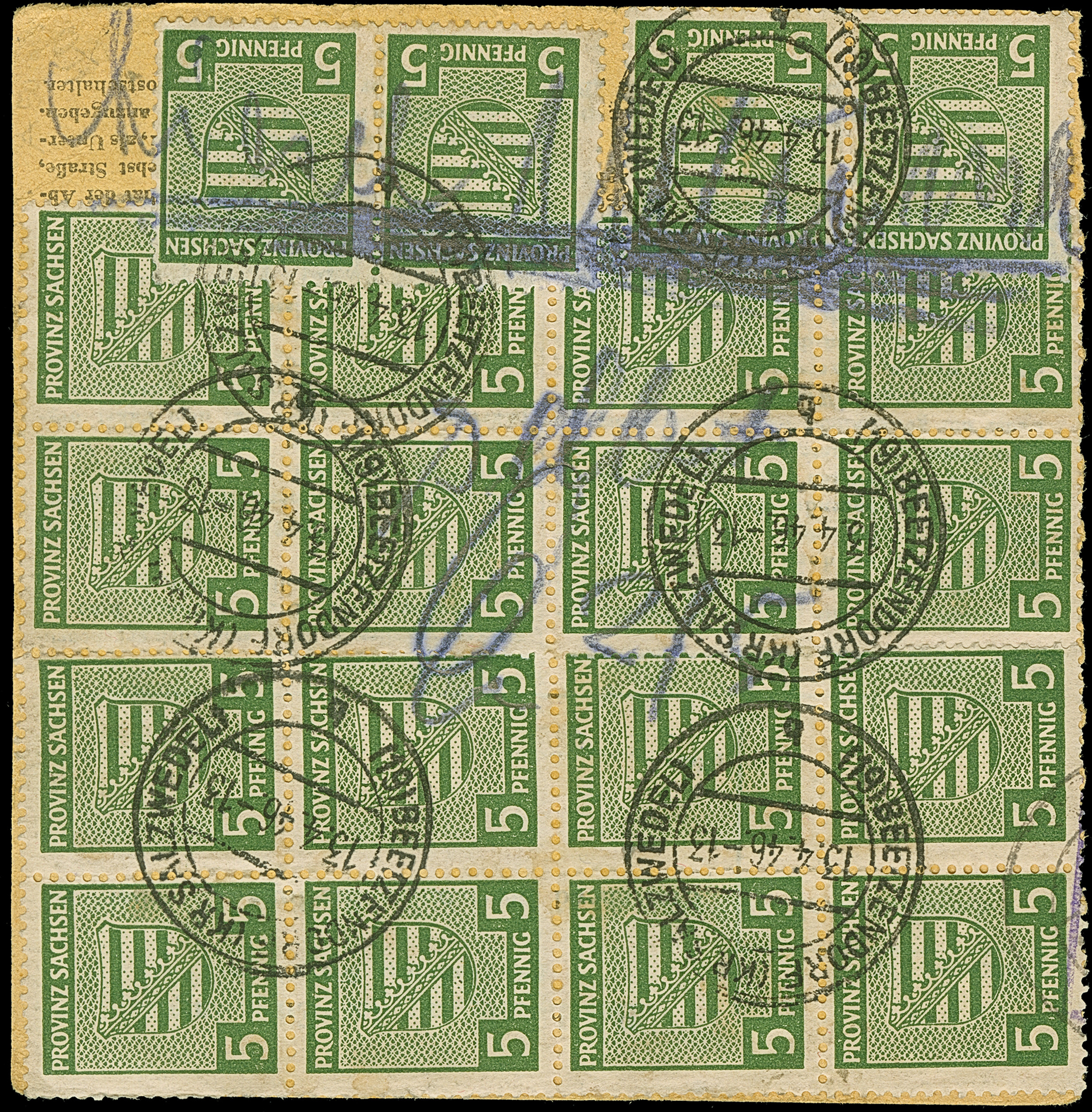 1945, Wappen 5 Pfg., 24 Stück mit Stempel “BEETZENDORF 13.4.46" als portogerechte Mehrfachfrankatur vorder- und rückseitig auf Paketkarte nach Leipzig. Die Marken zum Teil mit kleinen Zahnfehlern durch Randklebung bzw. rückseitig mit Bleistiftspuren, ansonsten in guter Erhaltung. Eine seltene “Massenfrankatur”