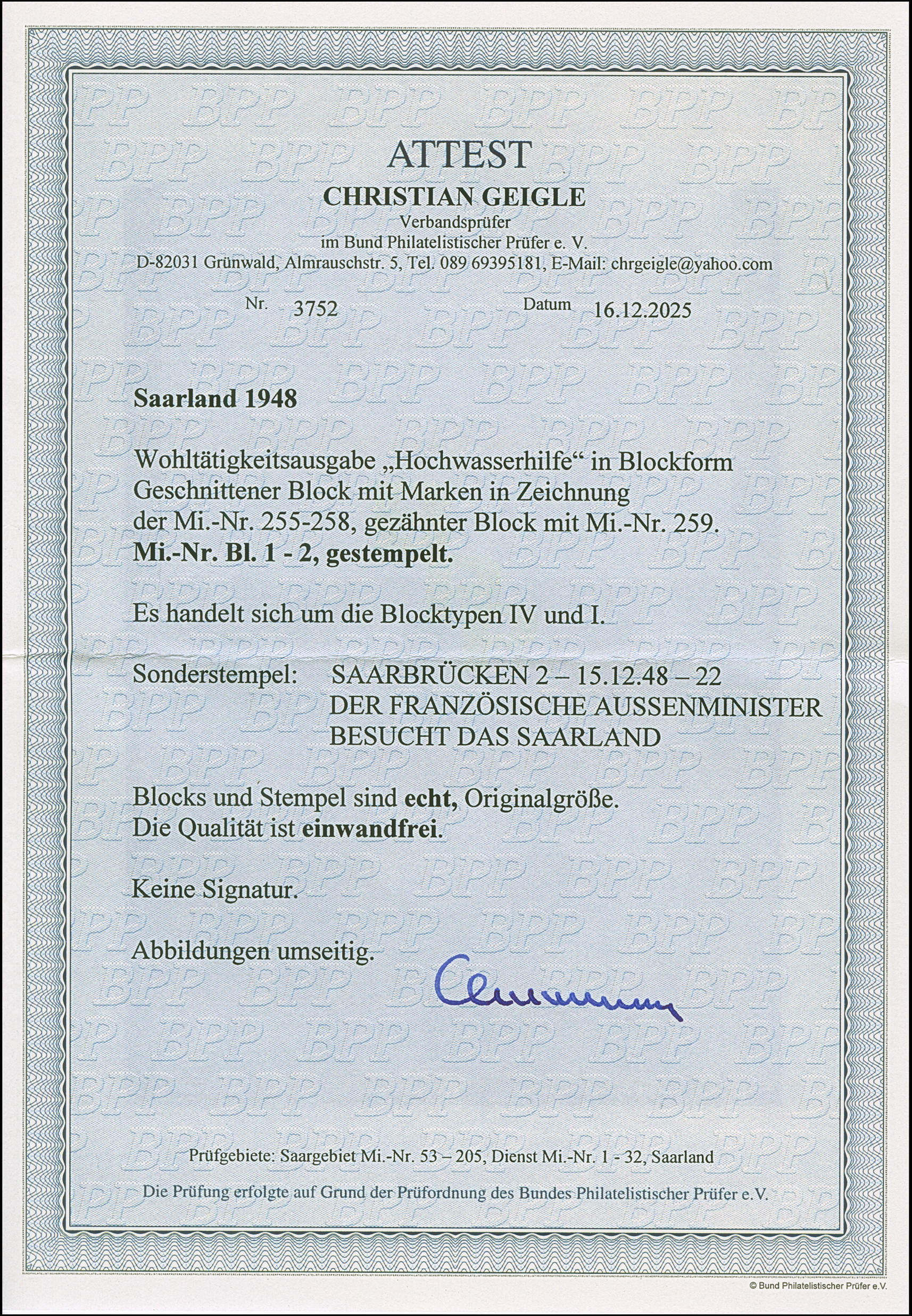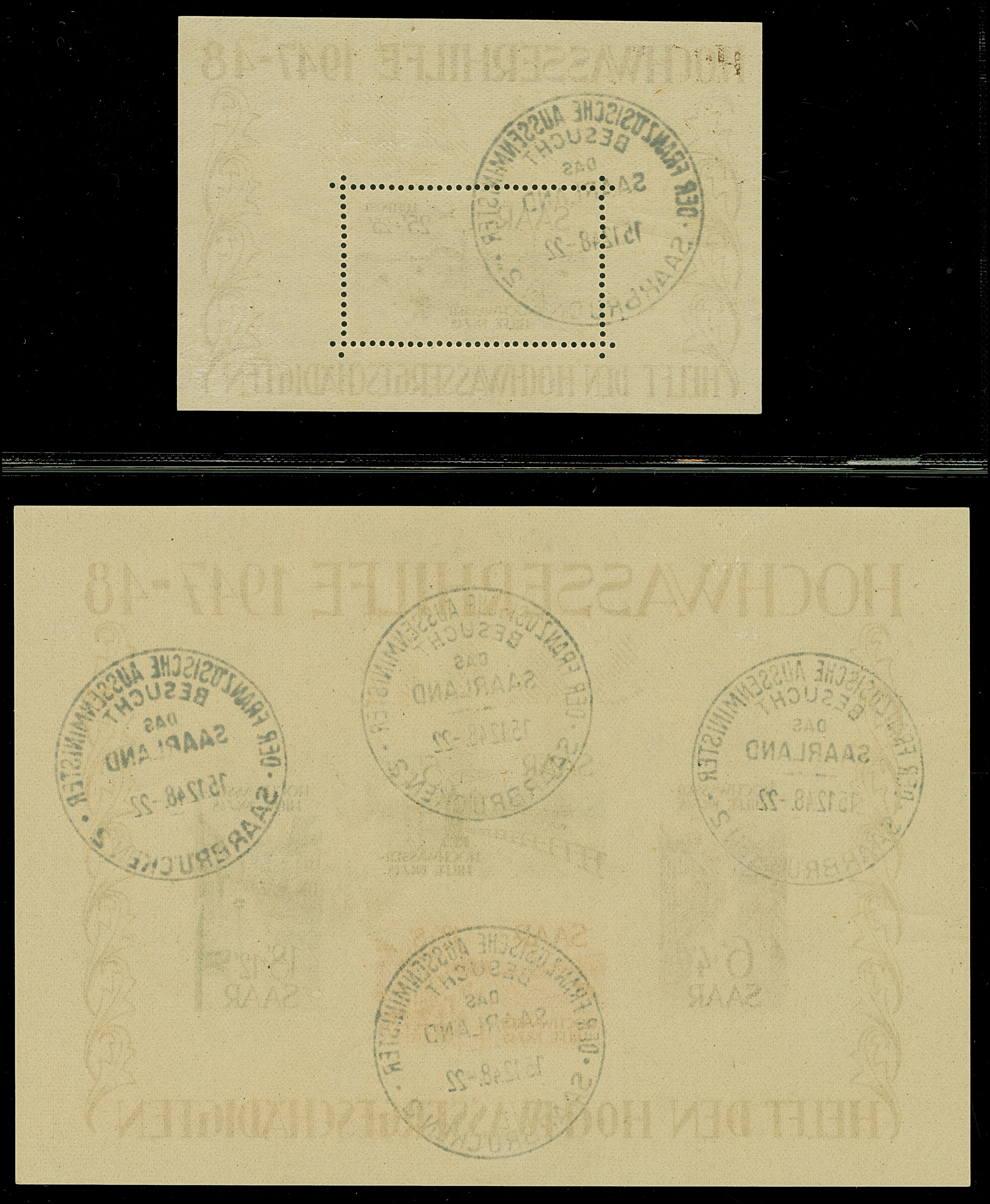 Hochwasser-Blockpaar mit Sonderstempel "DER FRANZÖSISCHE AUSSENMINISTER BESUCHT DAS SAARLAND 15. 12. 48." Tadellos. Fotoattest Geigle BPP (2025)