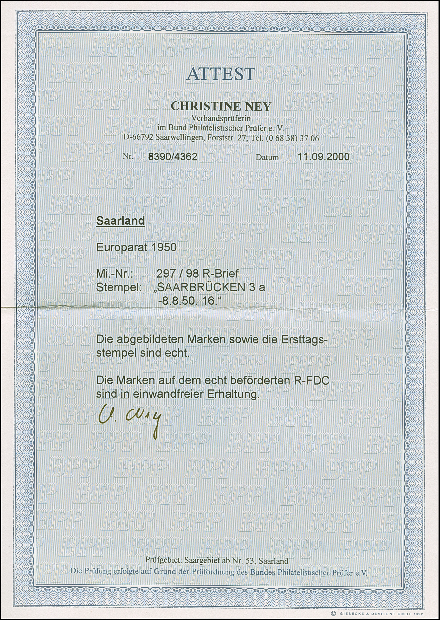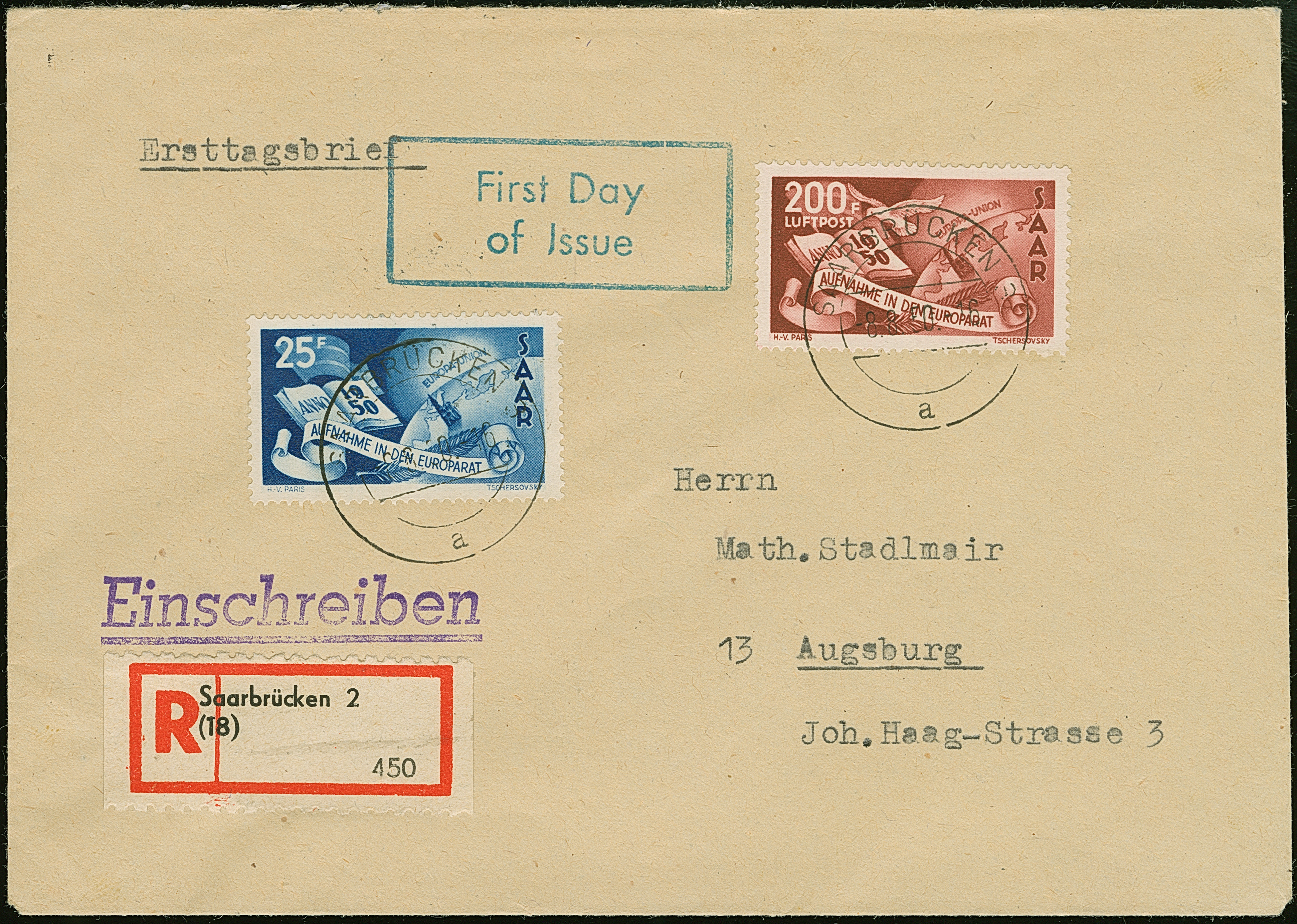 1950, Europarat 25 und 200 F., auf FDC von “SAARBRÜCKEN 3 8.8.50” nach Augsburg mit Ankunftsstempel, einwandfrei, Fotoattest Ney BPP (2000)