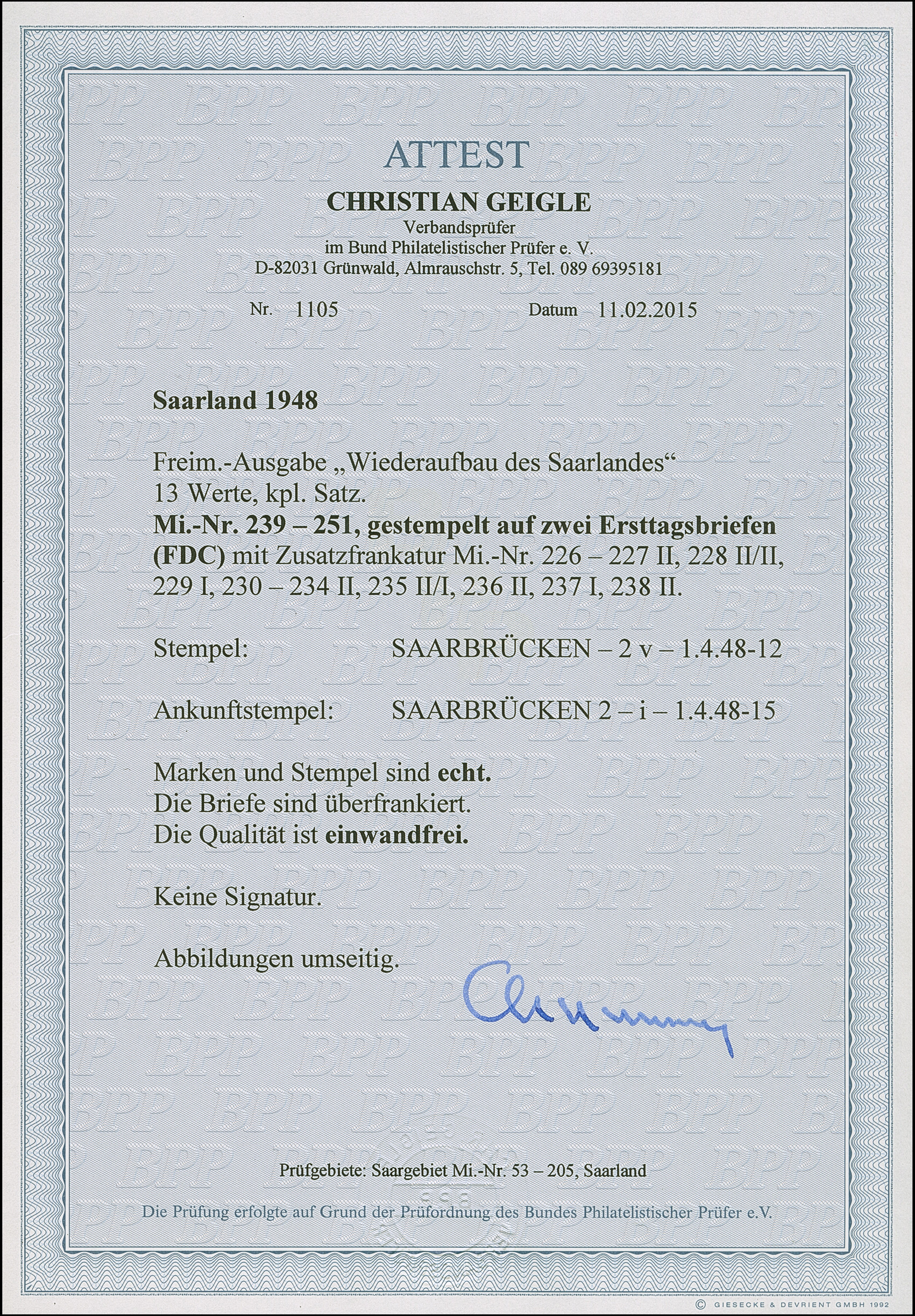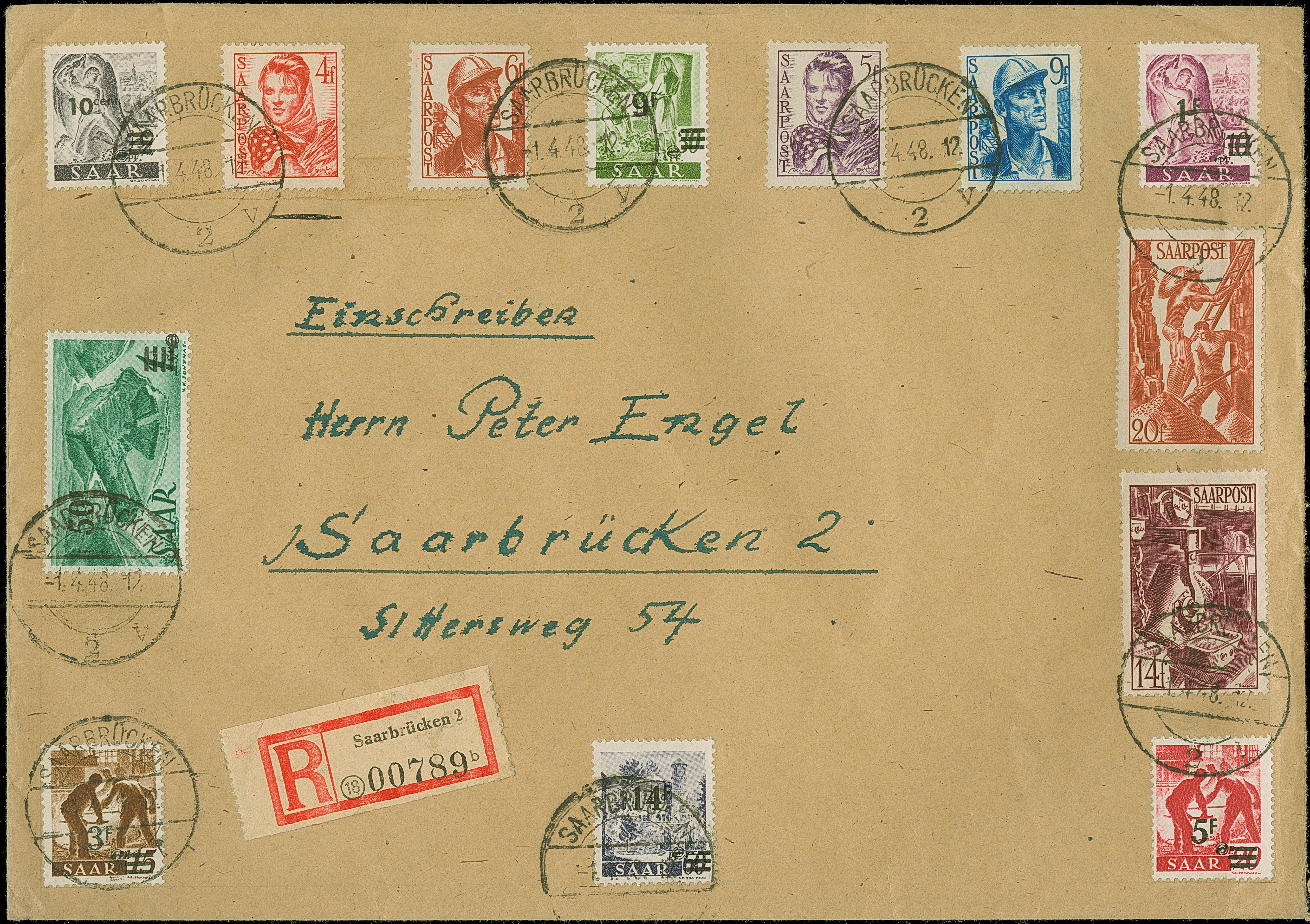 1948, Wiederaufbau des Saarlandes 10 C. – 50 Fr. kpl. auf zwei überfrankierten R-Ortbrief-FDC von „SAARBRÜCKEN 1.4.48“ je mit Zufrankatur und Ankunftsstempel, Umschläge mit leichten Beförderungsspuren, sonst tadellos, Fotoattest Geigle BPP (2015) ex Axel Kruse