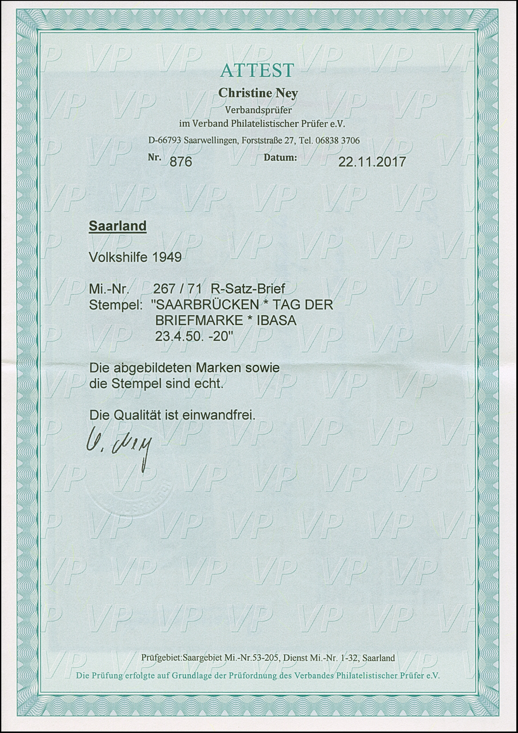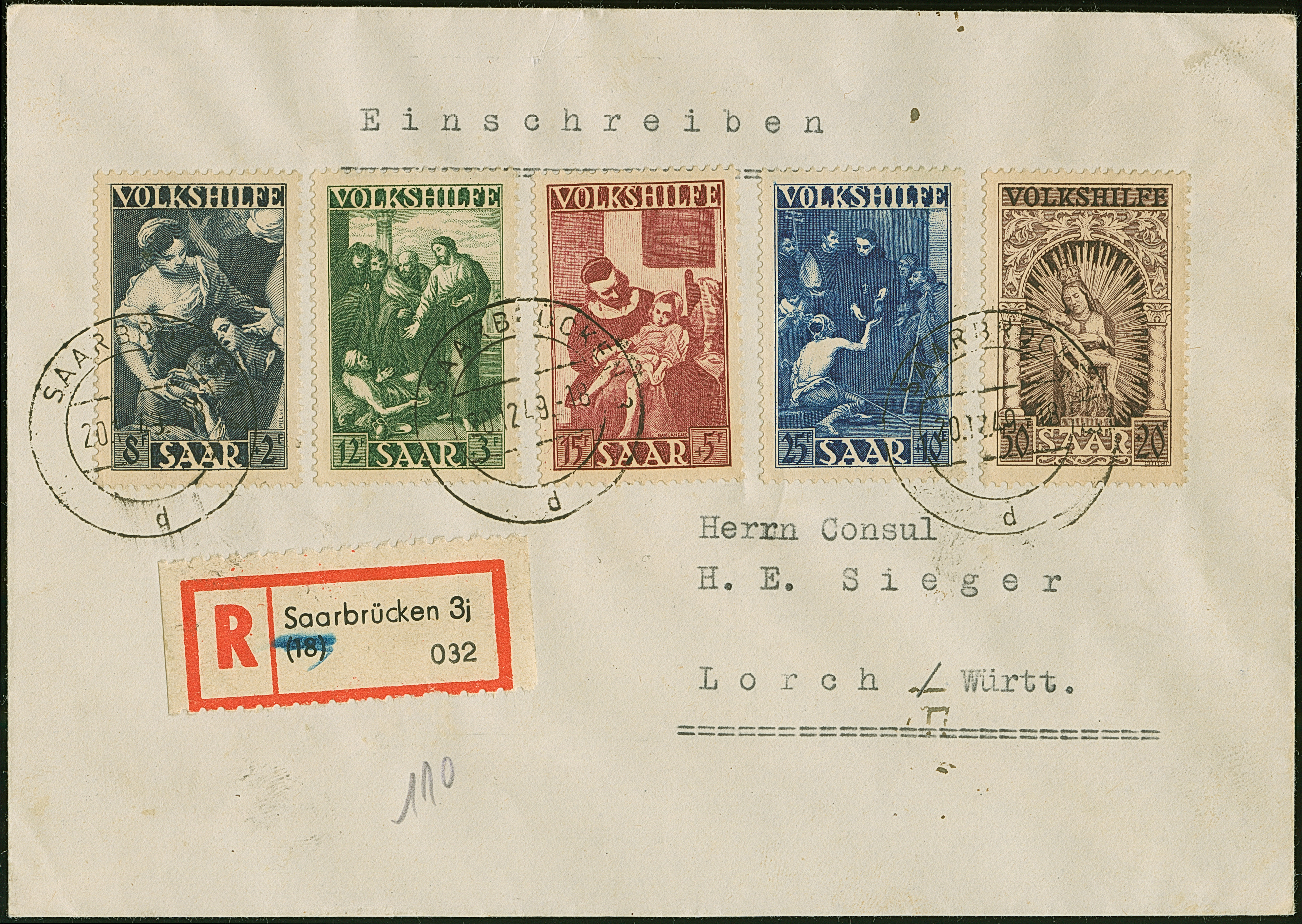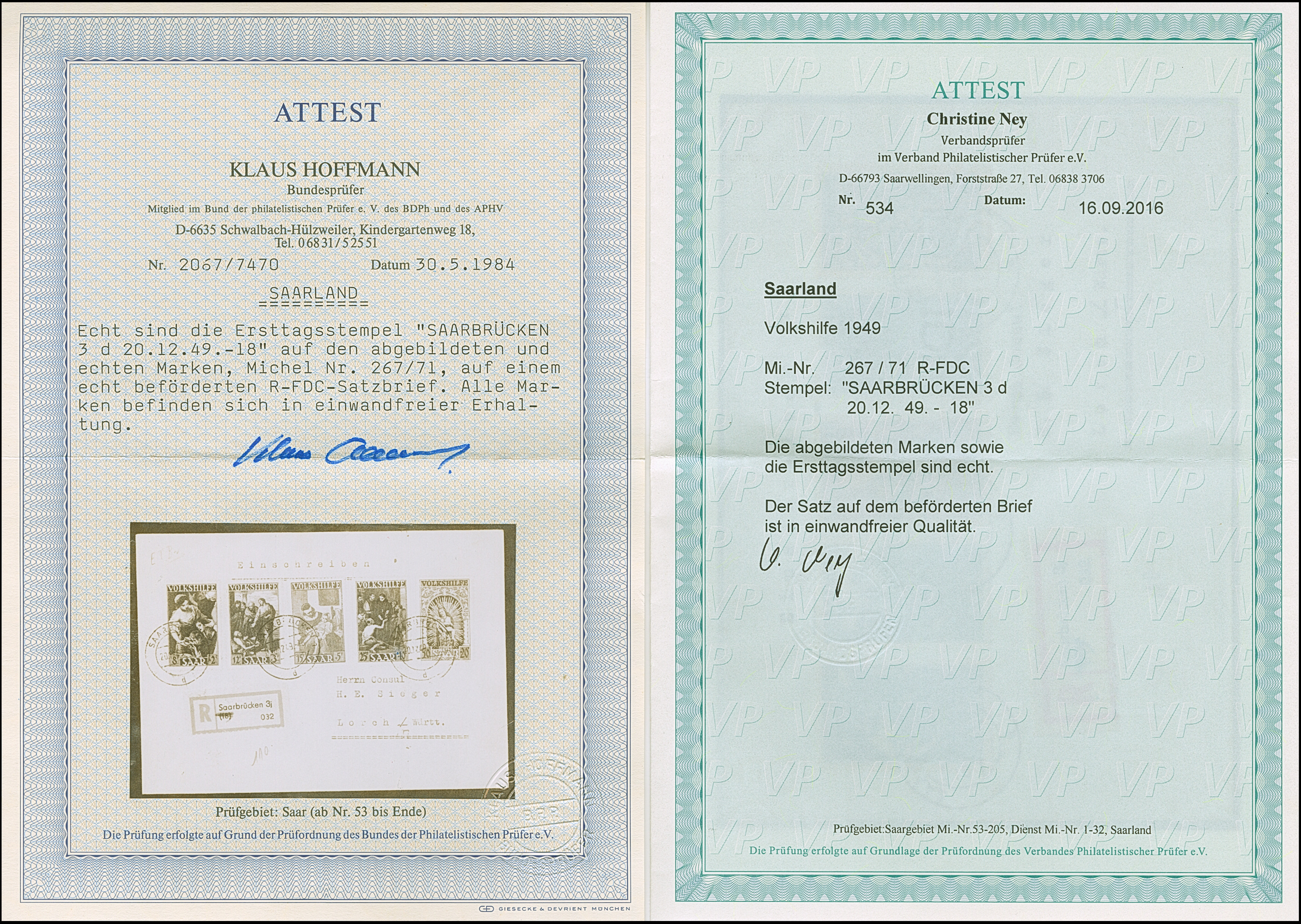 1949, Volkshilfe 8-50 Fr. kpl. auf R-Fernbrief FDC von “SAARBRÜCKEN 3 20.12.49” an Sieger/Lorch mit Ankunftsstempel, Marken tadellos, Umschlag mit üblichen Beförderungsspuren, Fotoatteste Hoffmann BPP (1984) und Ney (2016)