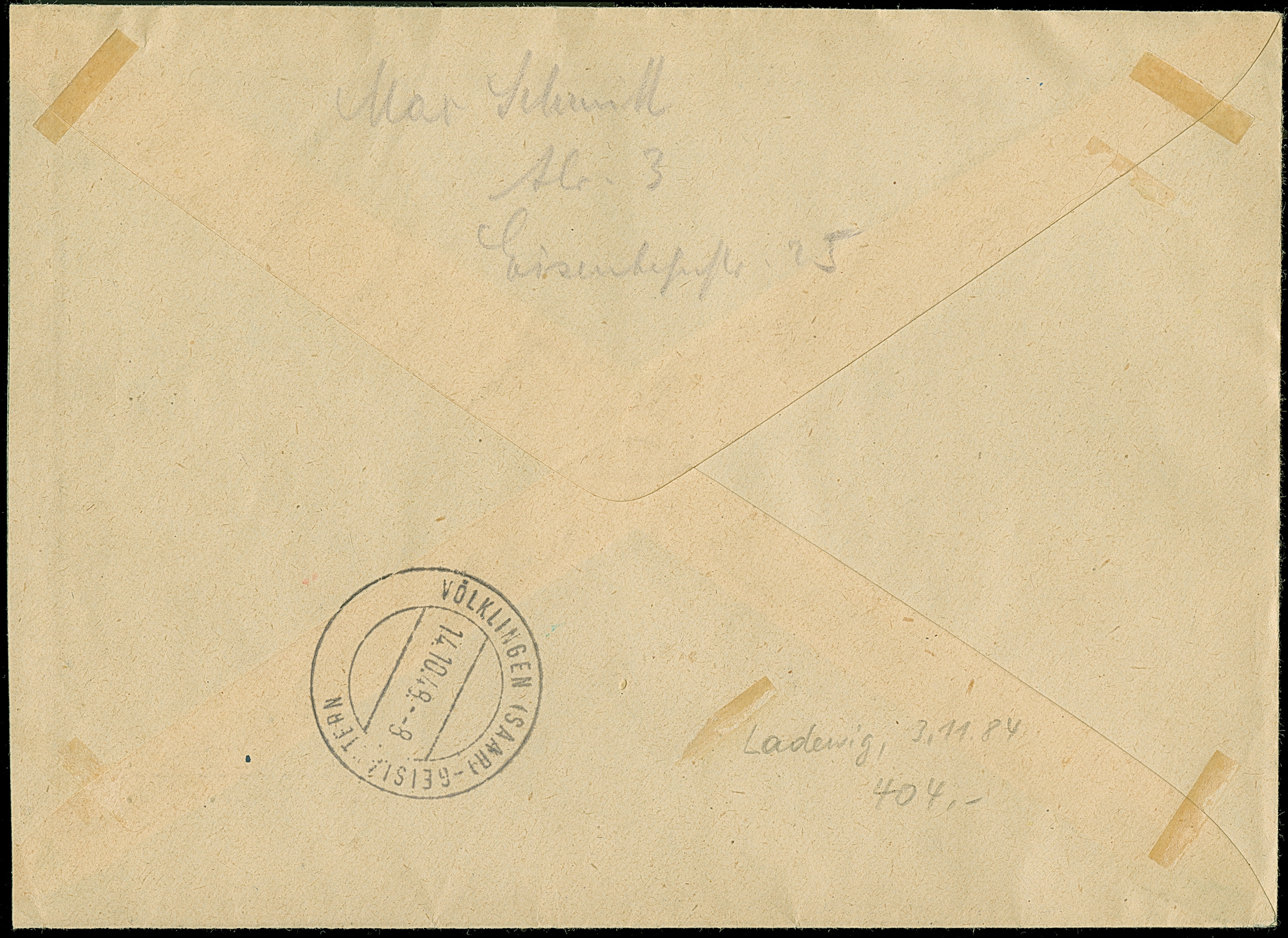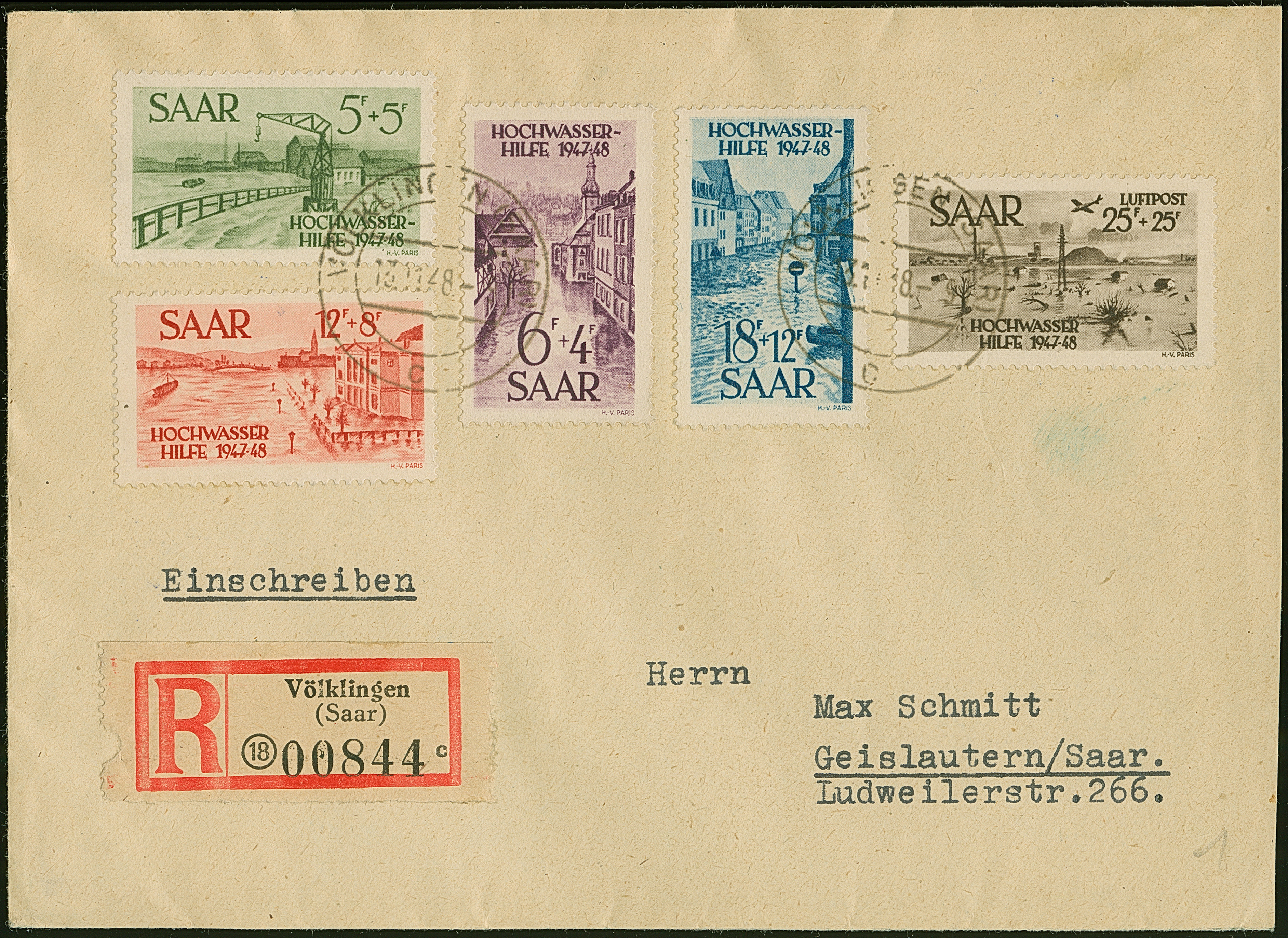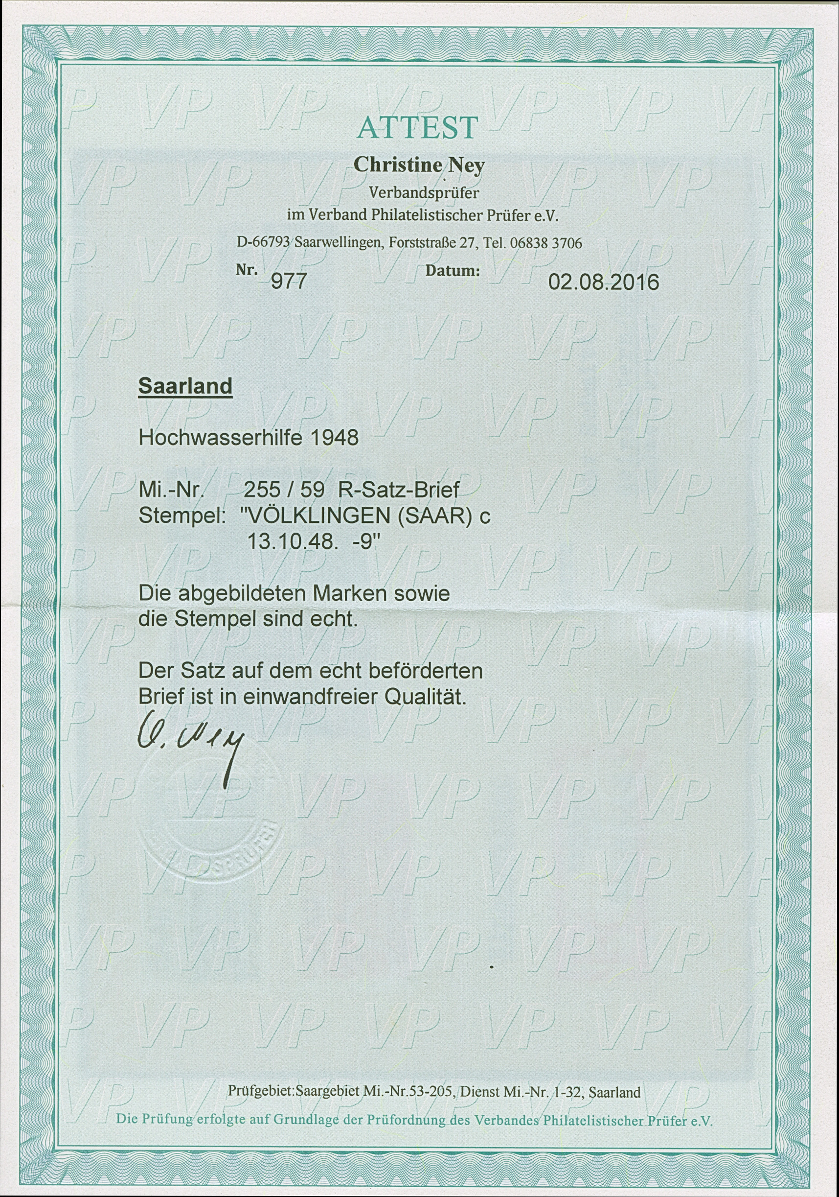 1948, Hochwasserhilfe 5-25 Fr. kpl. auf R-Ortsbrief von “VÖLKLINGEN (SAAR) c 13.10.48” nach Geislautern mit Ankunftsstempel, einwandfrei, Fotoattest Ney BPP (2016)