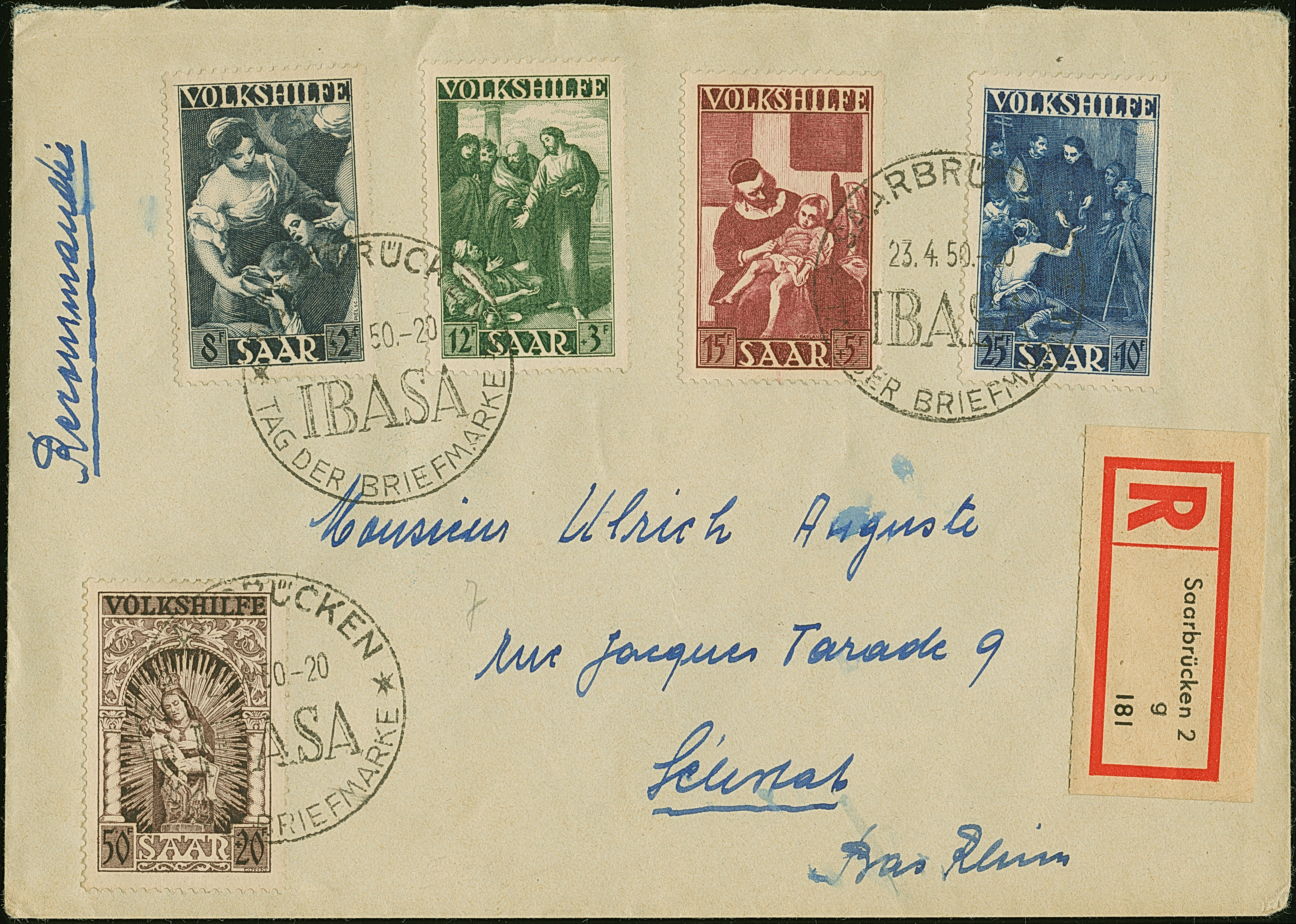 1949, Volkshilfe 8-50 Fr. sauber mit Stempel der Ausstellung “IBASA 23.4.50” nach Straßburg ohne Ankunftsstempel, Marken tadellos, Umschlag mit Beförderungsspuren, sign. Hoffmann BPP sowie Fotoattest Ney (2017)
