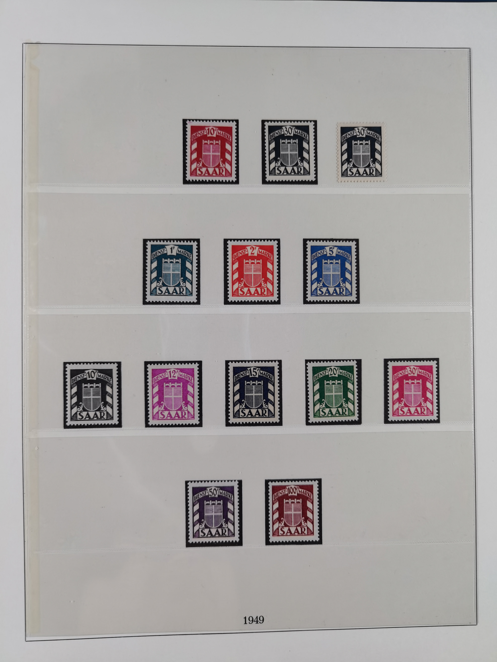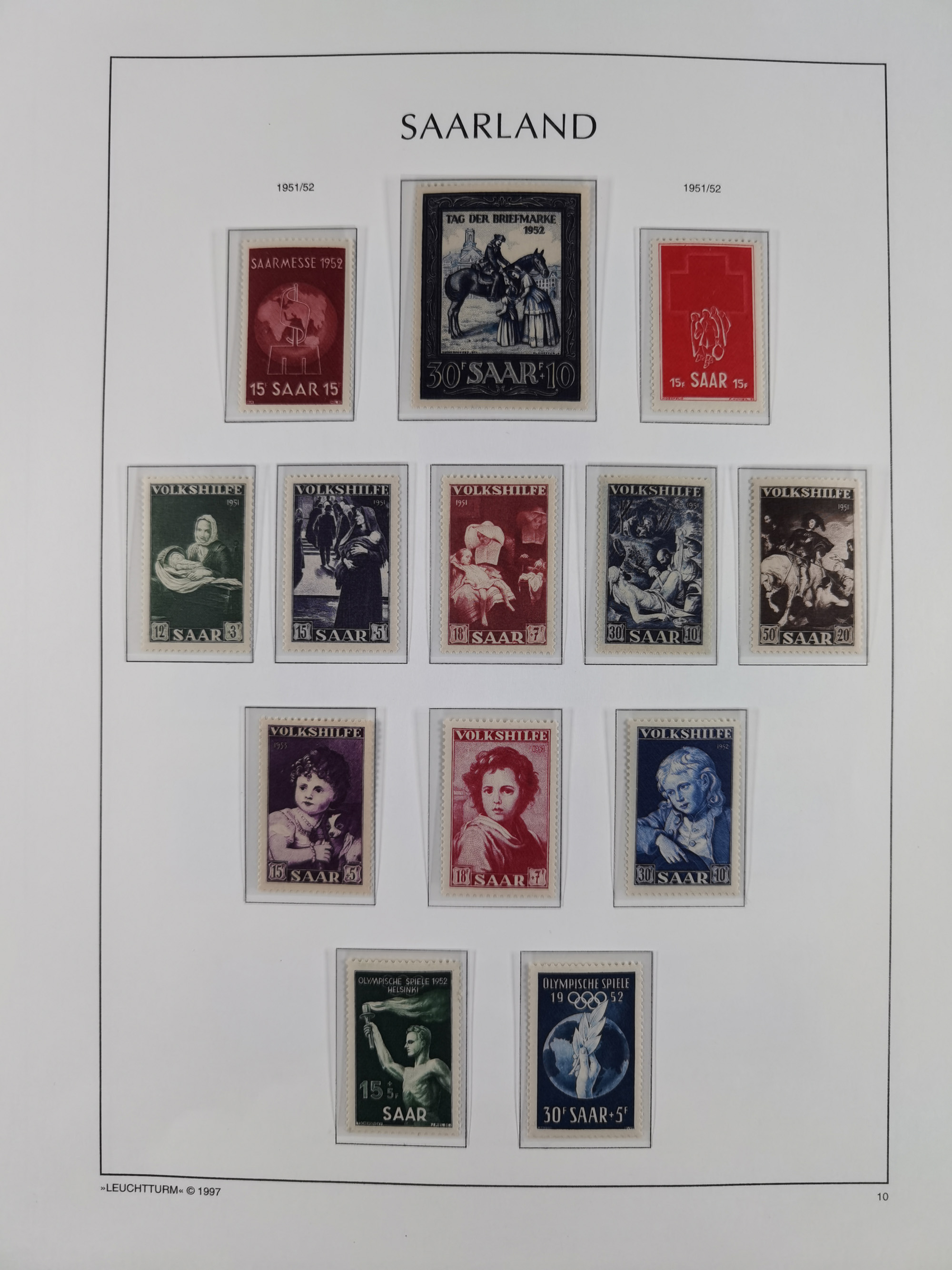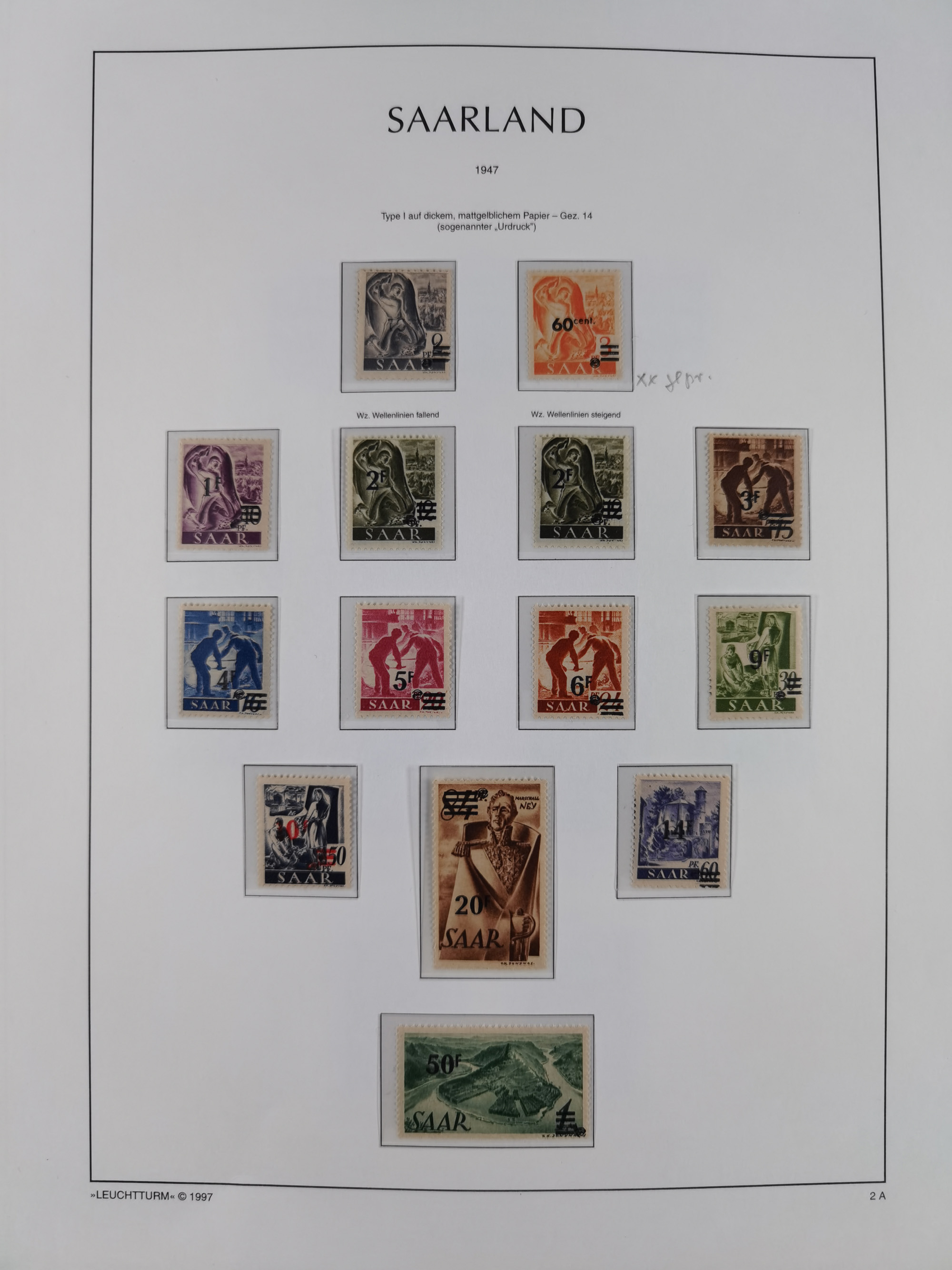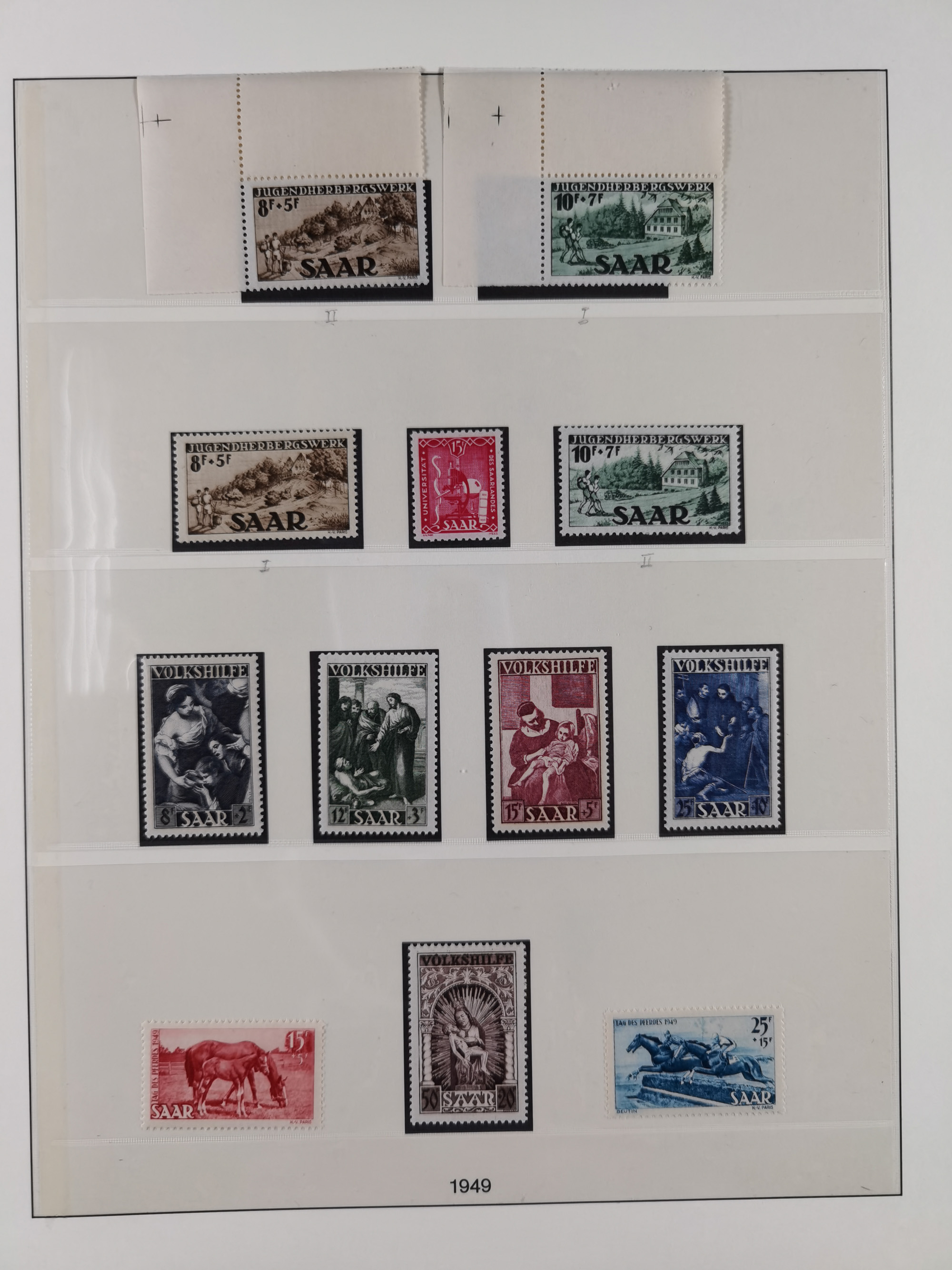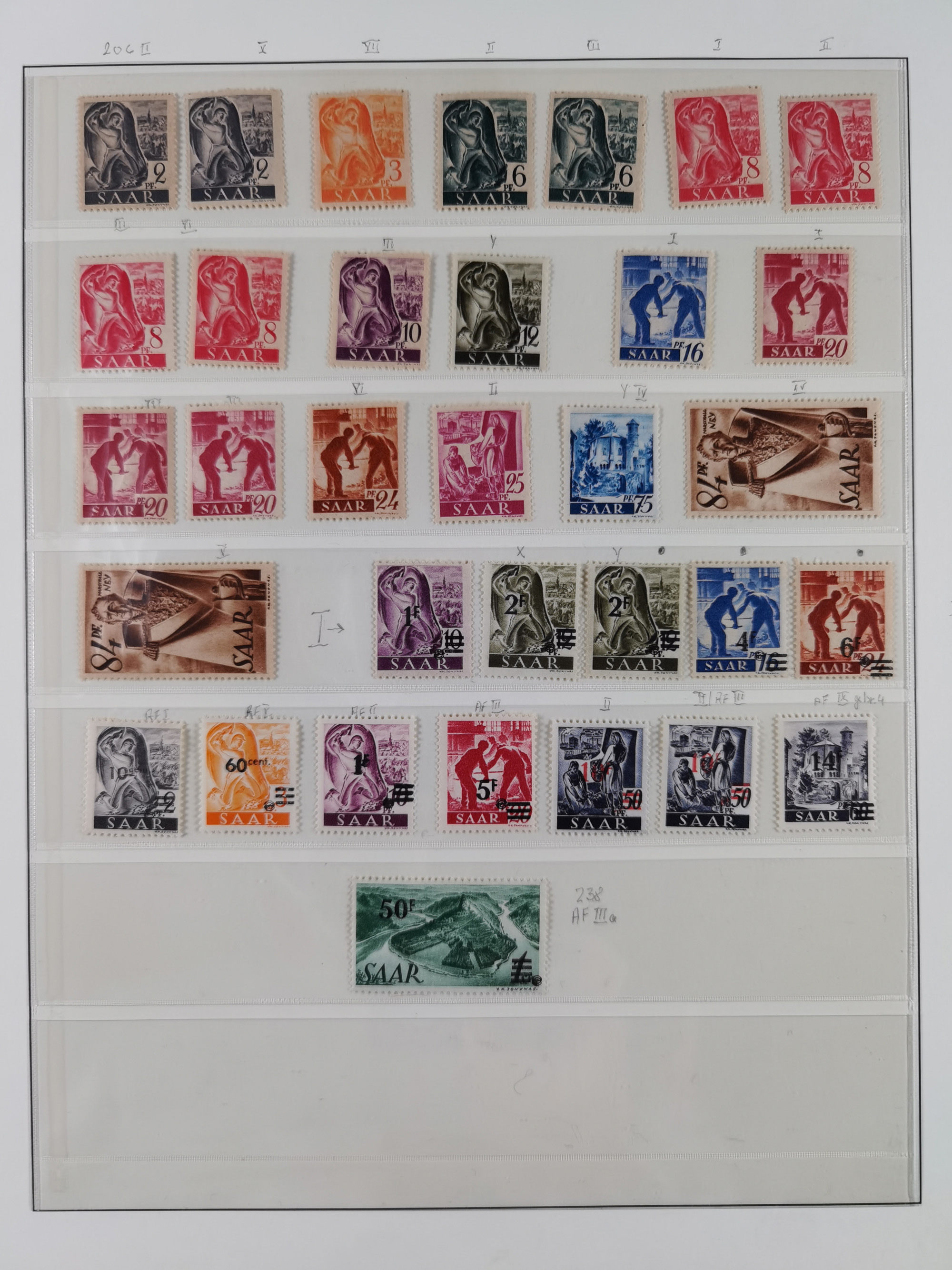 1920/59, in den Hauptnummern stark überkomplette fast ausnahmslos postfrische Sammlung inkl. Dienstmarken, dabei Mi.-Nr. 1-17, 1-17IA inkl. Farben mit 14aIA, Type II 7 Werte kpl., zusätzlich diese auch mit PF A (ohne 2aIIA), 1-17III mit 16IIIOR, 18-31 mit 30L und 31L, A31-C31 (B31 ungebraucht), ferner alle Volkshilfen inkl. Madonna mit Bogenrand, sowie Saarland mit unsigniertem Urdrucksatz, Hochwasserhilfe-Blockspaar, einigen Klbg., zusätzlich gestempelt 380-83 und 409-28 OR auf Briefstücken und MH1 postfrisch/ungebraucht (etwas fleckig), gute Erhaltung, 23 (Kurz-)Befunde und Atteste Ney, Geigle, Burger und Bernhard BPP, in zwei Vordruckalben