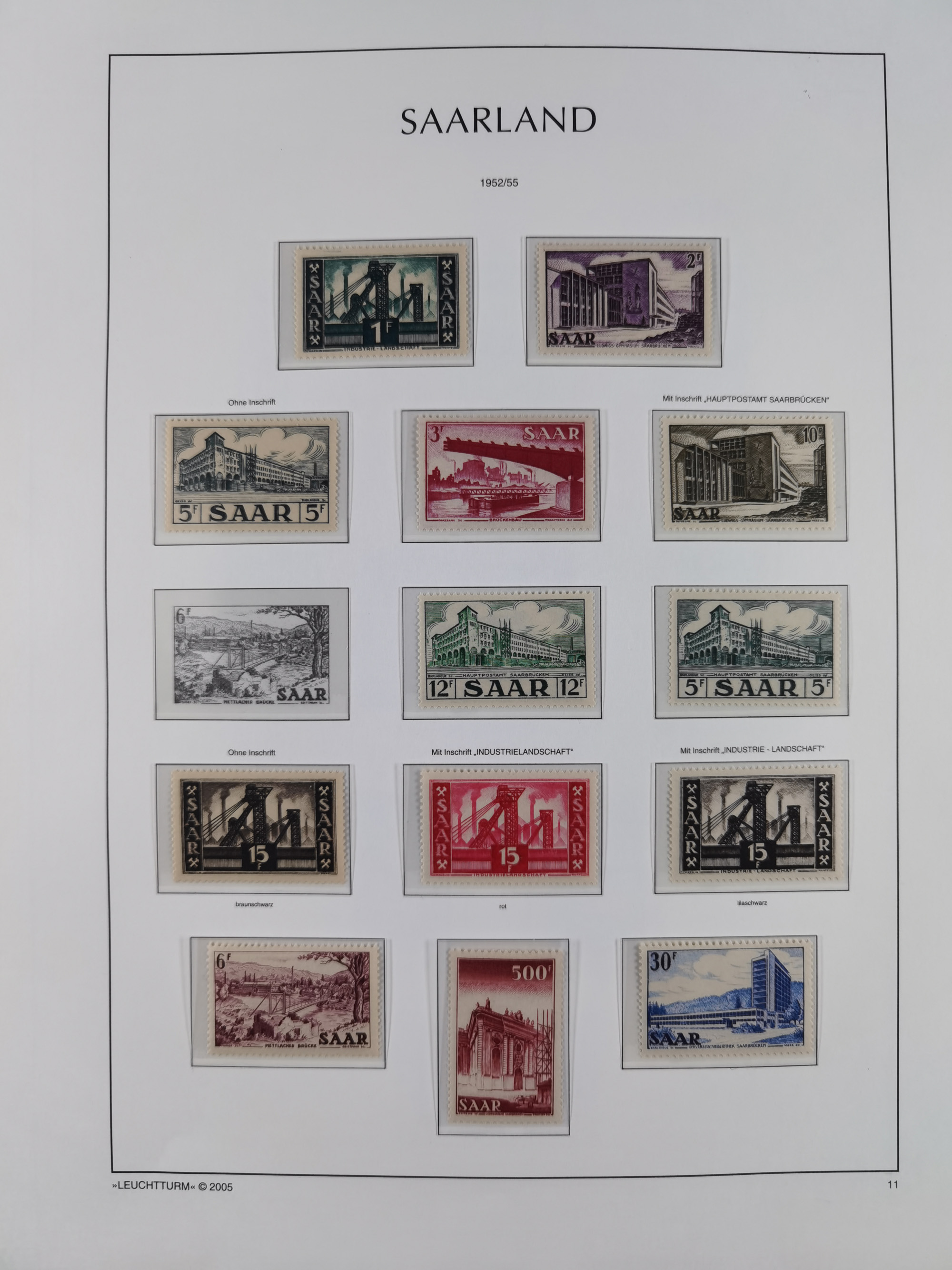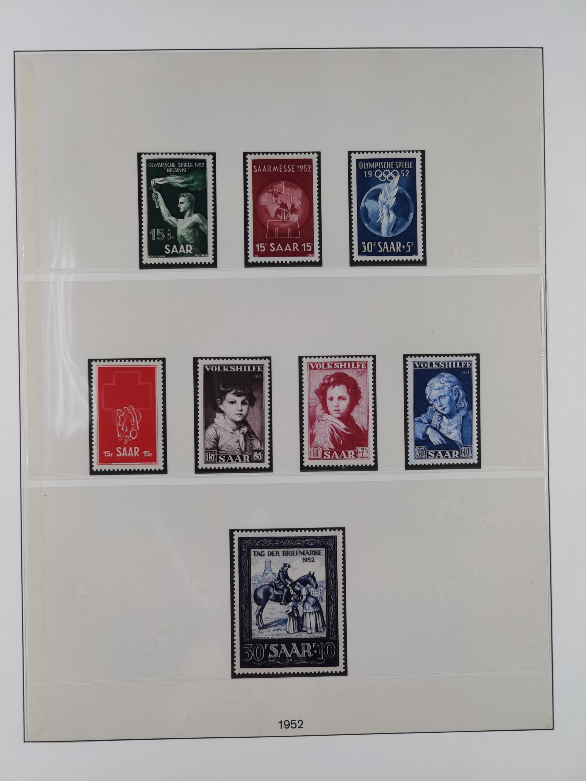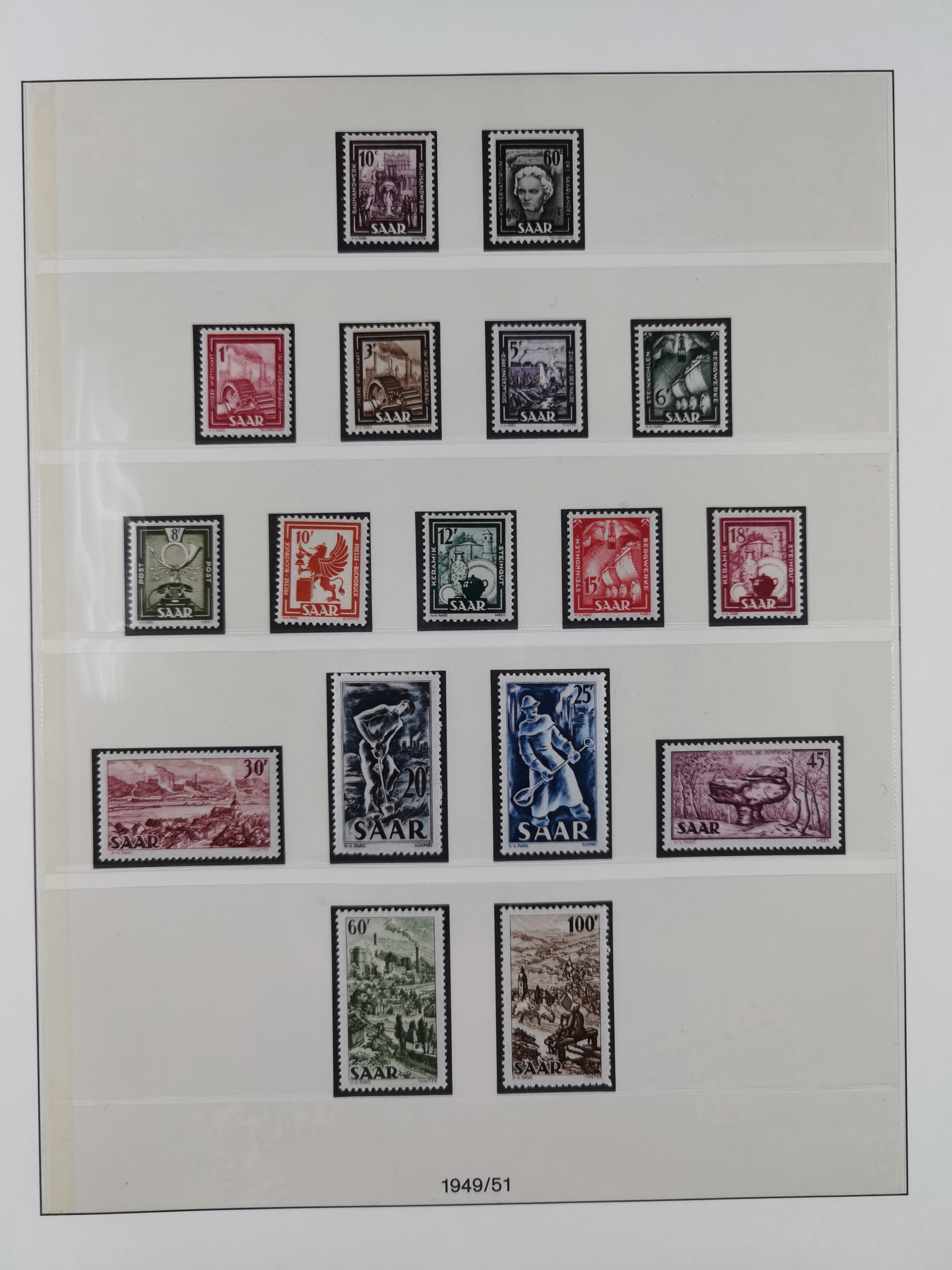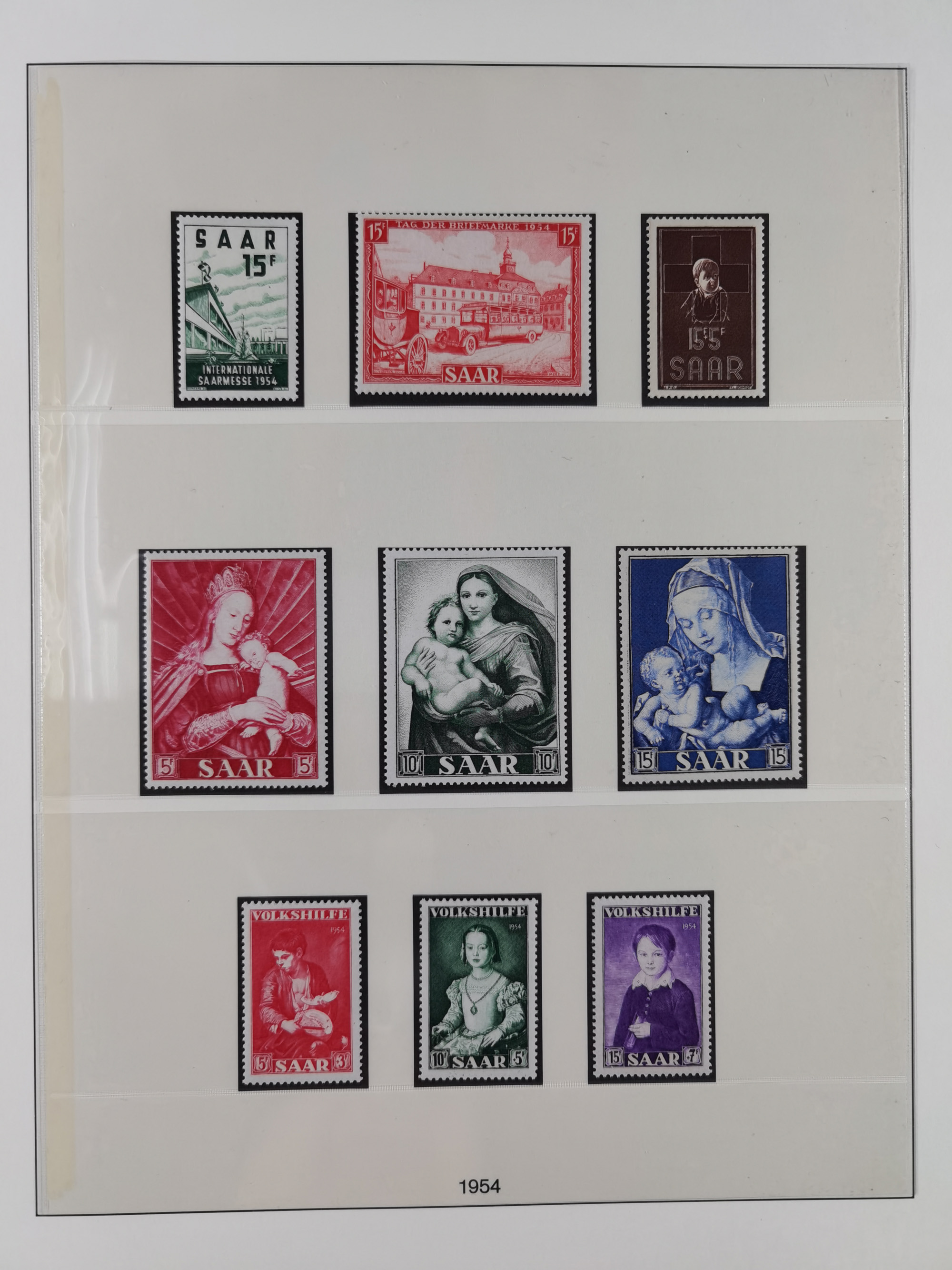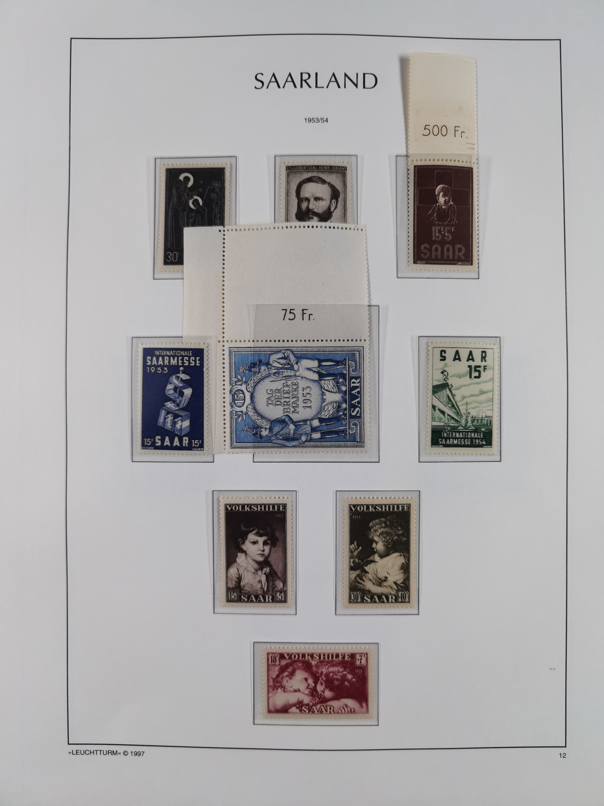 1920/59, in den Hauptnummern stark überkomplette fast ausnahmslos postfrische Sammlung inkl. Dienstmarken, dabei Mi.-Nr. 1-17, 1-17IA inkl. Farben mit 14aIA, Type II 7 Werte kpl., zusätzlich diese auch mit PF A (ohne 2aIIA), 1-17III mit 16IIIOR, 18-31 mit 30L und 31L, A31-C31 (B31 ungebraucht), ferner alle Volkshilfen inkl. Madonna mit Bogenrand, sowie Saarland mit unsigniertem Urdrucksatz, Hochwasserhilfe-Blockspaar, einigen Klbg., zusätzlich gestempelt 380-83 und 409-28 OR auf Briefstücken und MH1 postfrisch/ungebraucht (etwas fleckig), gute Erhaltung, 23 (Kurz-)Befunde und Atteste Ney, Geigle, Burger und Bernhard BPP, in zwei Vordruckalben