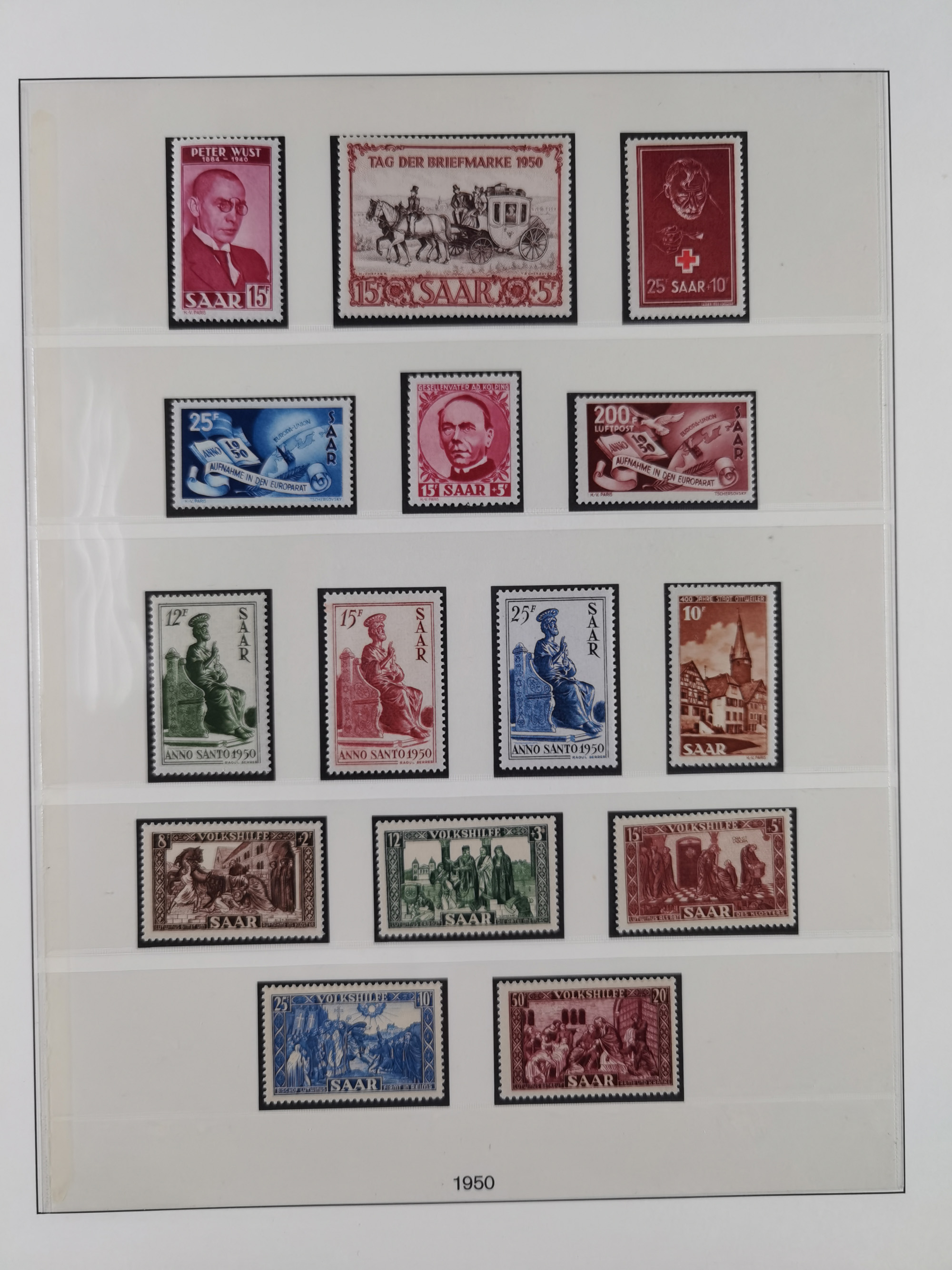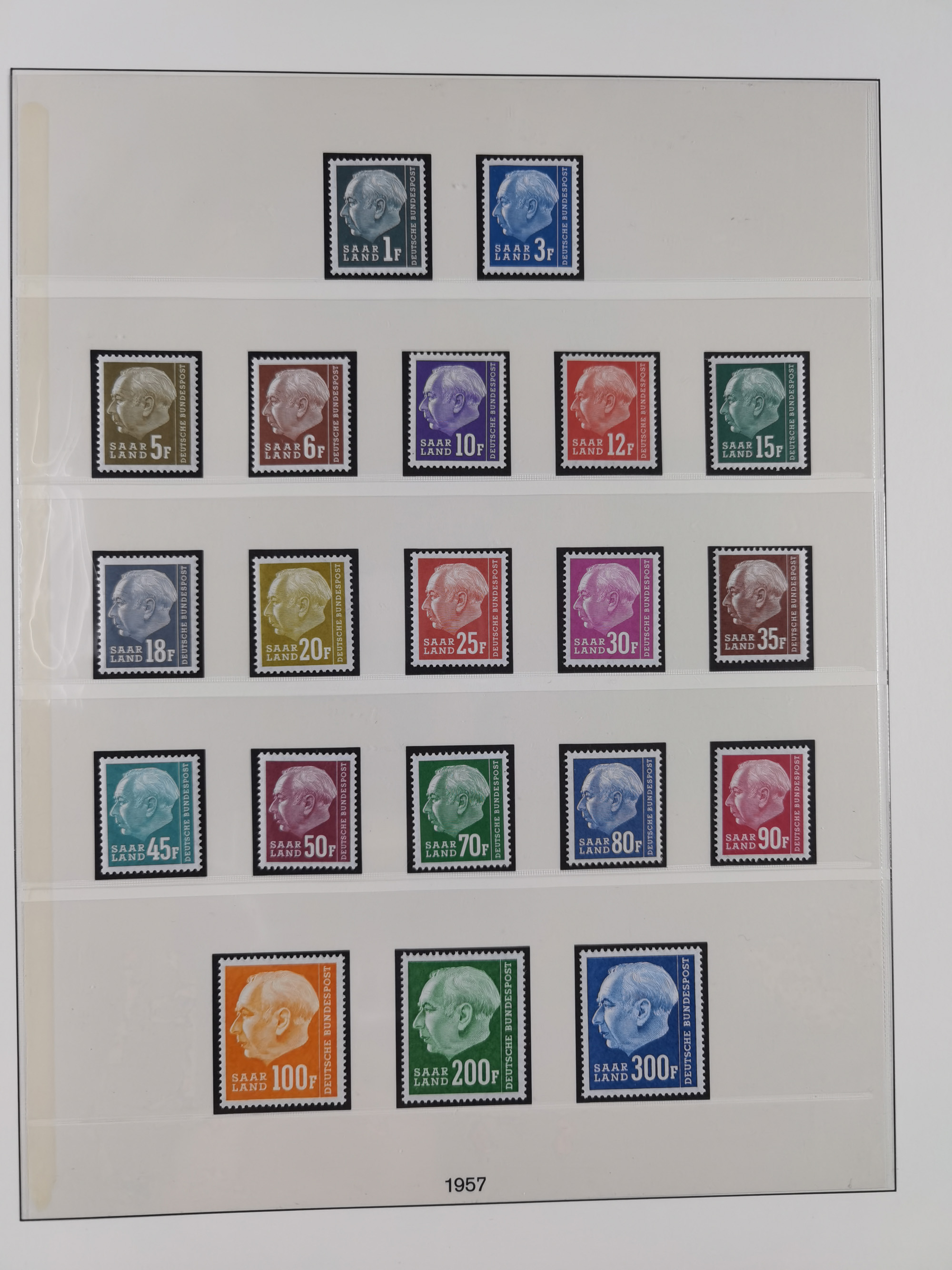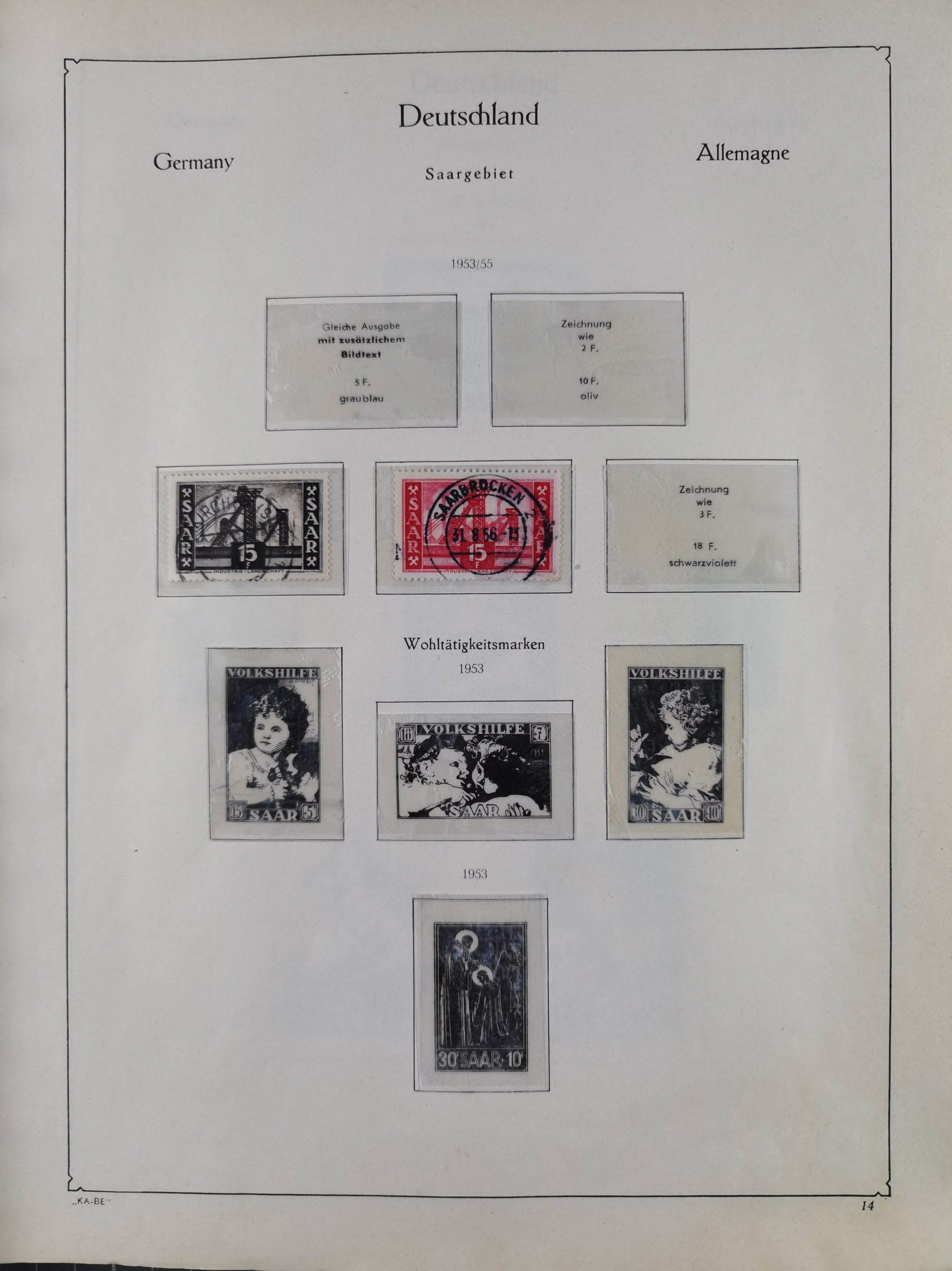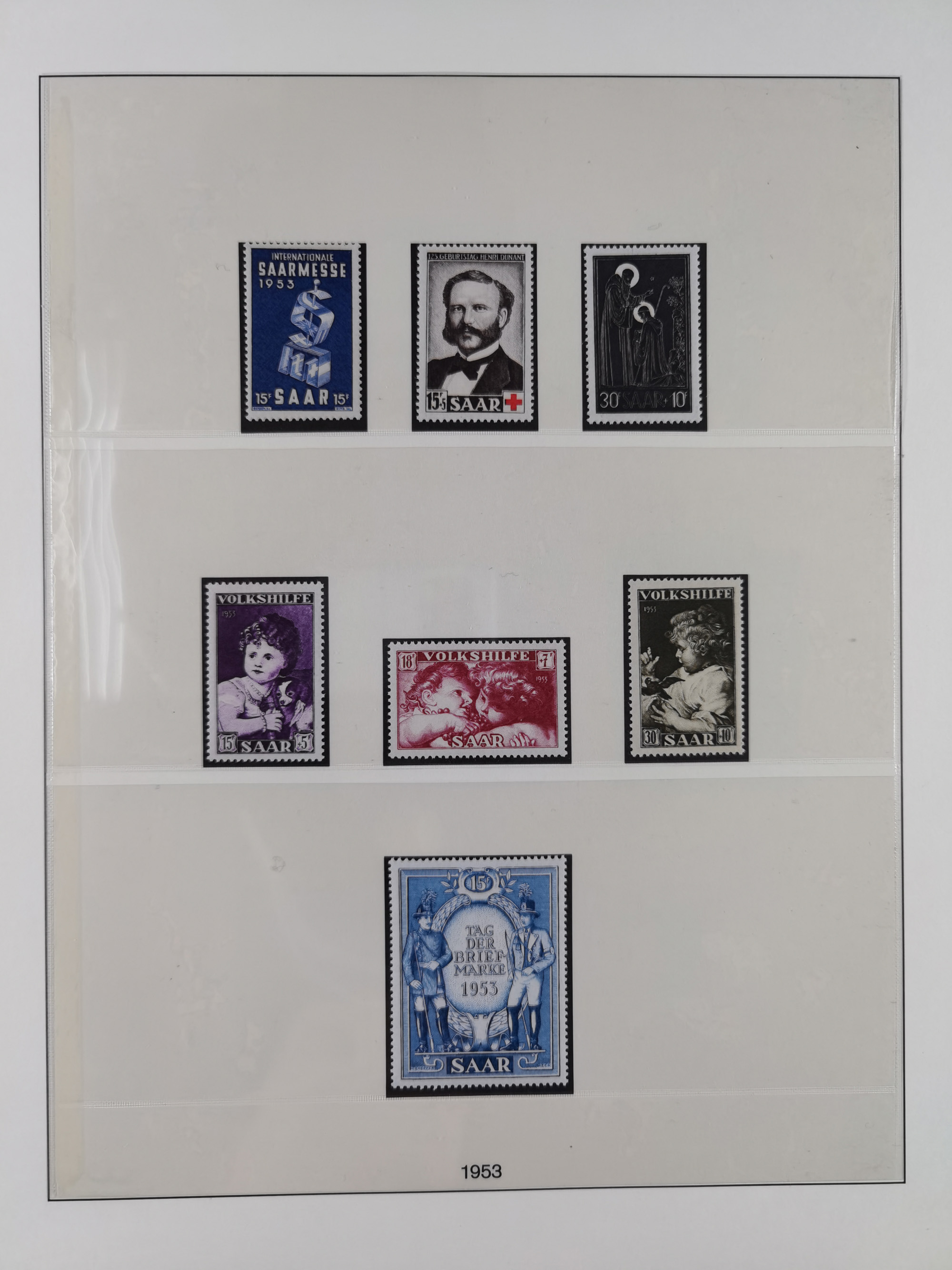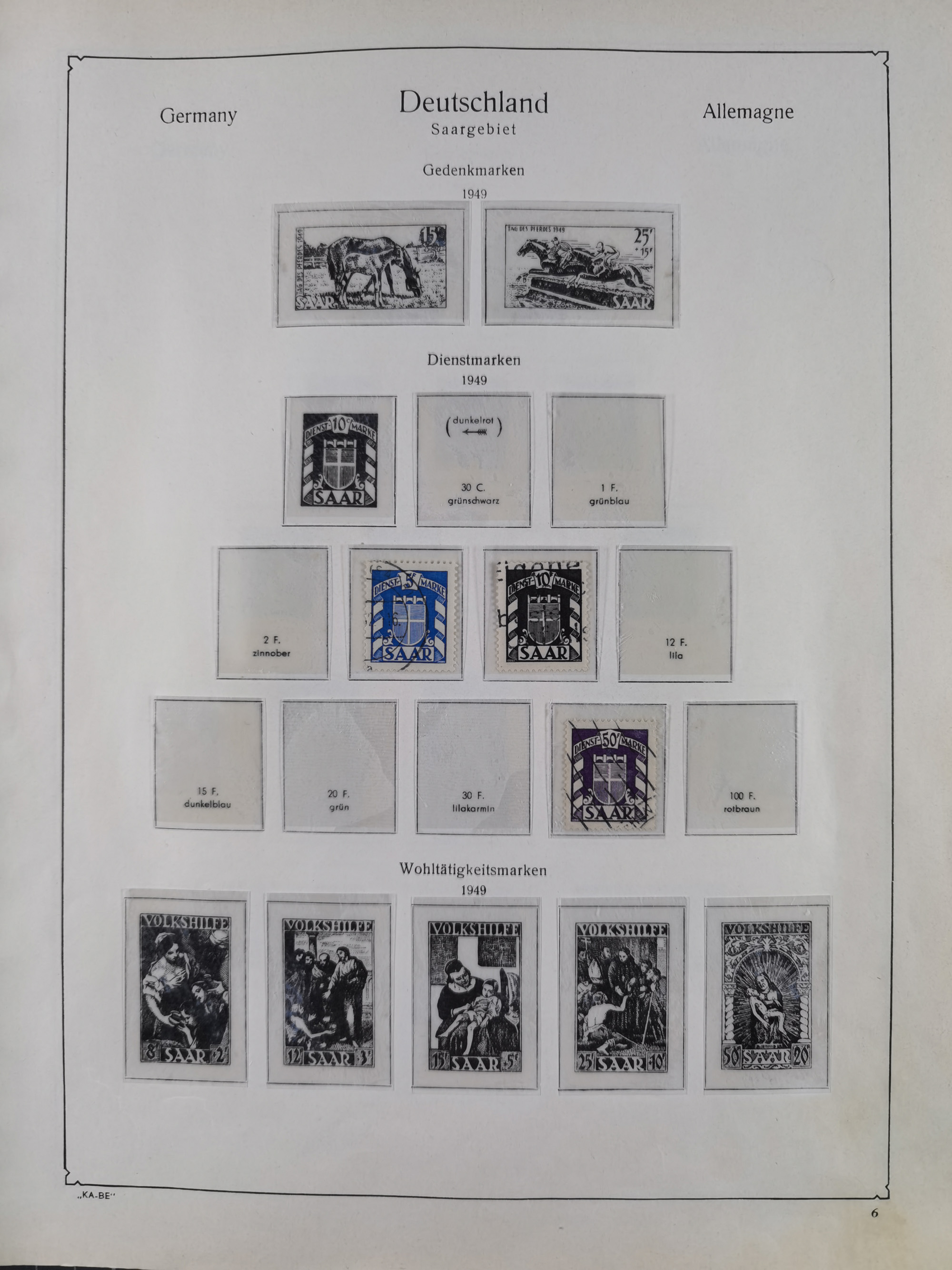 1920/59, in den Hauptnummern stark überkomplette fast ausnahmslos postfrische Sammlung inkl. Dienstmarken, dabei Mi.-Nr. 1-17, 1-17IA inkl. Farben mit 14aIA, Type II 7 Werte kpl., zusätzlich diese auch mit PF A (ohne 2aIIA), 1-17III mit 16IIIOR, 18-31 mit 30L und 31L, A31-C31 (B31 ungebraucht), ferner alle Volkshilfen inkl. Madonna mit Bogenrand, sowie Saarland mit unsigniertem Urdrucksatz, Hochwasserhilfe-Blockspaar, einigen Klbg., zusätzlich gestempelt 380-83 und 409-28 OR auf Briefstücken und MH1 postfrisch/ungebraucht (etwas fleckig), gute Erhaltung, 23 (Kurz-)Befunde und Atteste Ney, Geigle, Burger und Bernhard BPP, in zwei Vordruckalben