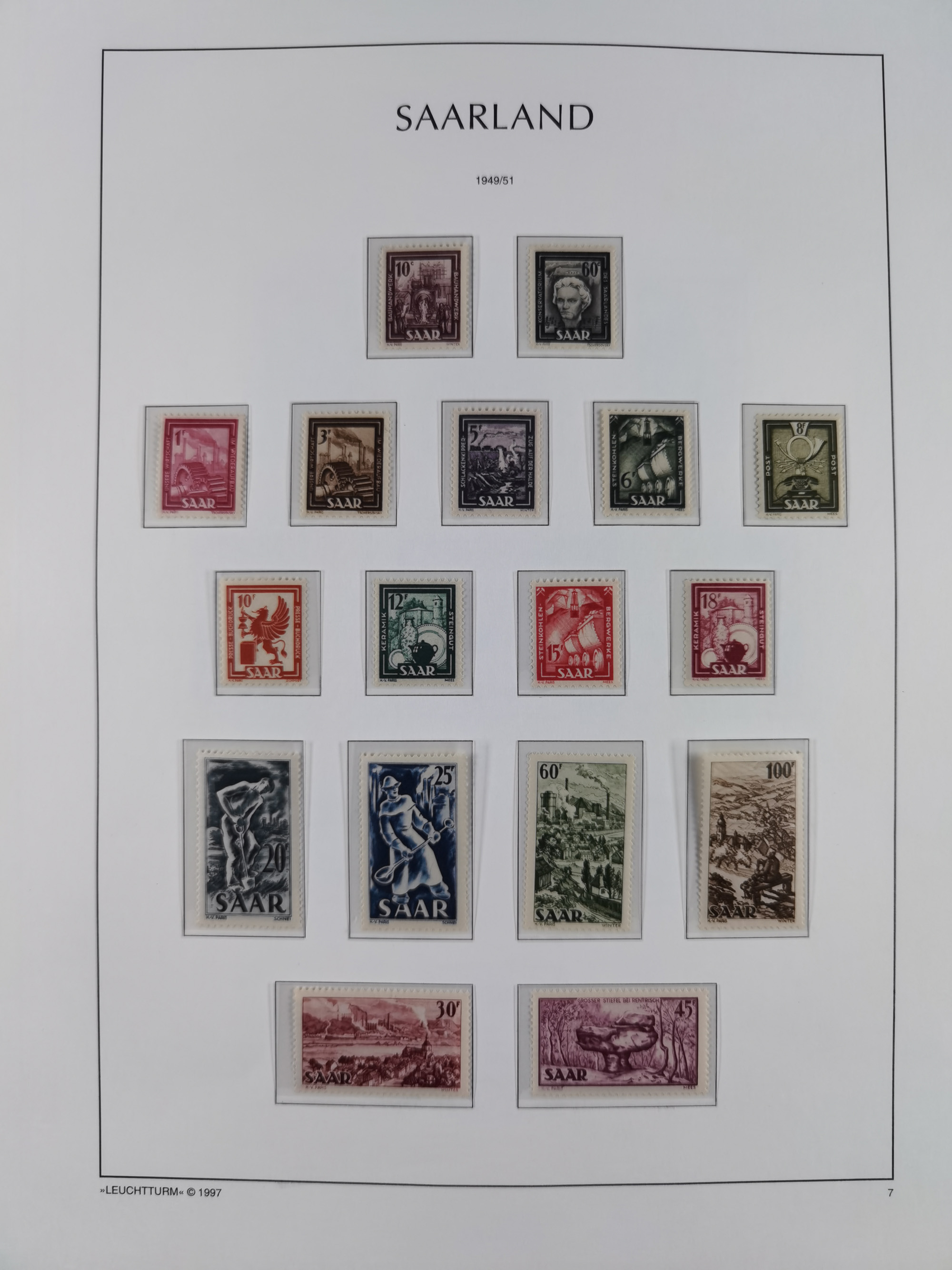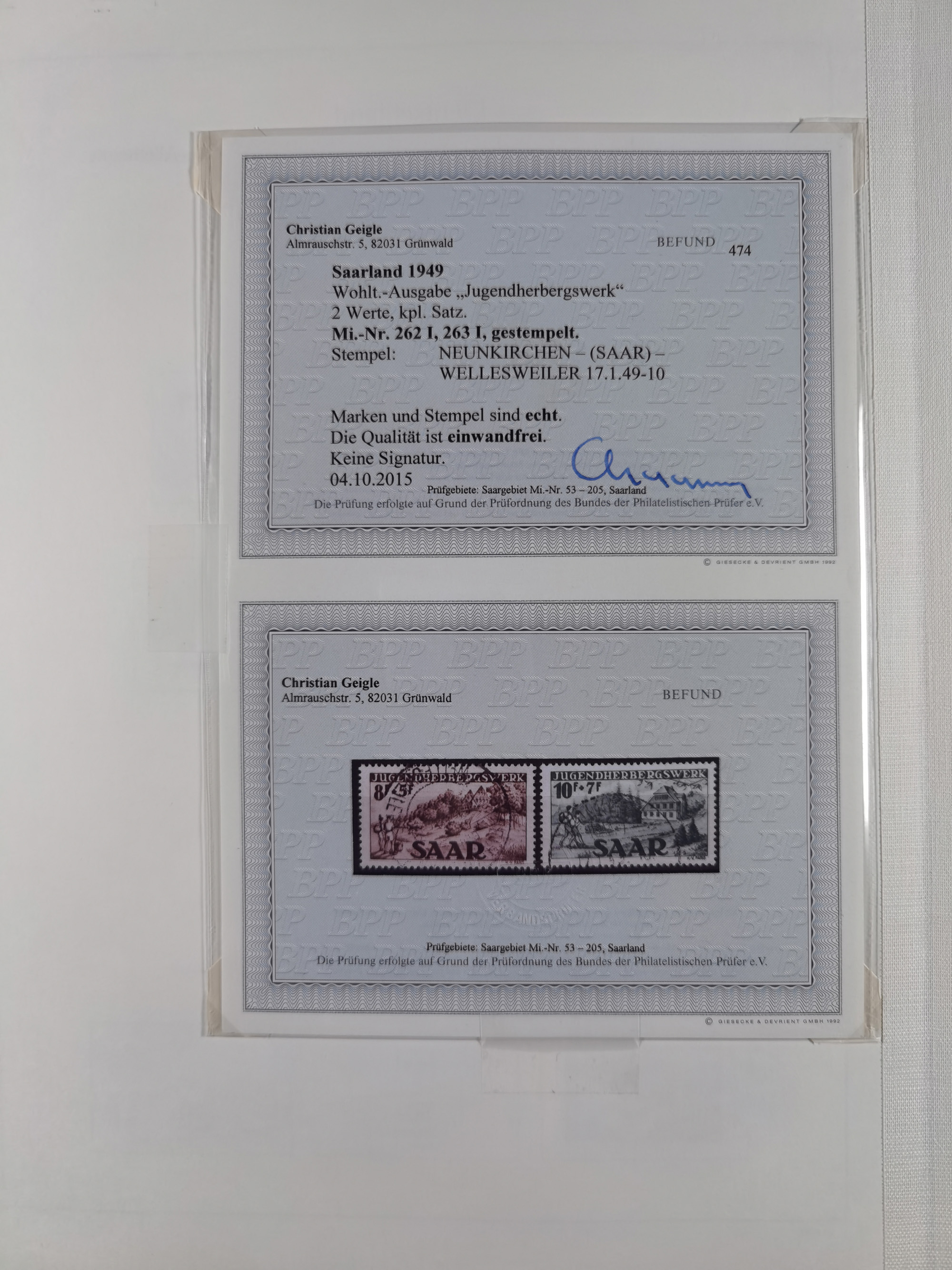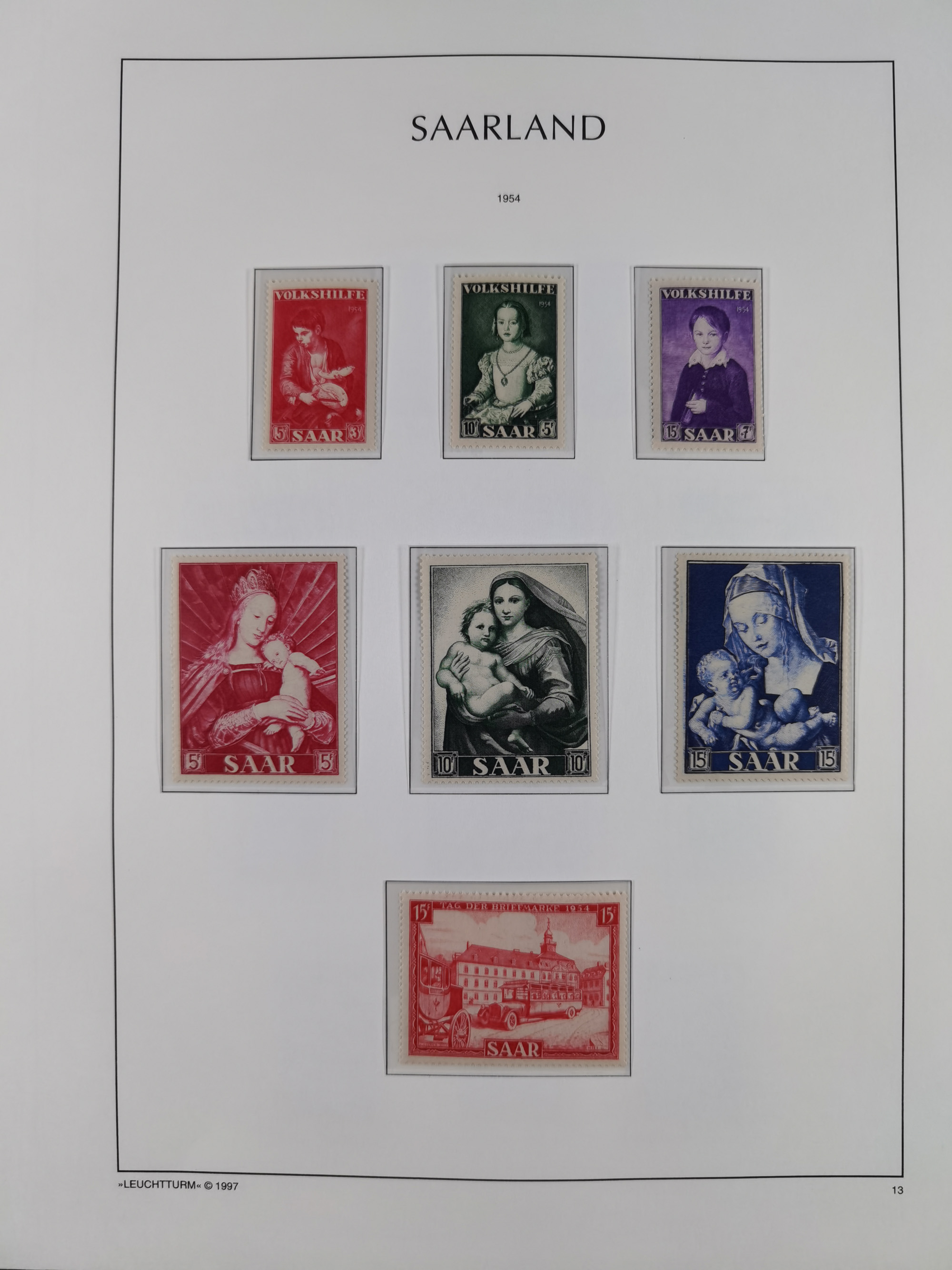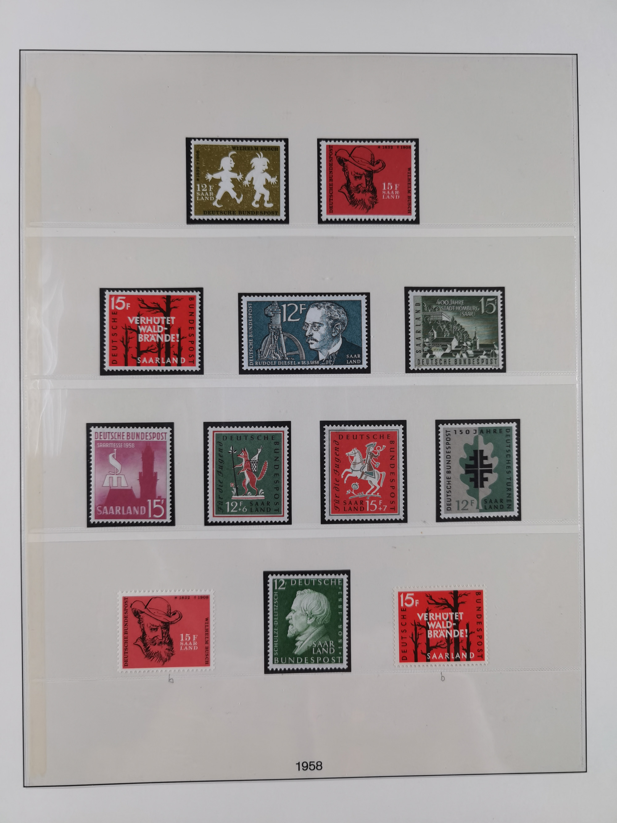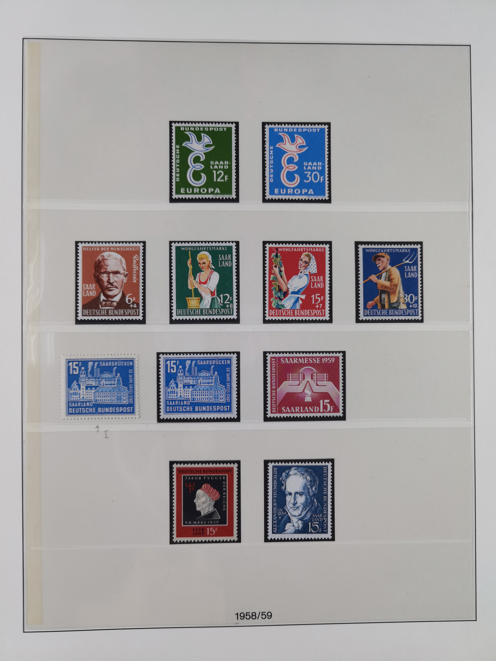 1920/59, in den Hauptnummern stark überkomplette fast ausnahmslos postfrische Sammlung inkl. Dienstmarken, dabei Mi.-Nr. 1-17, 1-17IA inkl. Farben mit 14aIA, Type II 7 Werte kpl., zusätzlich diese auch mit PF A (ohne 2aIIA), 1-17III mit 16IIIOR, 18-31 mit 30L und 31L, A31-C31 (B31 ungebraucht), ferner alle Volkshilfen inkl. Madonna mit Bogenrand, sowie Saarland mit unsigniertem Urdrucksatz, Hochwasserhilfe-Blockspaar, einigen Klbg., zusätzlich gestempelt 380-83 und 409-28 OR auf Briefstücken und MH1 postfrisch/ungebraucht (etwas fleckig), gute Erhaltung, 23 (Kurz-)Befunde und Atteste Ney, Geigle, Burger und Bernhard BPP, in zwei Vordruckalben