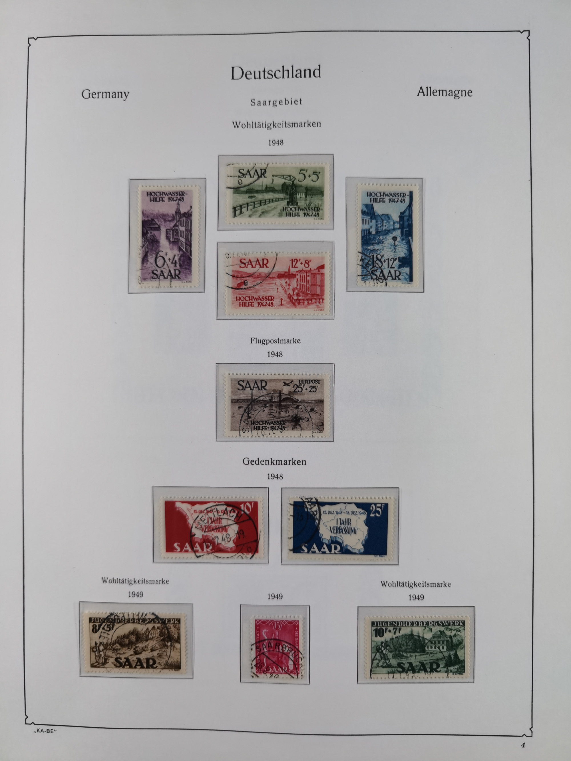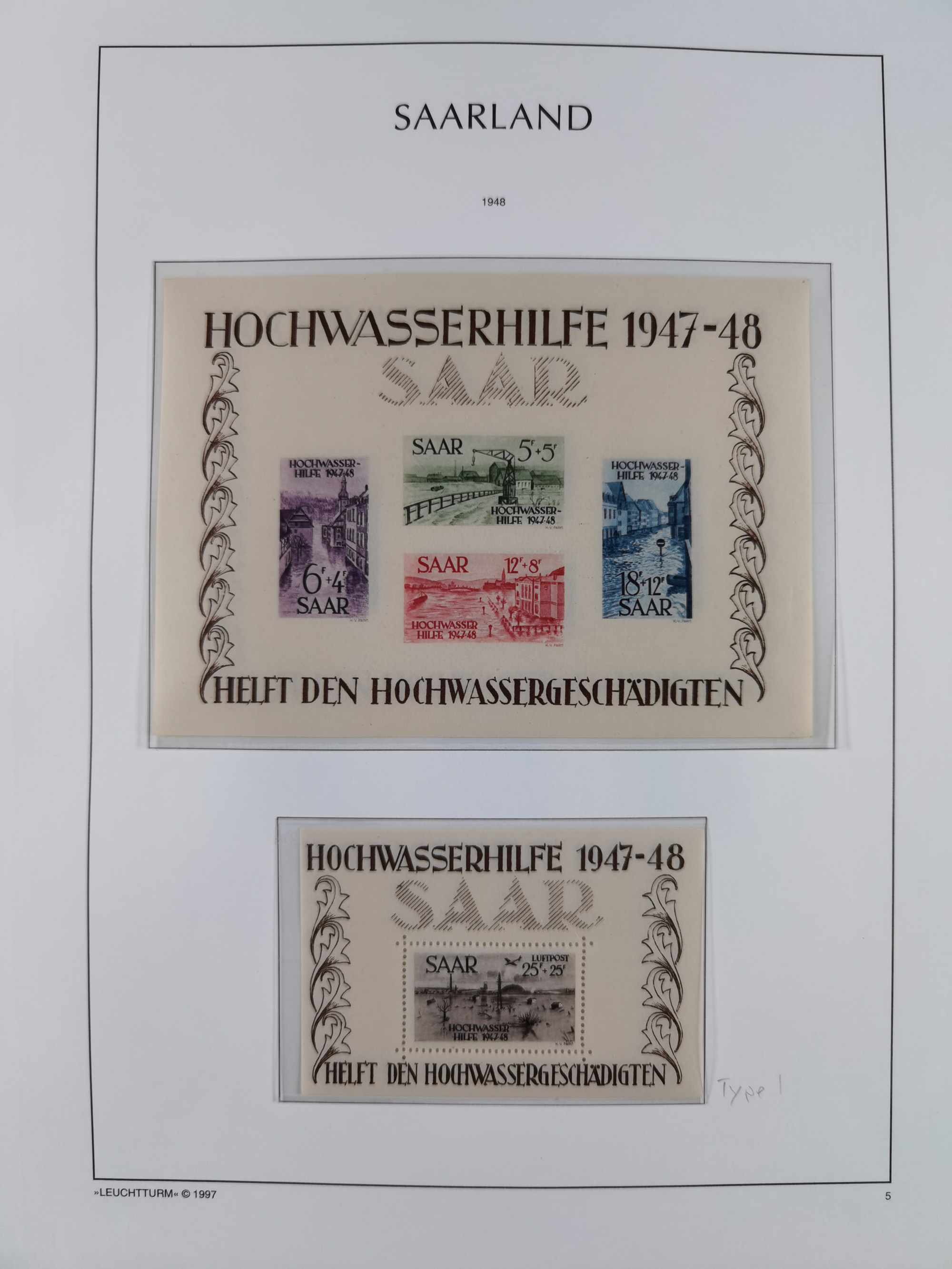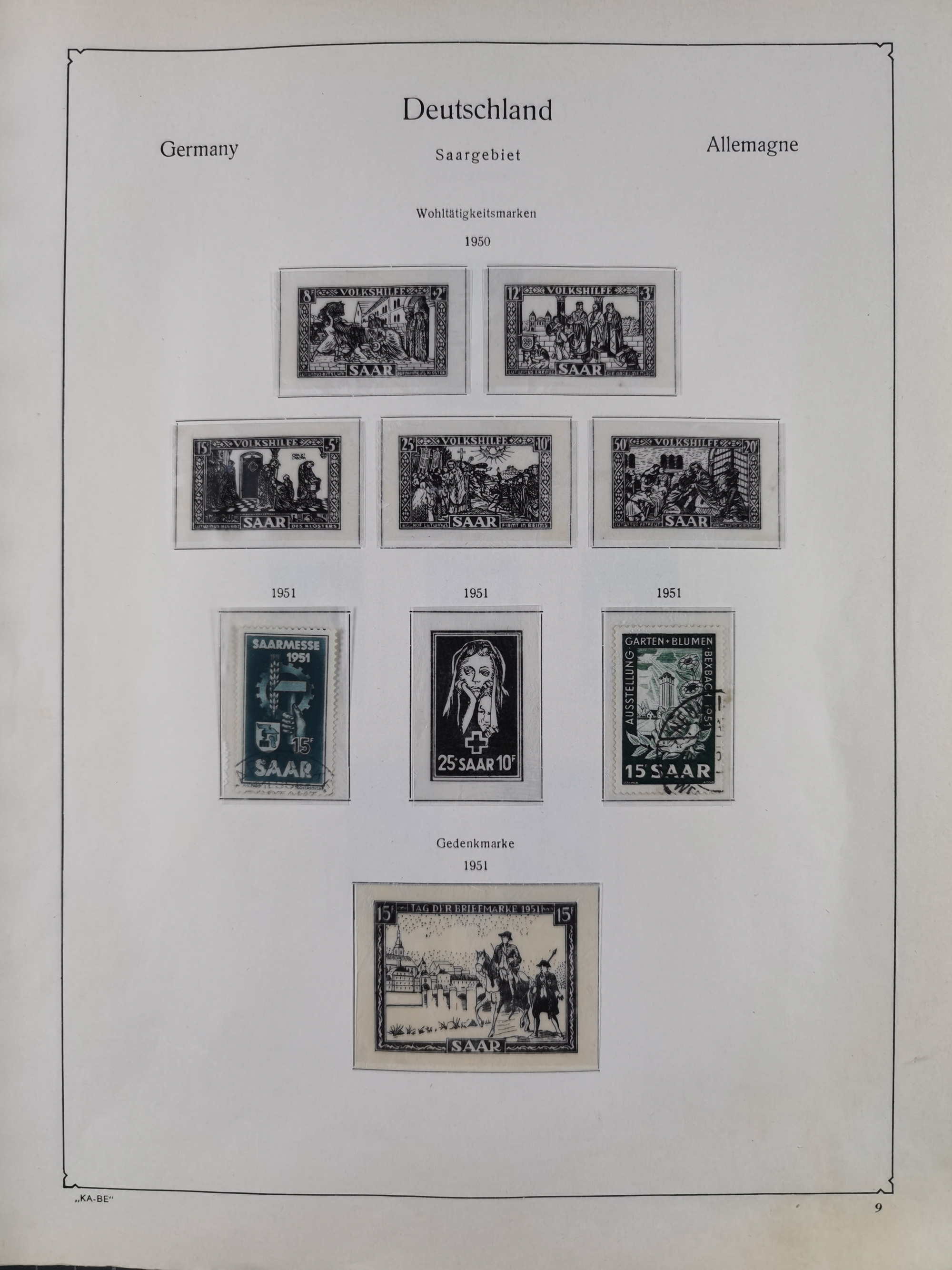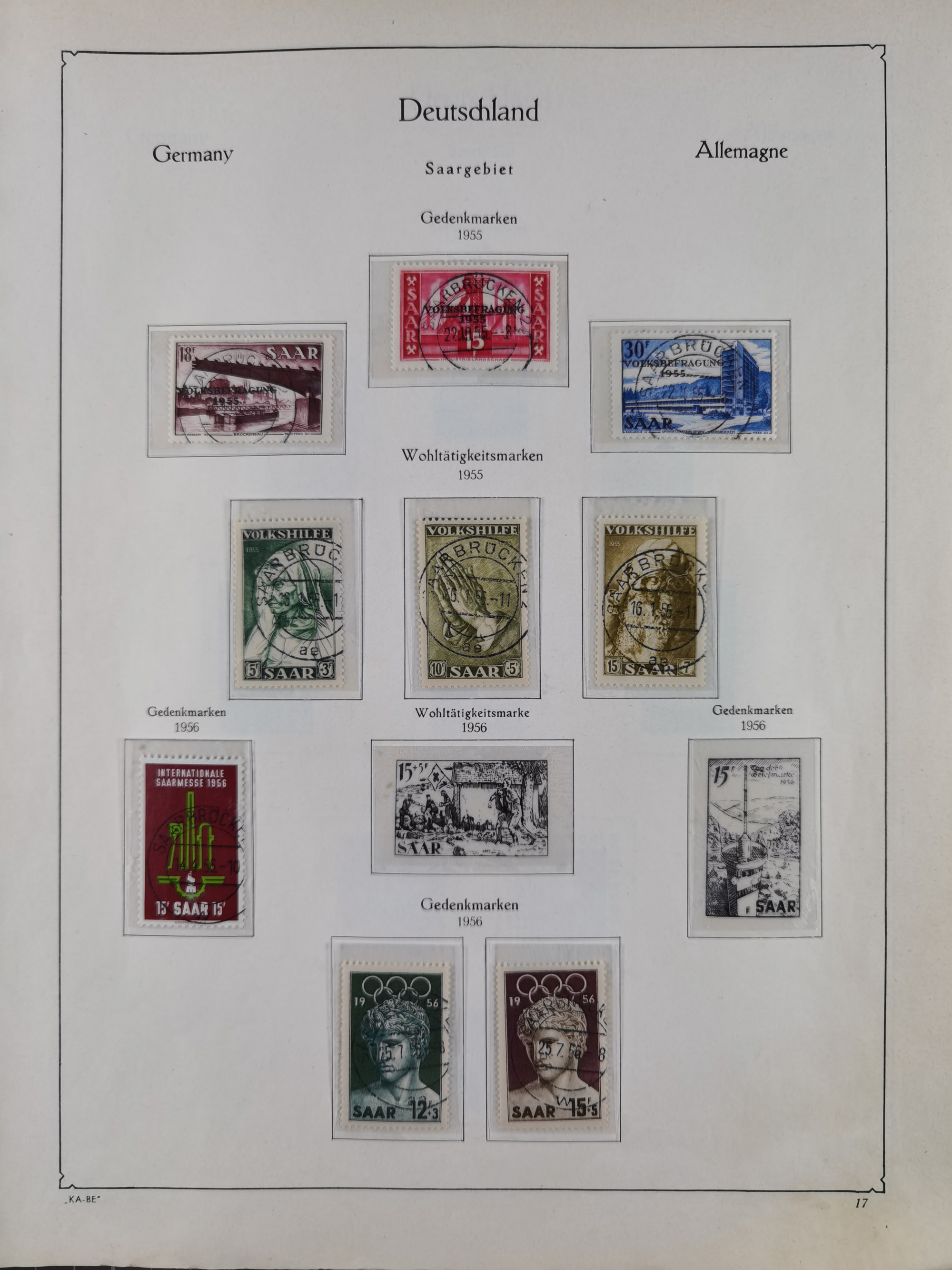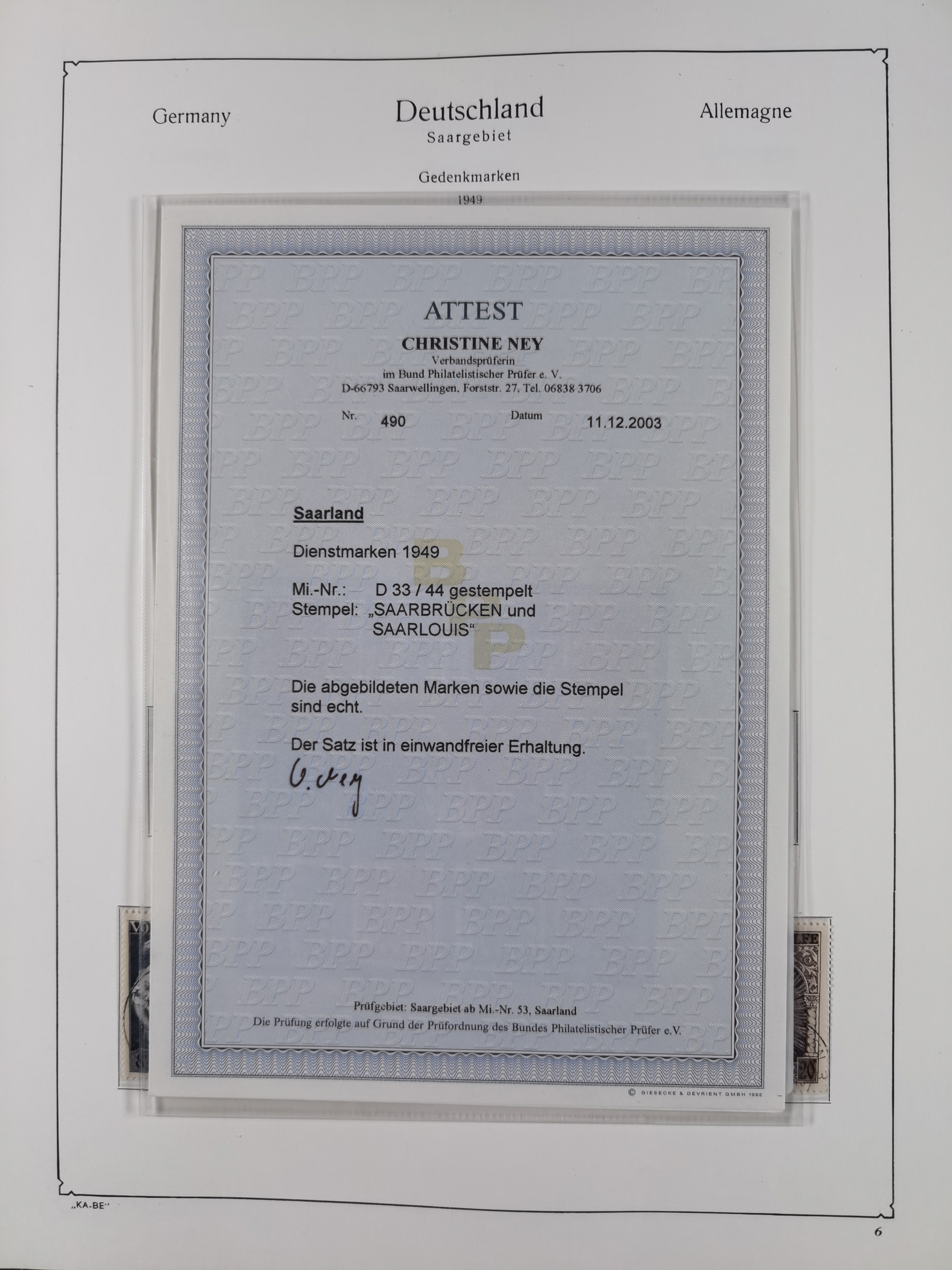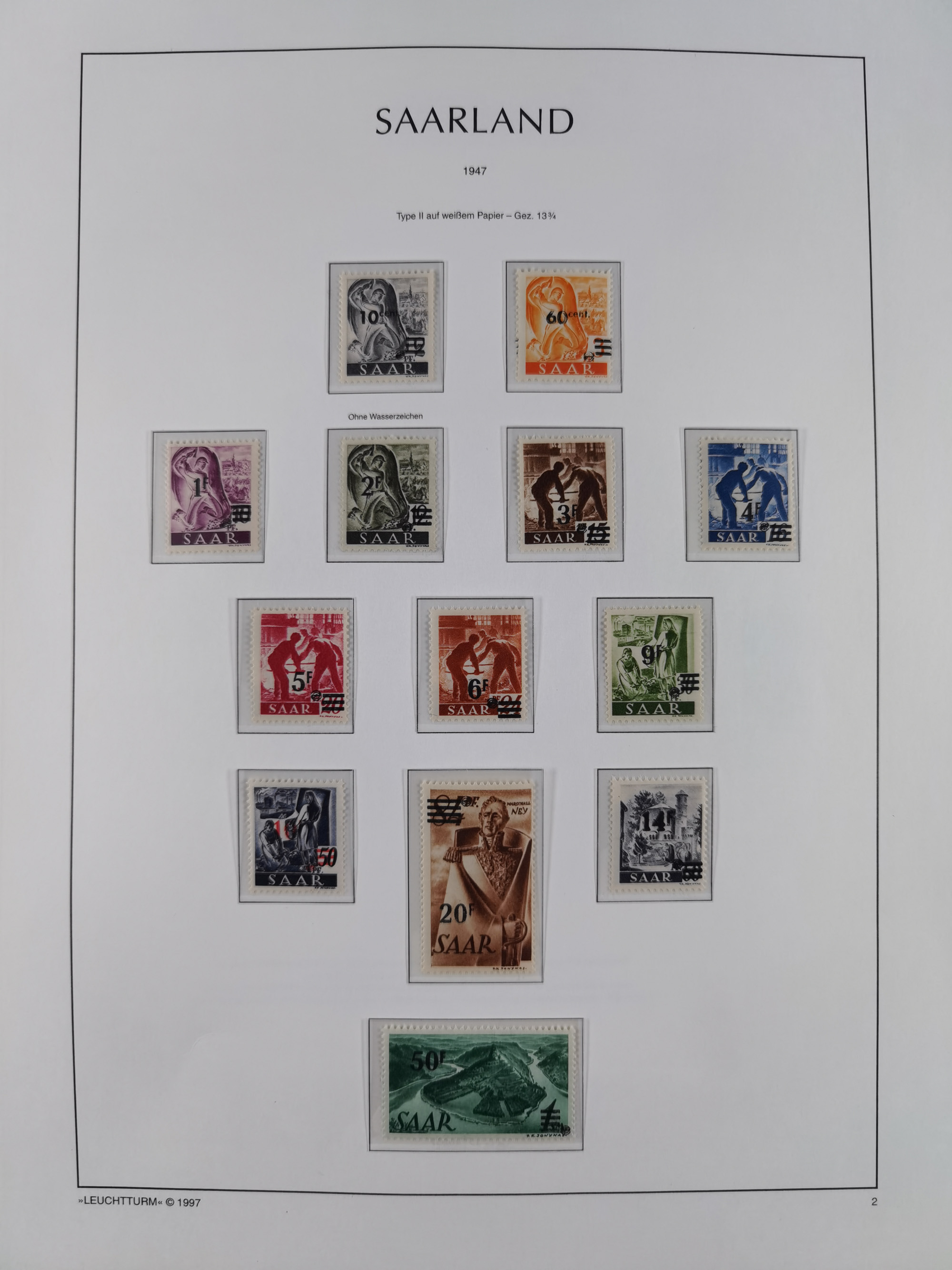 1920/59, in den Hauptnummern stark überkomplette fast ausnahmslos postfrische Sammlung inkl. Dienstmarken, dabei Mi.-Nr. 1-17, 1-17IA inkl. Farben mit 14aIA, Type II 7 Werte kpl., zusätzlich diese auch mit PF A (ohne 2aIIA), 1-17III mit 16IIIOR, 18-31 mit 30L und 31L, A31-C31 (B31 ungebraucht), ferner alle Volkshilfen inkl. Madonna mit Bogenrand, sowie Saarland mit unsigniertem Urdrucksatz, Hochwasserhilfe-Blockspaar, einigen Klbg., zusätzlich gestempelt 380-83 und 409-28 OR auf Briefstücken und MH1 postfrisch/ungebraucht (etwas fleckig), gute Erhaltung, 23 (Kurz-)Befunde und Atteste Ney, Geigle, Burger und Bernhard BPP, in zwei Vordruckalben