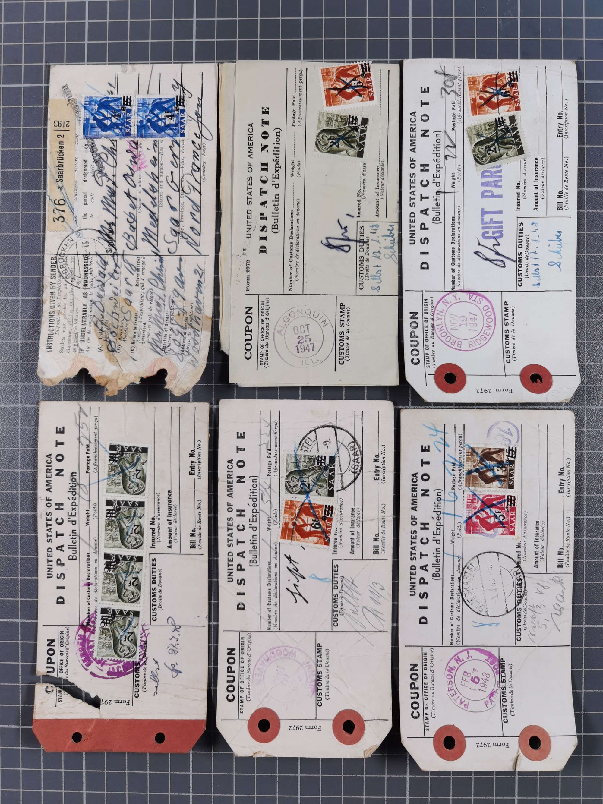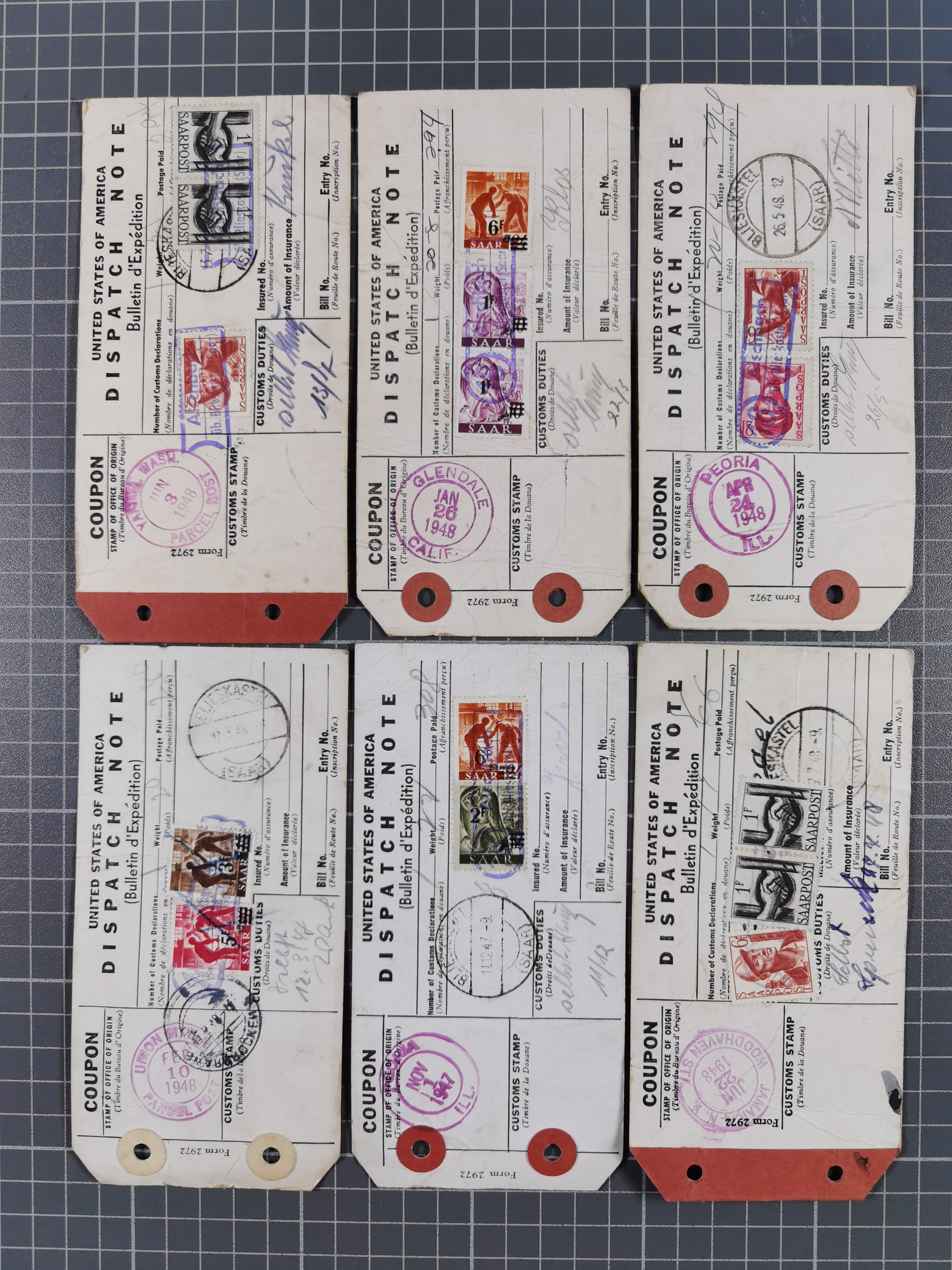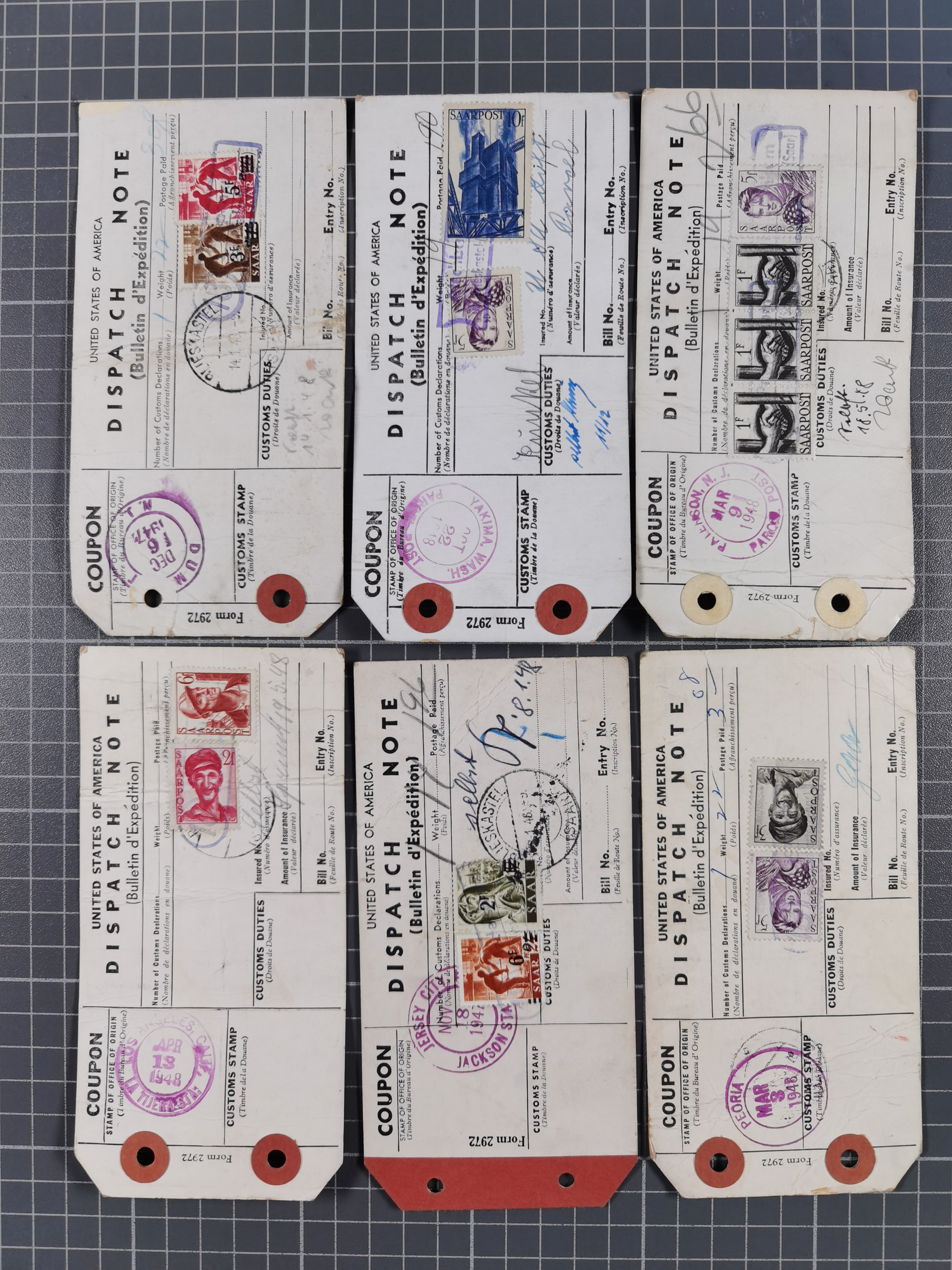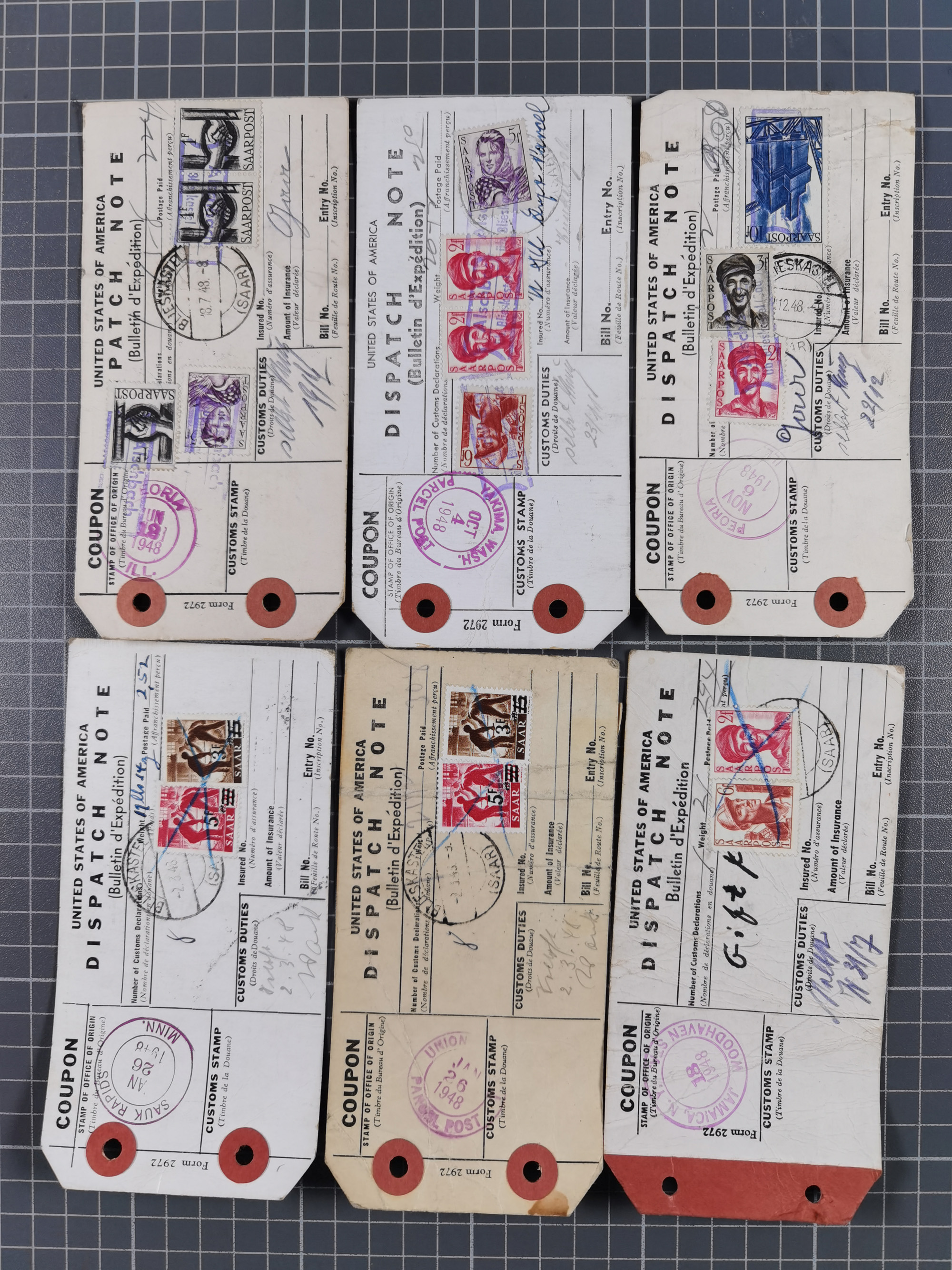 1947/48, Partie mit ca. 70 Koffer-Anhängern “Dispatch Note” aus den USA in das Saarland mit Postverzollungs-Gebührenstempeln und Frankaturen für die Zustellungsgebühren. Dabei Mehrfachfrankaturen 4 und 5 Fr., diverse Frankaturen mit Marken der 1. Aufdruckausgabe usw., meist mit Poststellen II-Stempeln oder Federstrich als Entwertung, unterschiedliche Erhaltung