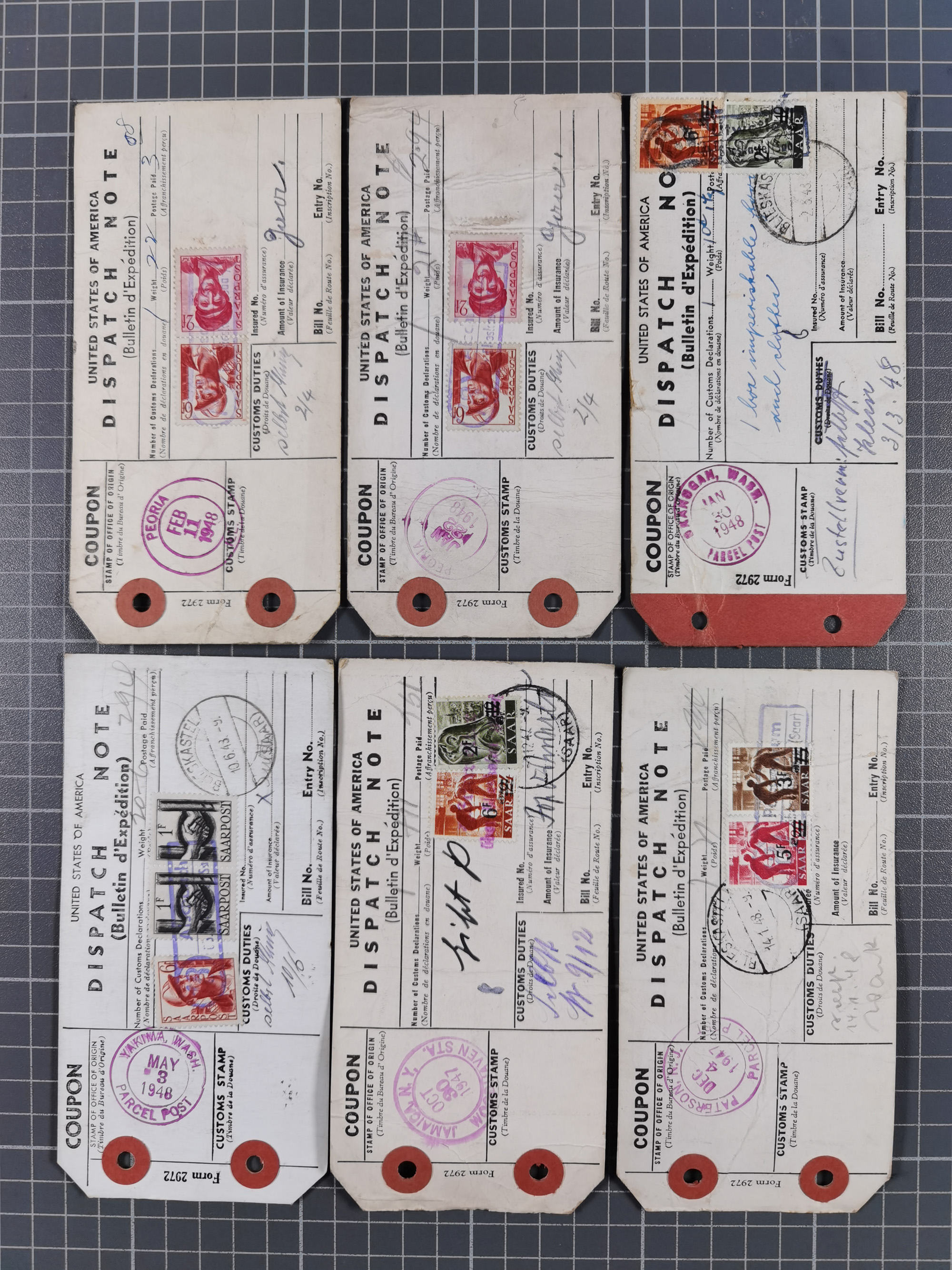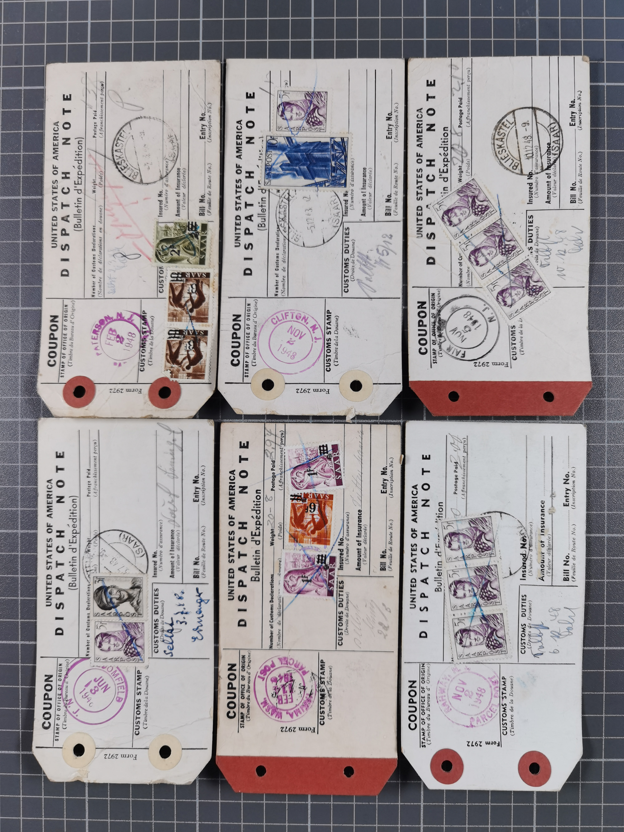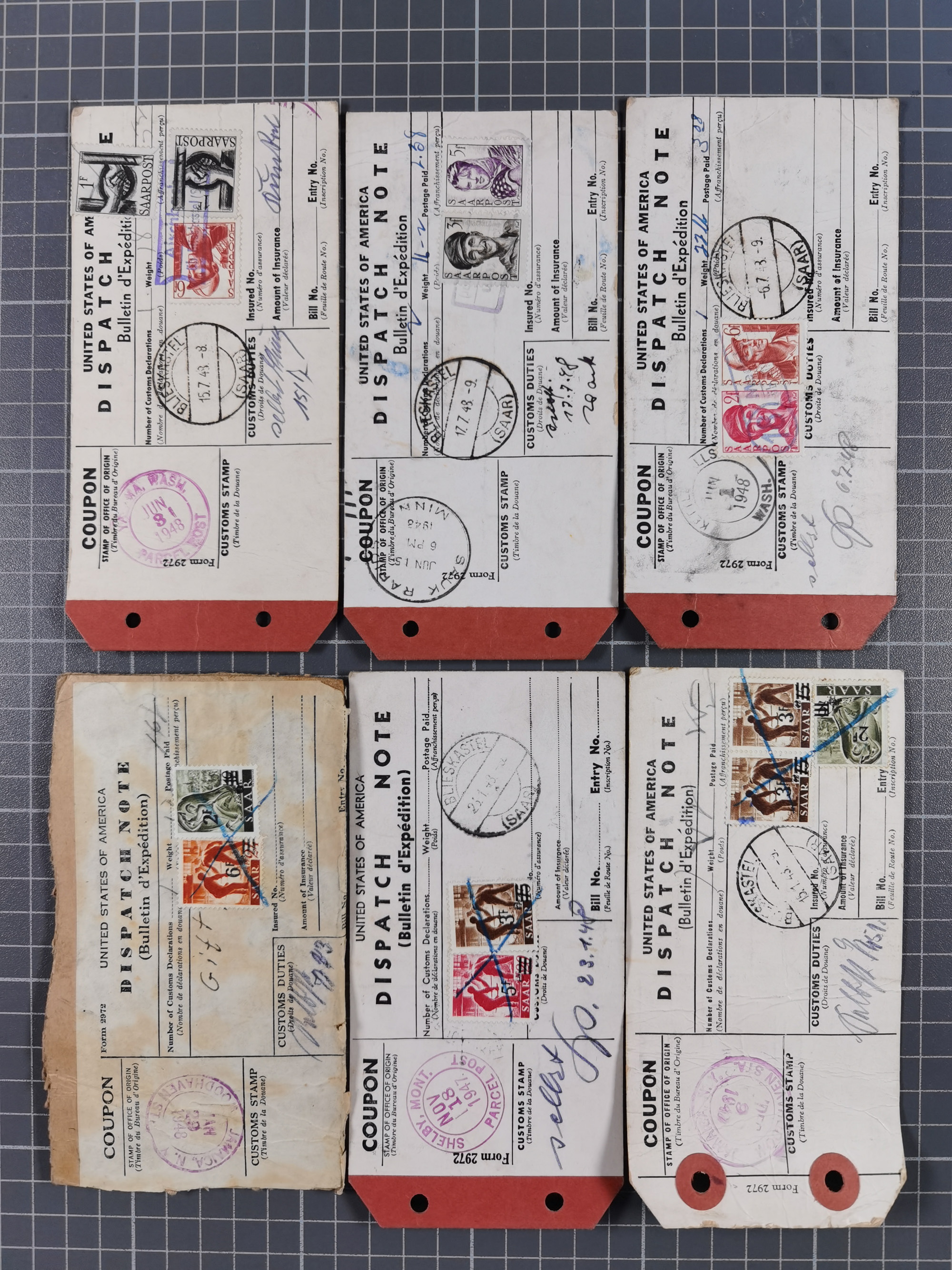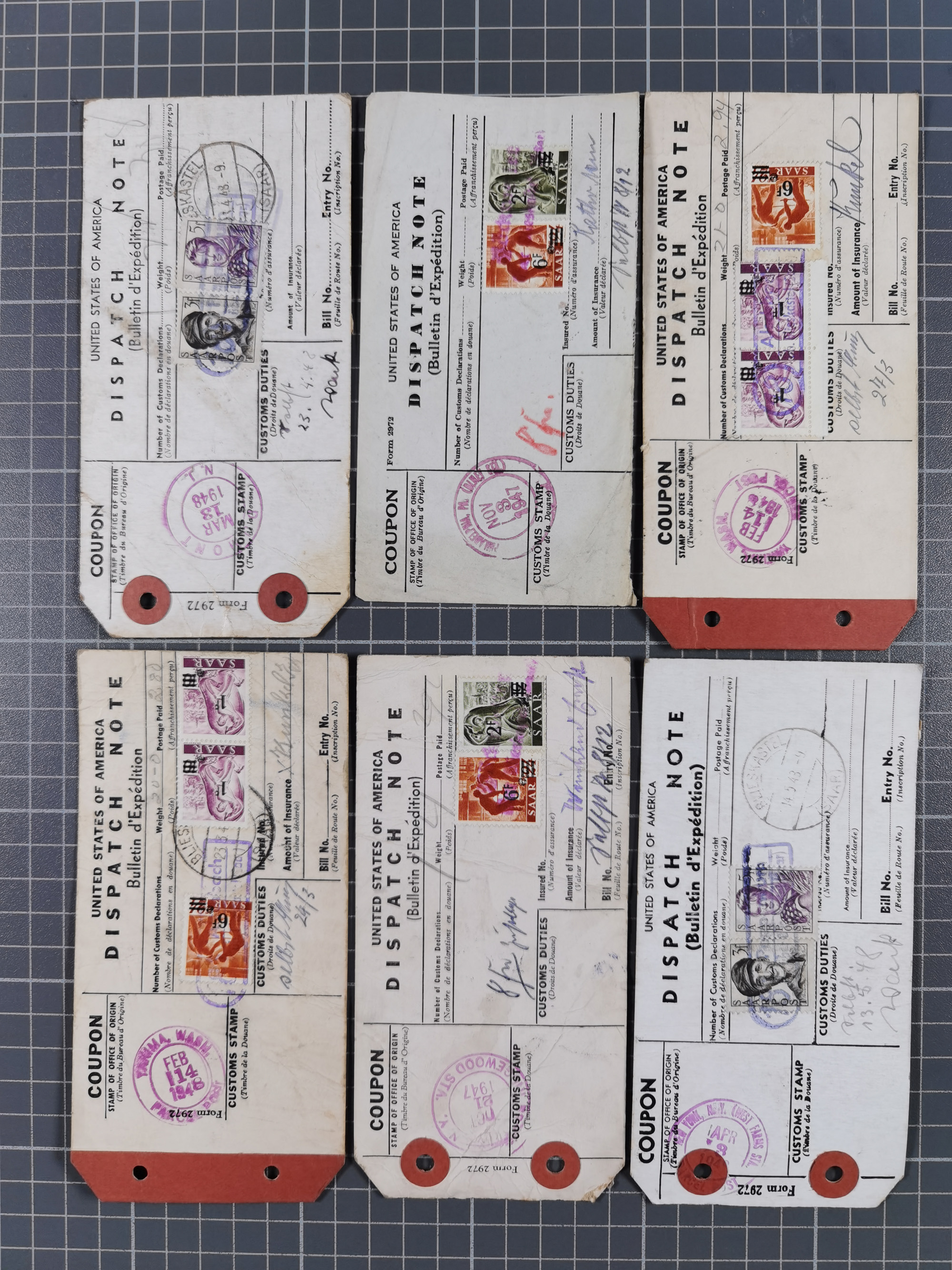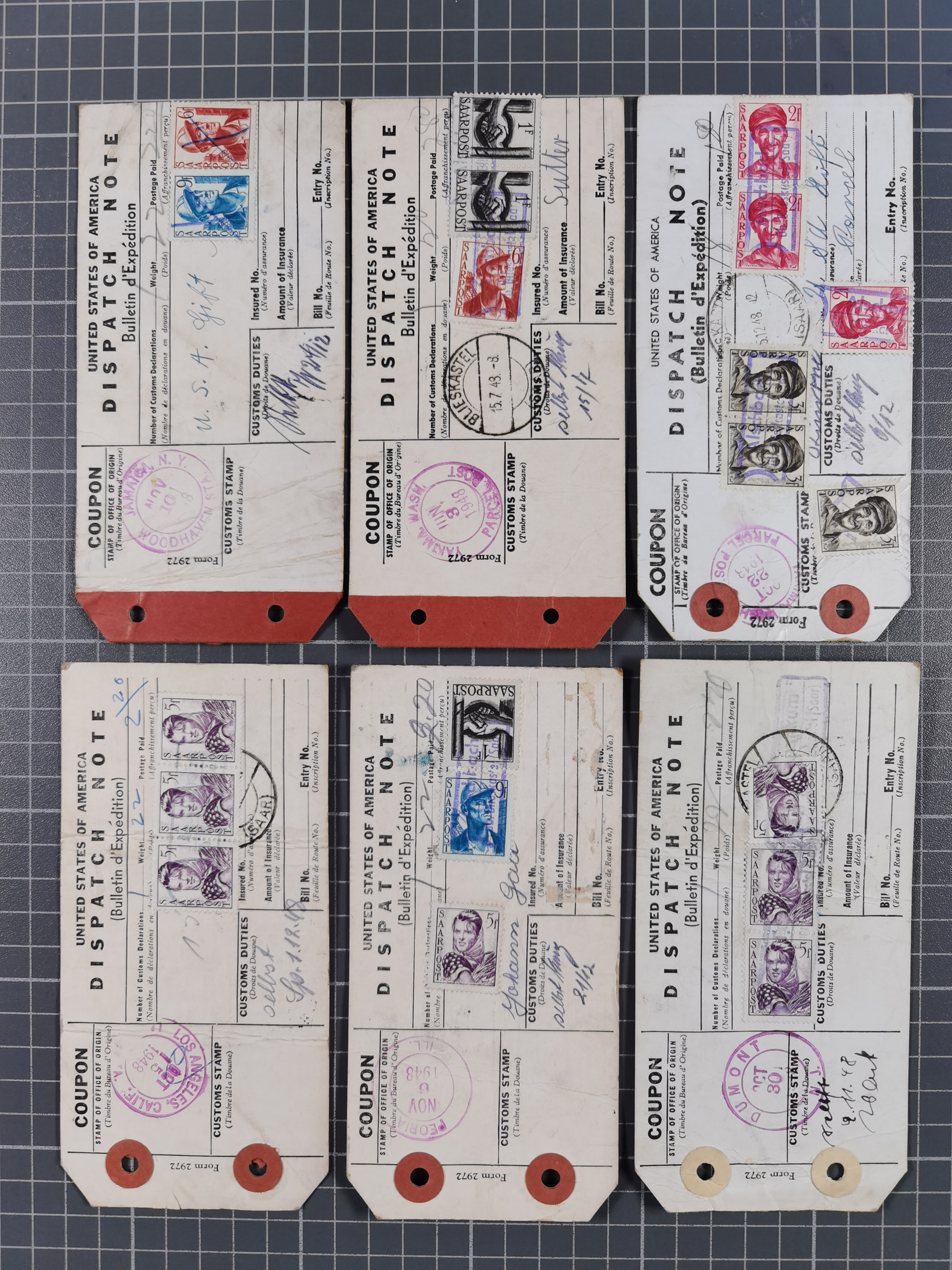 1947/48, Partie mit ca. 70 Koffer-Anhängern “Dispatch Note” aus den USA in das Saarland mit Postverzollungs-Gebührenstempeln und Frankaturen für die Zustellungsgebühren. Dabei Mehrfachfrankaturen 4 und 5 Fr., diverse Frankaturen mit Marken der 1. Aufdruckausgabe usw., meist mit Poststellen II-Stempeln oder Federstrich als Entwertung, unterschiedliche Erhaltung