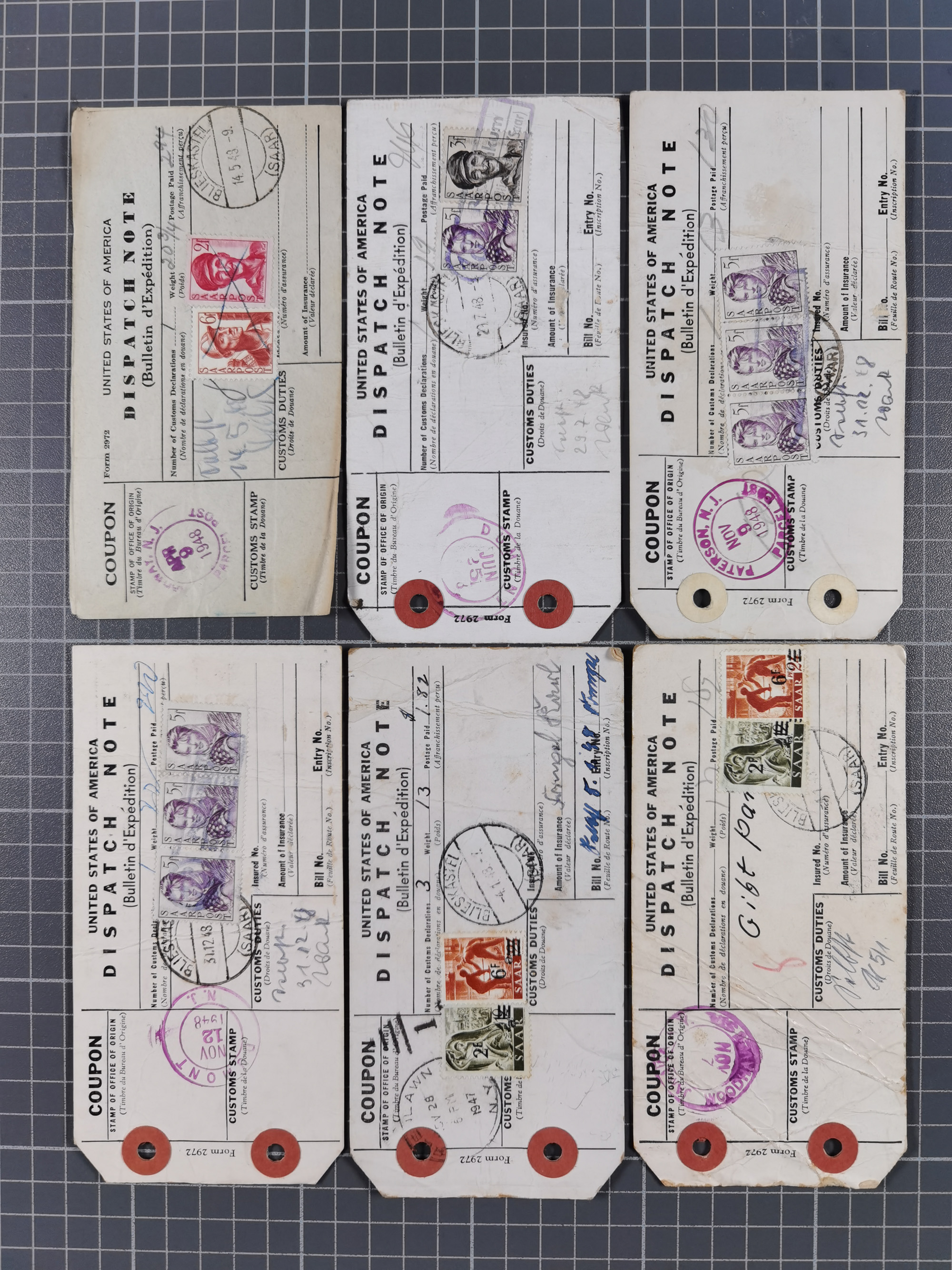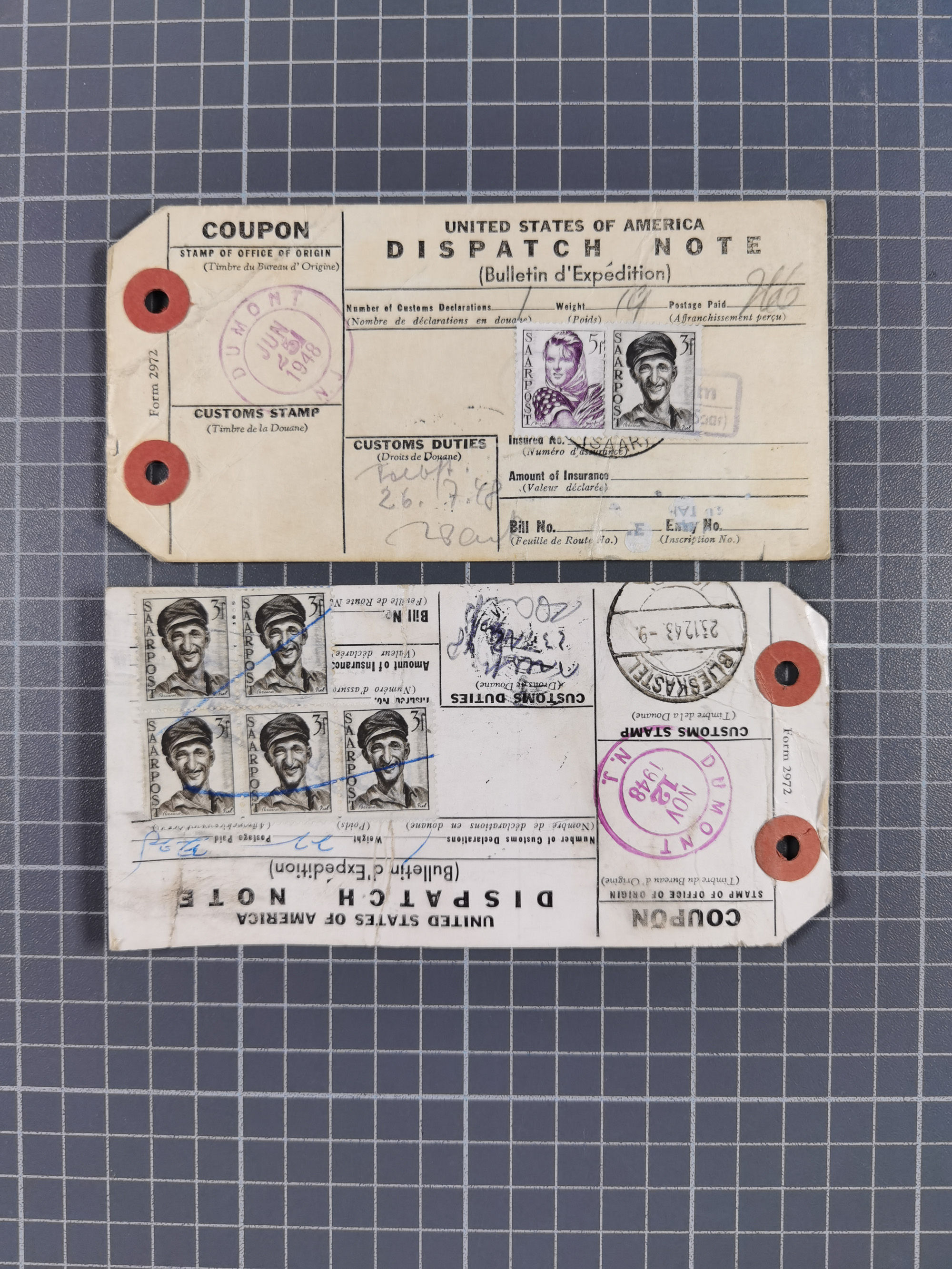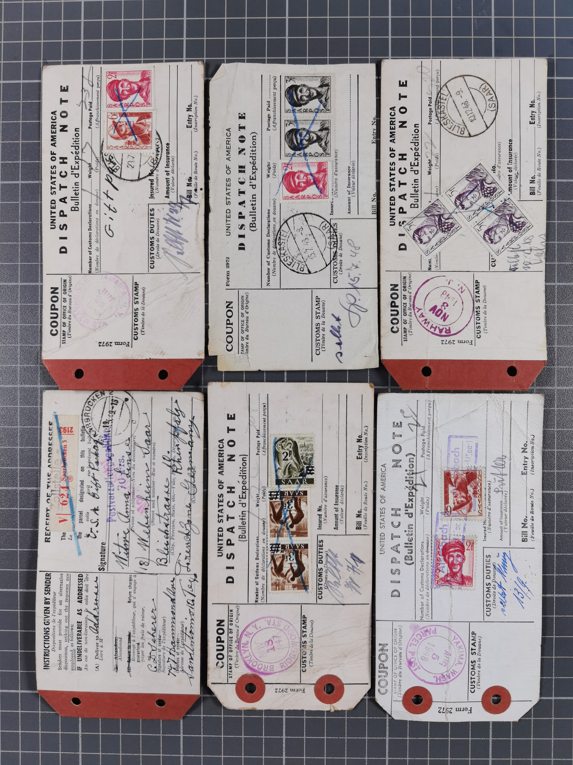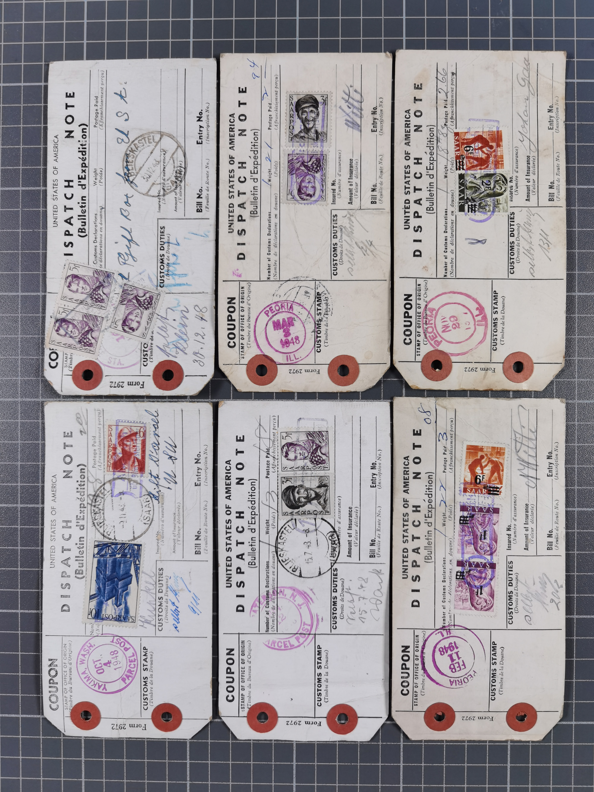 1947/48, Partie mit ca. 70 Koffer-Anhängern “Dispatch Note” aus den USA in das Saarland mit Postverzollungs-Gebührenstempeln und Frankaturen für die Zustellungsgebühren. Dabei Mehrfachfrankaturen 4 und 5 Fr., diverse Frankaturen mit Marken der 1. Aufdruckausgabe usw., meist mit Poststellen II-Stempeln oder Federstrich als Entwertung, unterschiedliche Erhaltung
