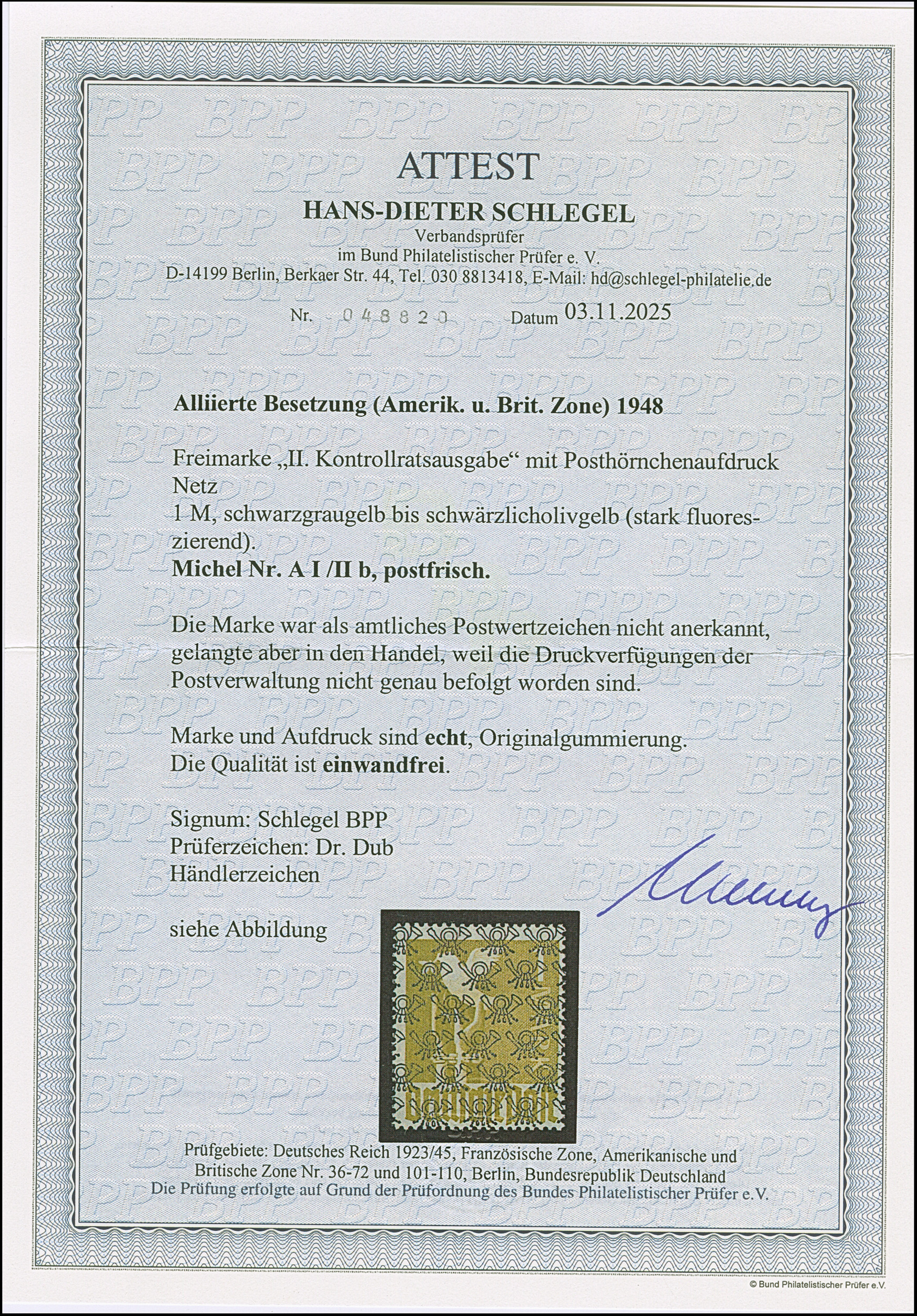 1948, Netz auf Taube 1 M. schwarzgraugelb bis schwärzlicholivgelb (stark fluoreszierend), postfrisch, in tadelloser Erhaltung, sign. Dr. Dub und Schlegel BPP sowie Fotoattest D. Schlegel BPP (2025)