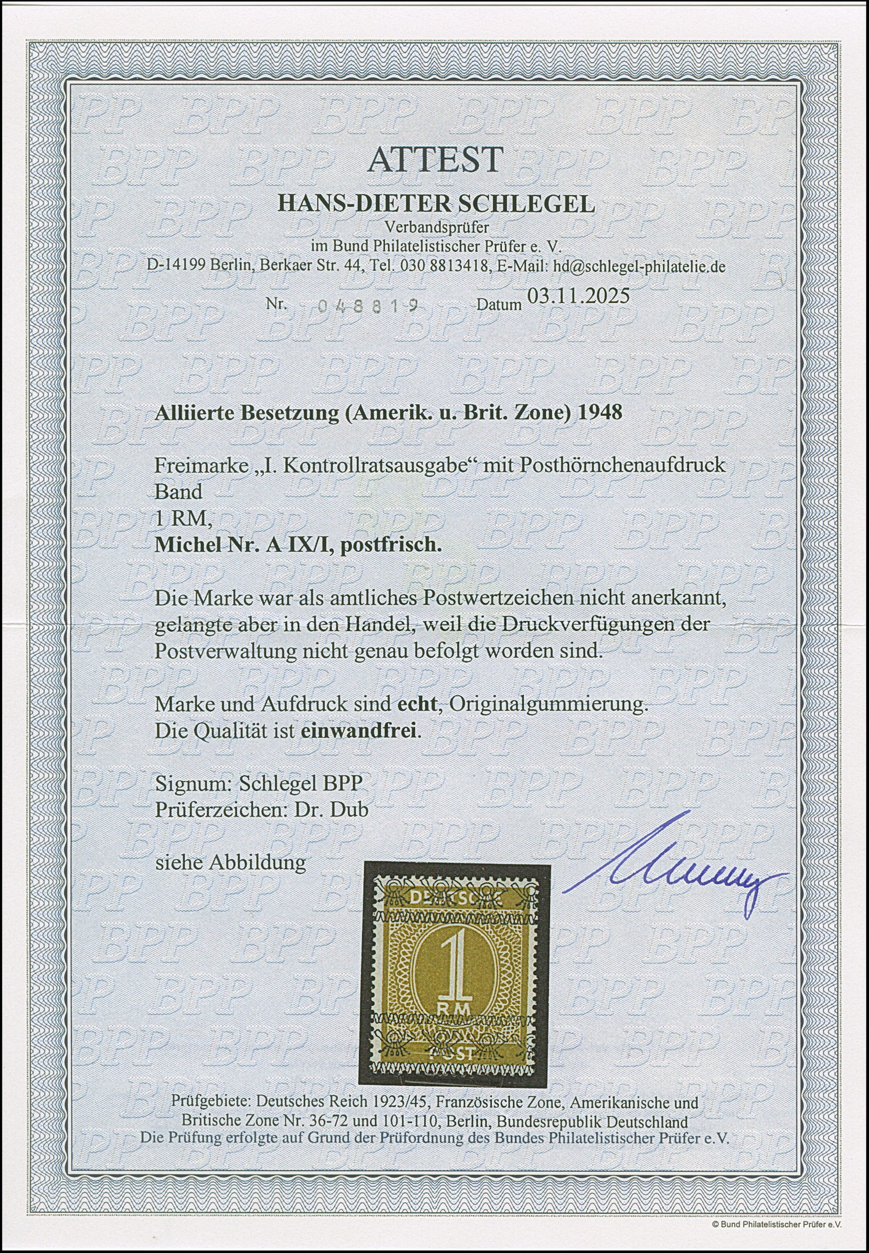 Band auf Ziffer 1 RM., postfrisch, in tadelloser Erhaltung, sign. Dr. Dub und Schlegel BPP sowie Fotoattest D. Schlegel BPP (2025)