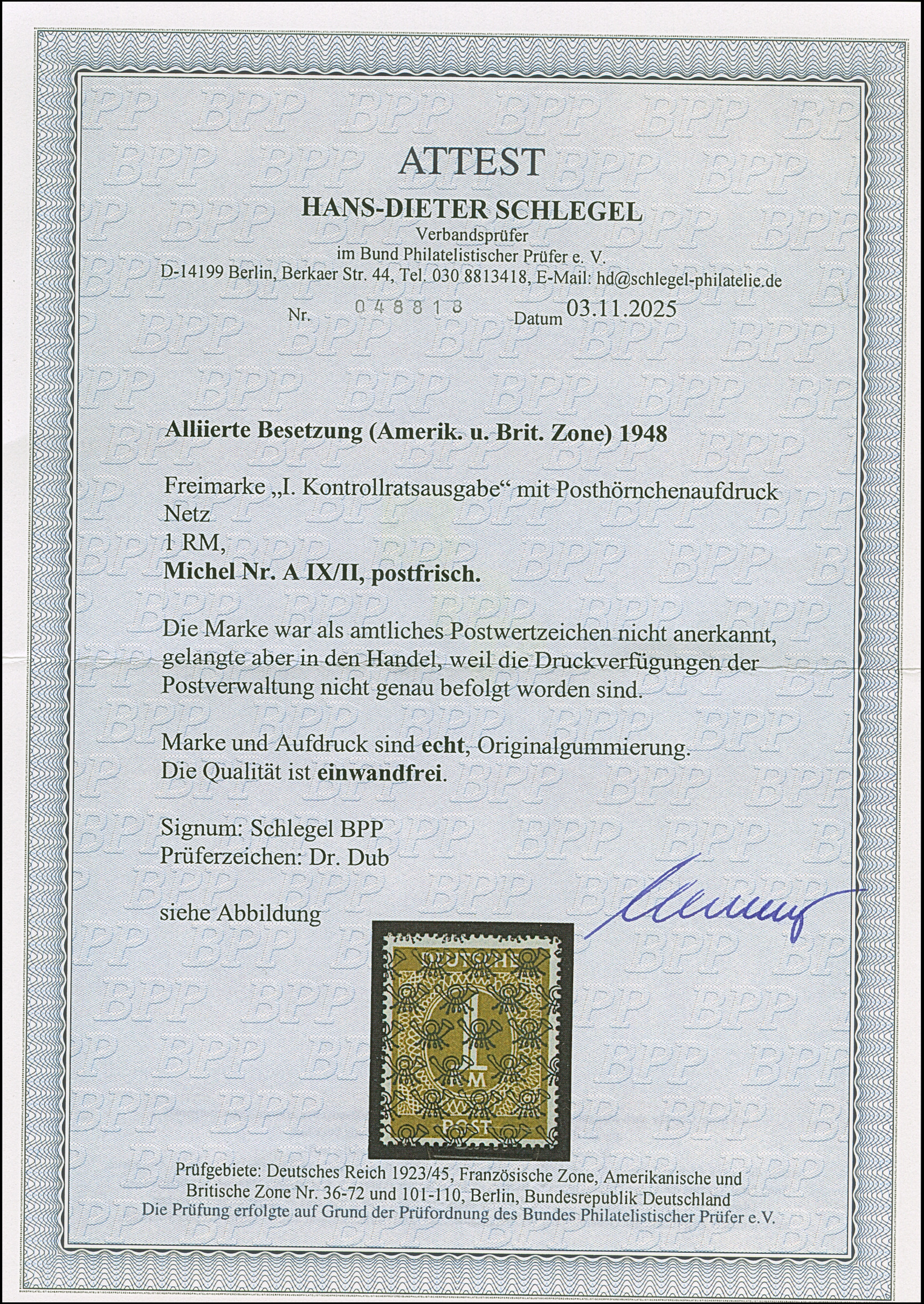 1 RM mit Netzaufdruck, postfrisch, einwandfrei. Signiert Dr. Dub und Schlegel BPP, Fotoattest H.-D. Schlegel BPP (2025)