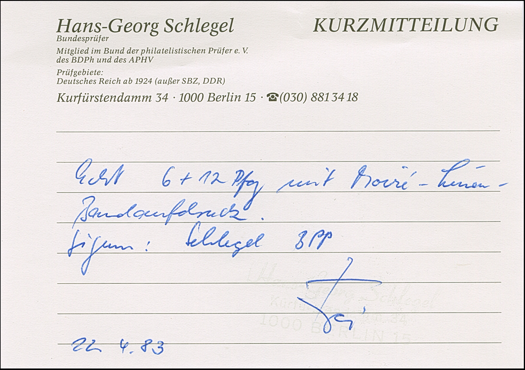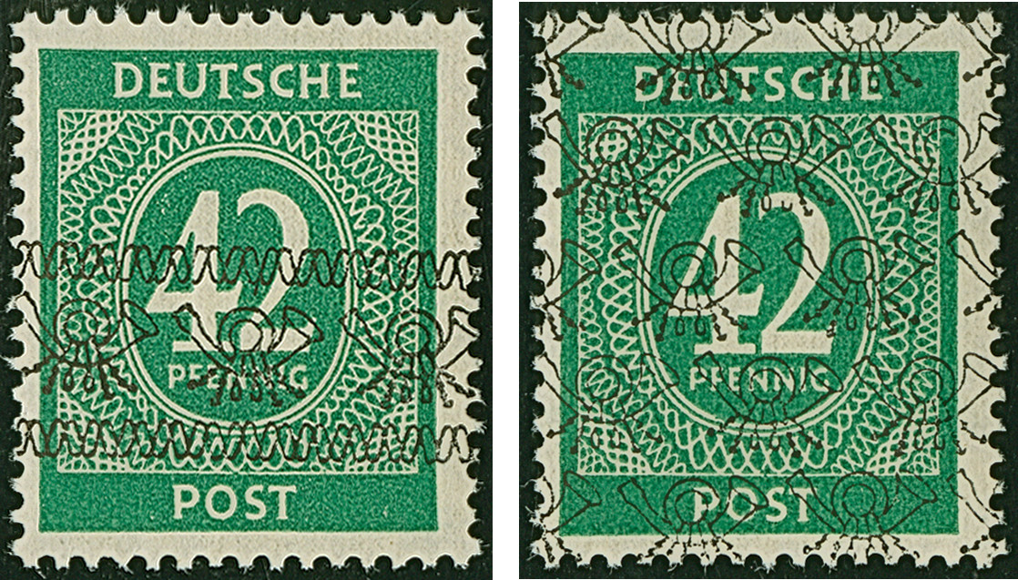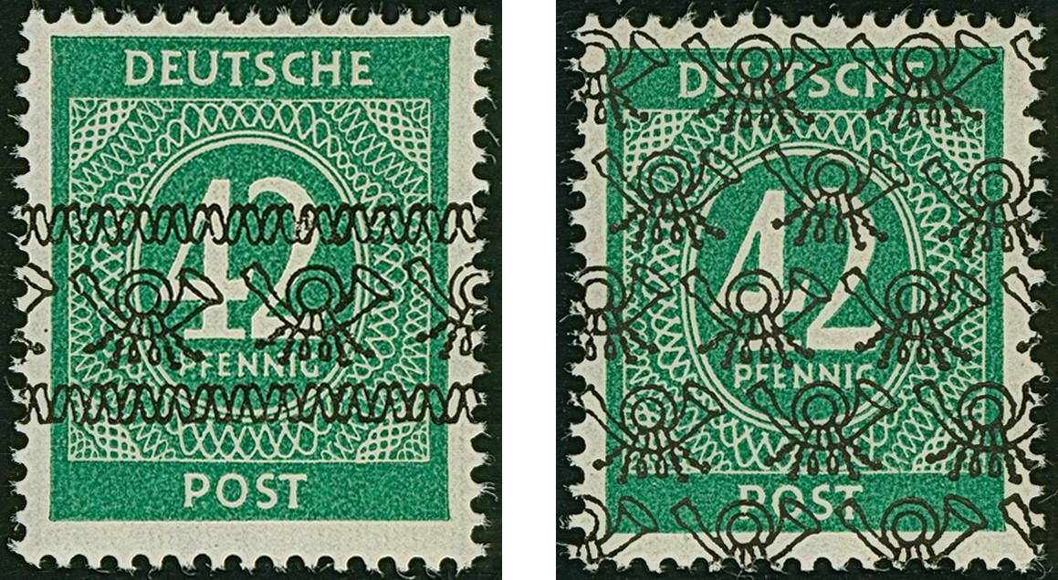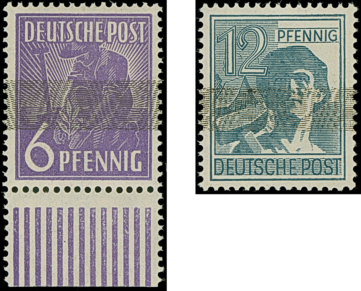 1948, Arbeiter 6 und 12 Pfg. mit schwarzem Moire-Probeaufdruck, 6 Pfg. vom Unterrand, postfrisch, 12 Pfg. wie immer ohne Gummi. Signiert Schlegel BPP