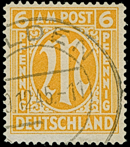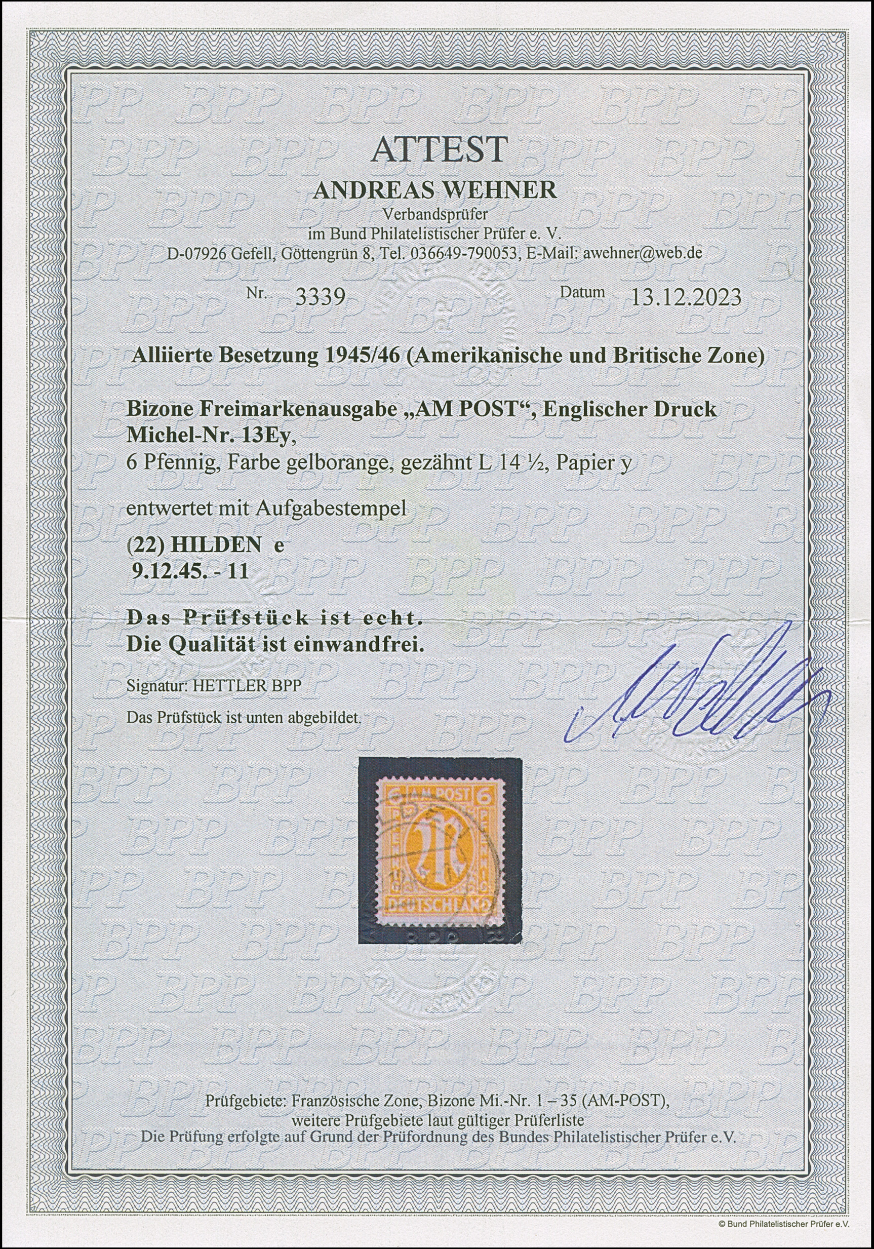 1945, Englischer Druck, 6 Pfg., gez. L14½, farbfrisch und gut gezähnt, sauber gestempelt “HILDEN 9.12.45”, tadellos, sign. Hettler BPP sowie Fotoattest Wehner BPP (2023)