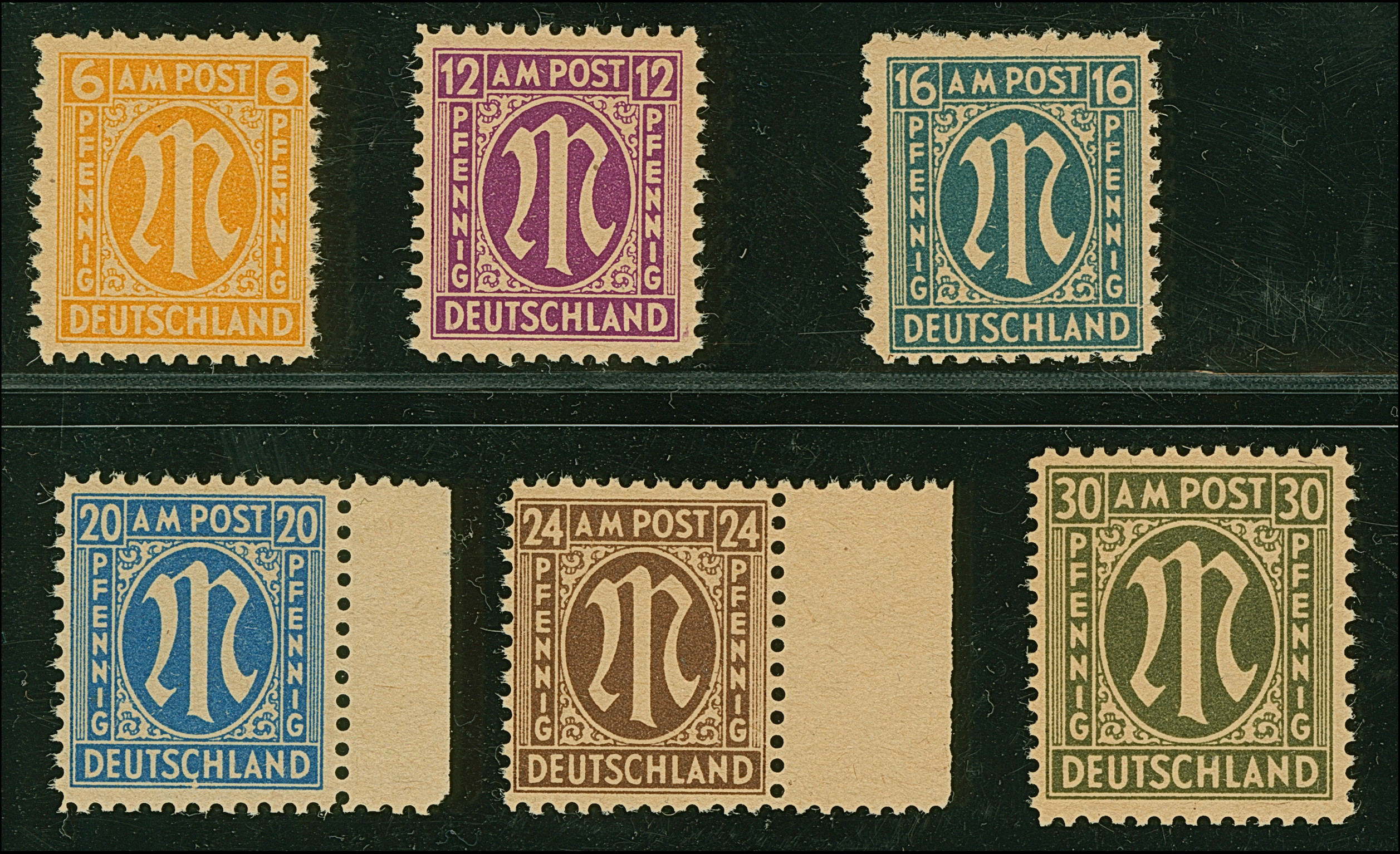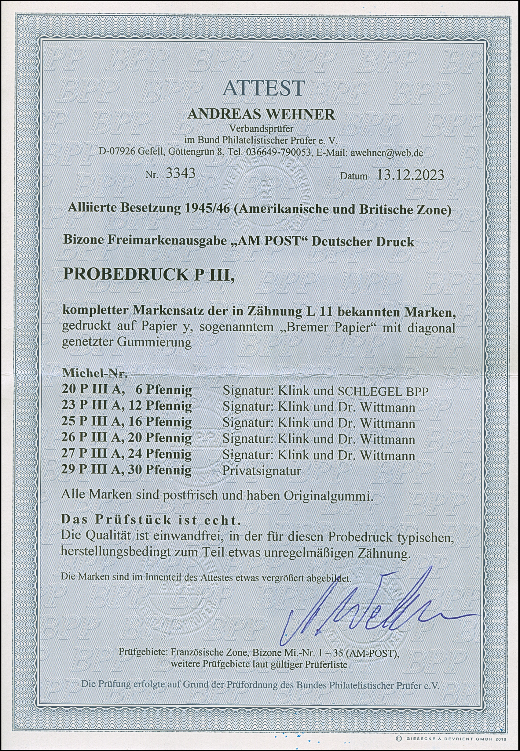 1945, Deutscher Druck, Probedrucke auf Bremer Papier, 6-30 Pfg., postfrisch, tadellos, u.a. sign. Klink sowie Fotoattest Wehner BPP (2023)