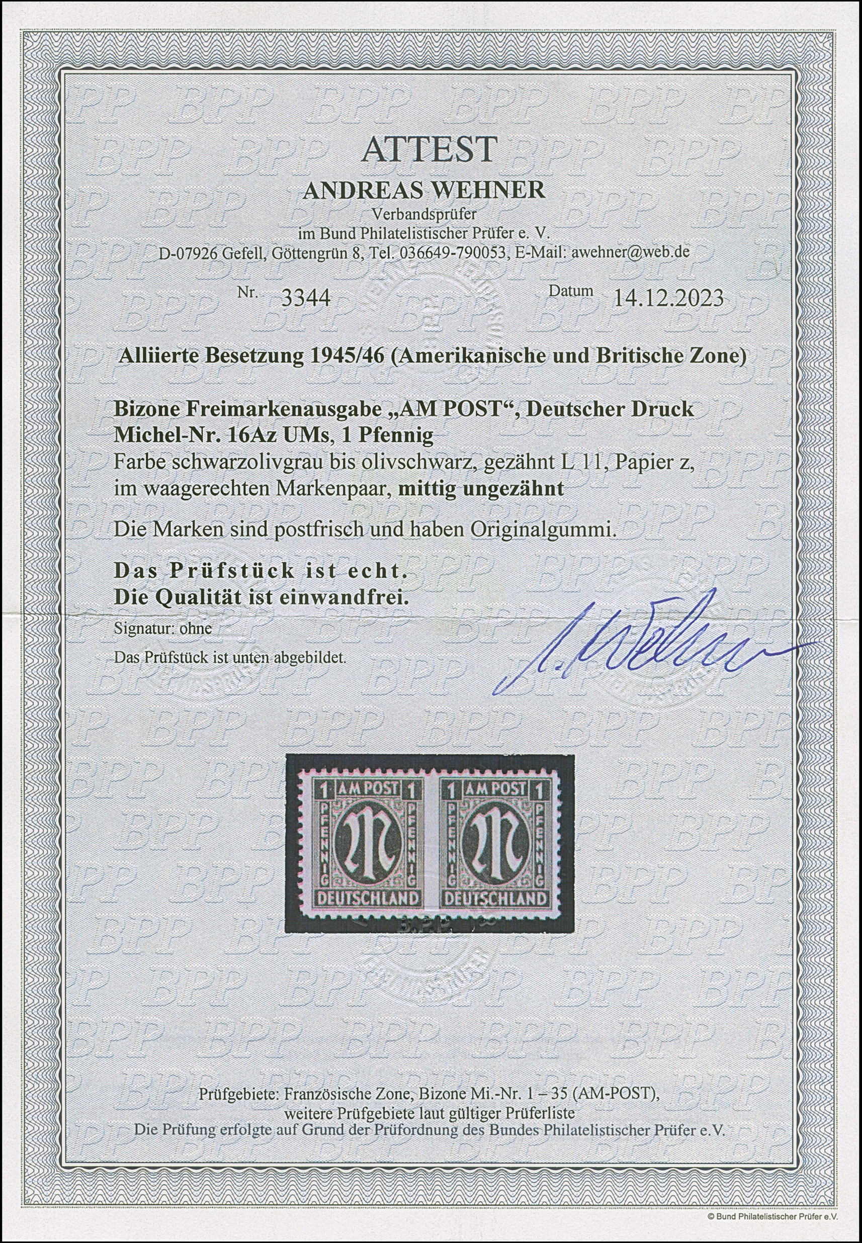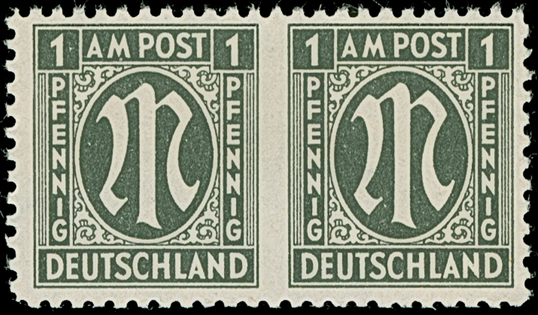 1945, Deutscher Druck, 1 Pfg. schwarzoliv, waagerechtes Paar, mittig ungezähnt, postfrisch, tadellos, Fotoattest Wehner BPP (2023)