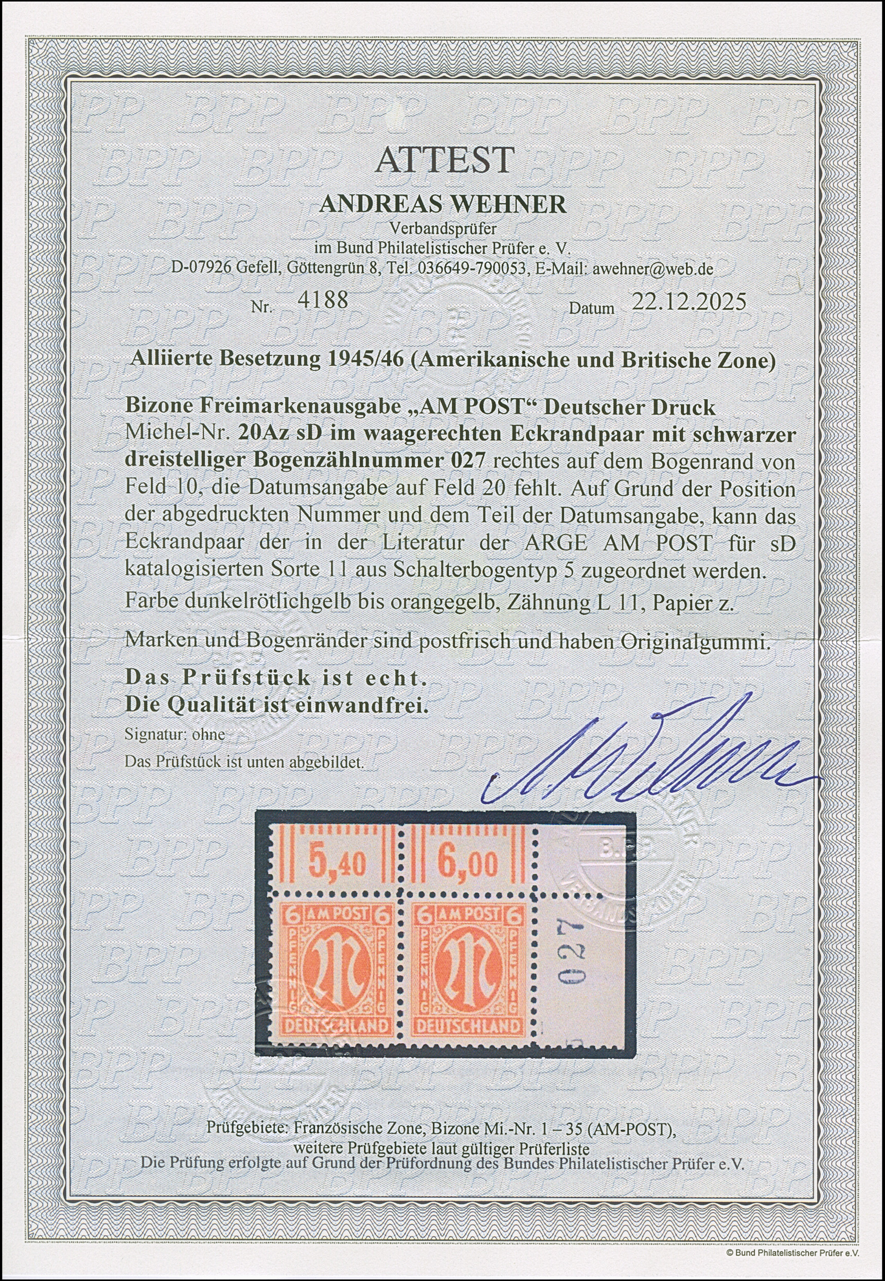 1945, Deutscher Druck, 6 Pfg., gez. 11, waagerechtes Paar aus der rechten oberen Bogenecke mit schwarzer, dreistelliger Bogenzählnummer “027”, postfrisch, tadellos, Fotoattest Wehner BPP (2025)