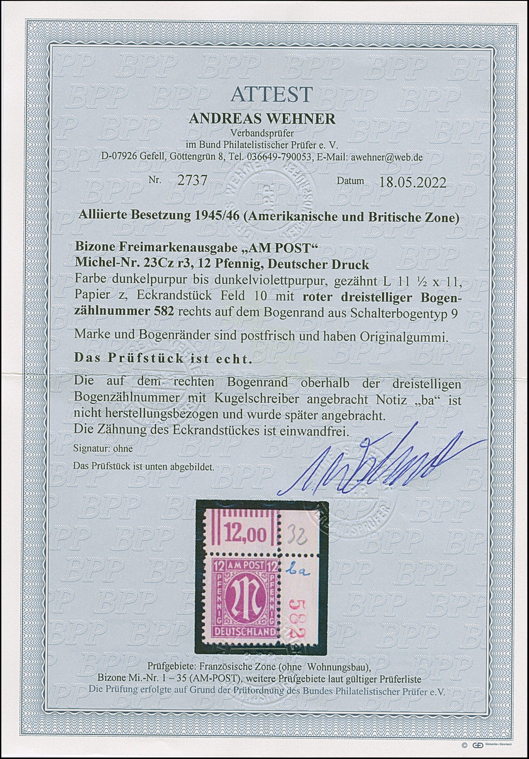 1945, Deutscher Druck, 12 Pfg., gez. 11½:11, rechte obere Bogenecke mit roter, dreistelliger Bogenzählnummer “582”, postfrisch, kleine Notiz im Rand, sonst tadellos, Fotoattest Wehner BPP (2022)