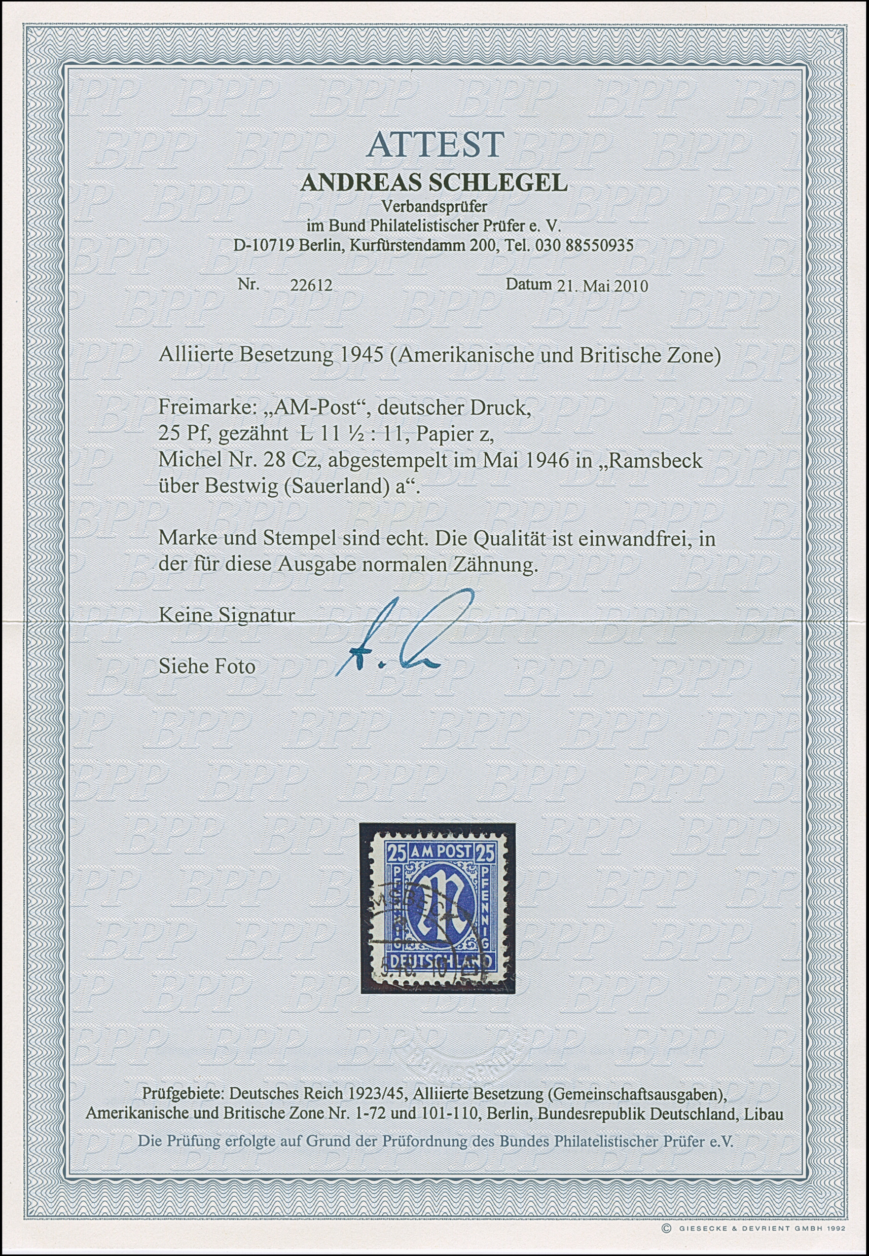 1945, Deutscher Druck, 25 Pfg., gez. 11½:11, sauber gestempelt, ausgabetypisch gezähnt, tadellos, Fotoattest Schlegel BPP (2010)