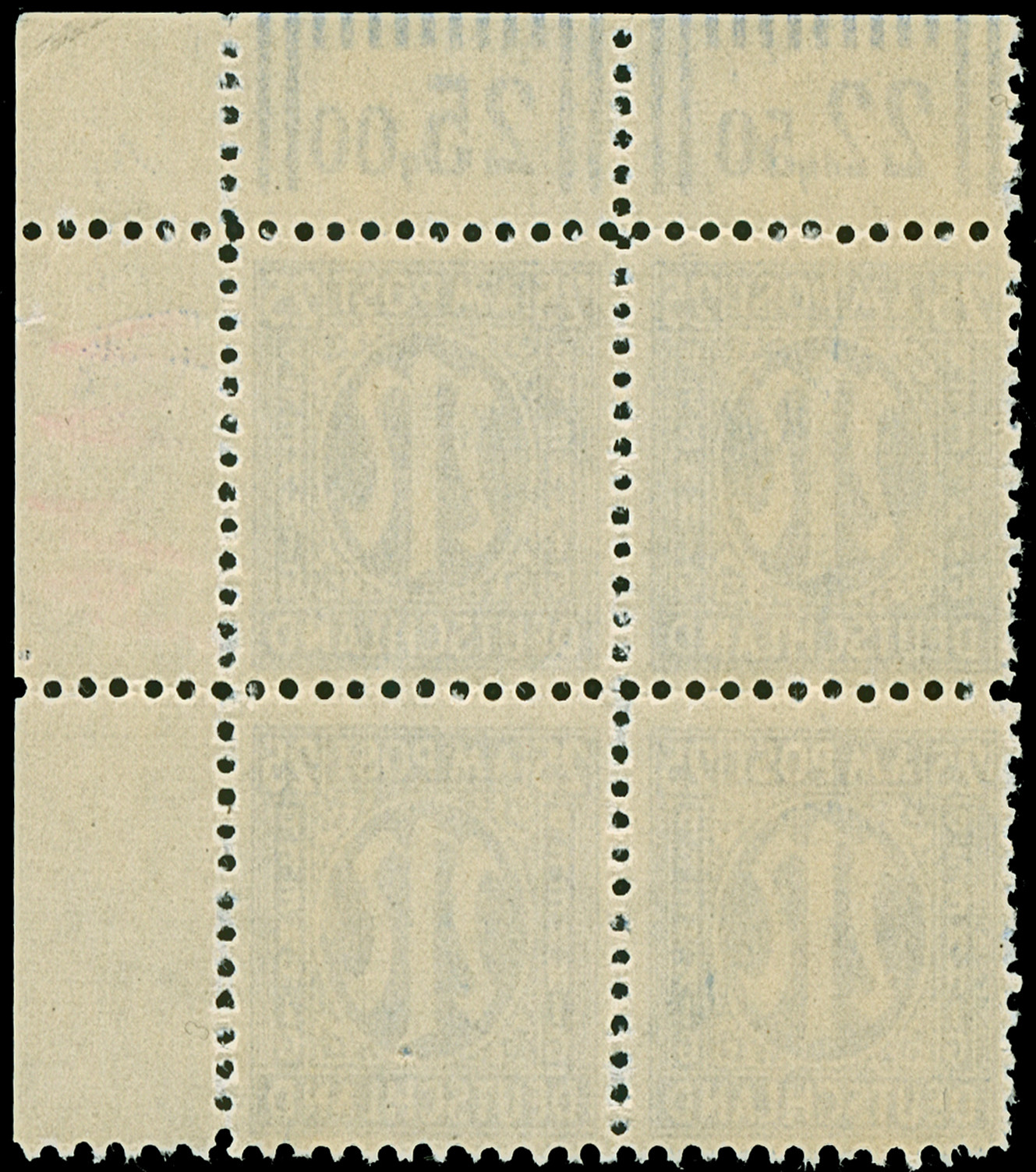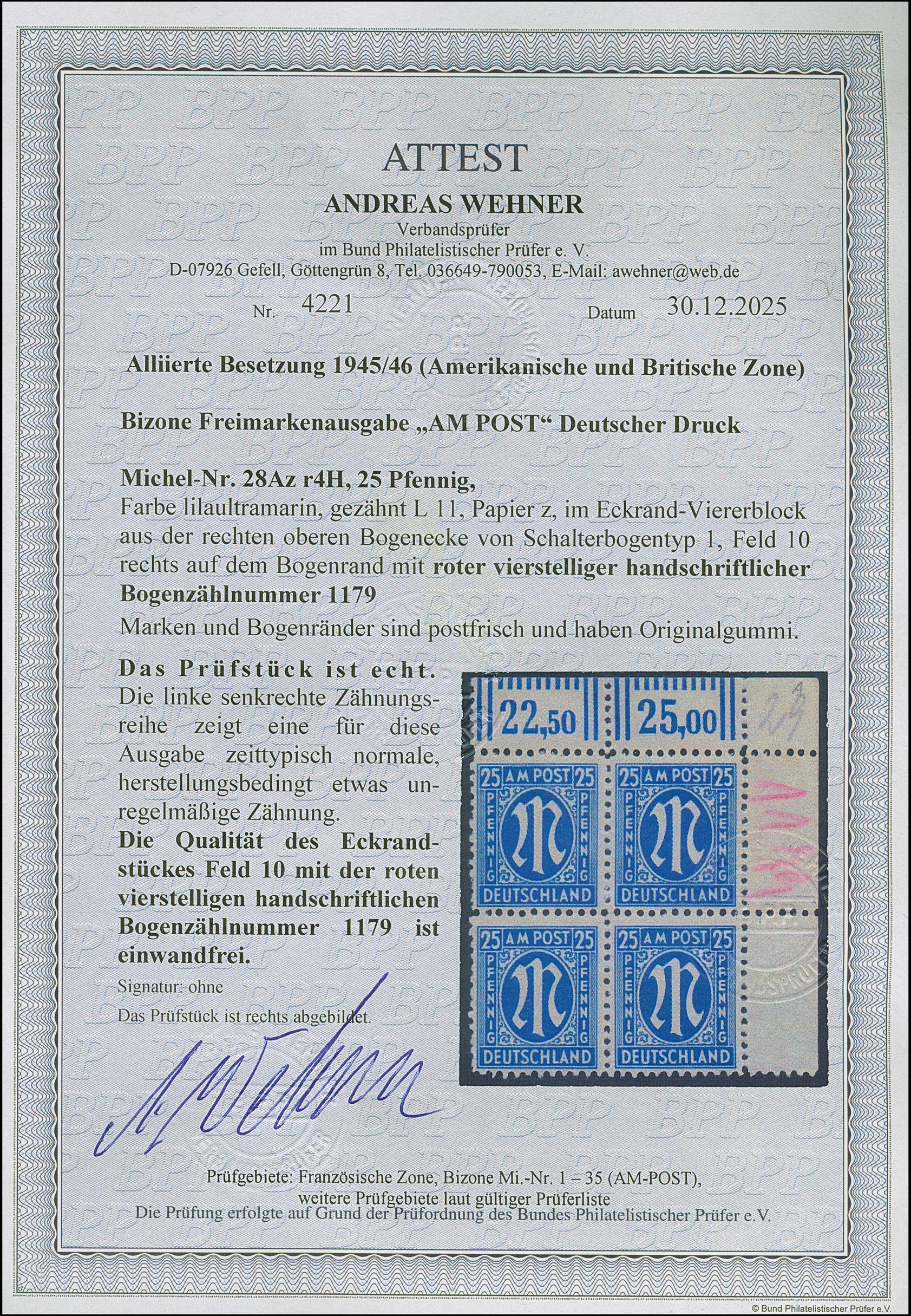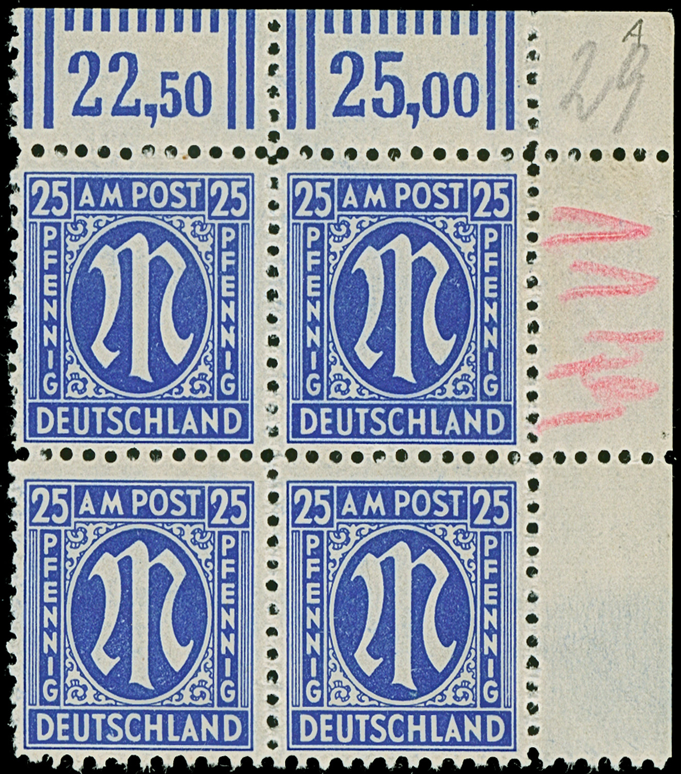 1945, Deutscher Druck, 25 Pfg., gez. 11, Viererblock aus der rechten oberen Bogenecke mit handschriftlicher, roter, vierstelliger Bogenzählnummer “1179”, postfrisch, winzige “Druckstellen”, tadellos, Fotoattest Wehner BPP (2025)