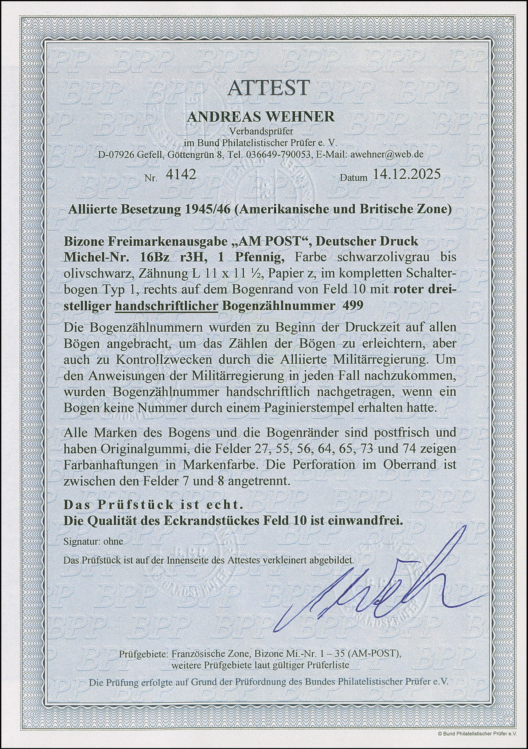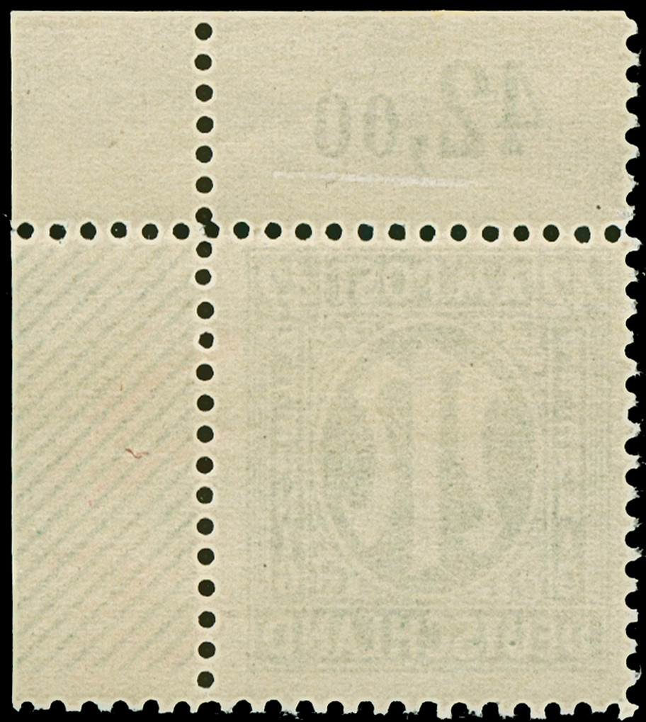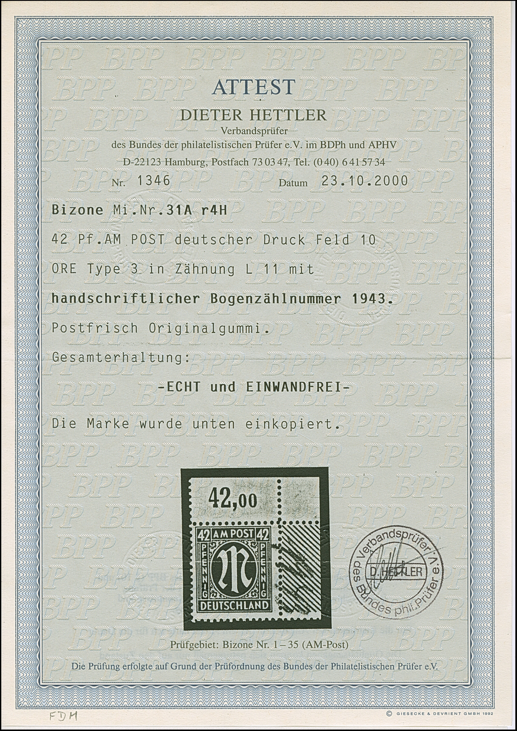 1945, Deutscher Druck, 42 Pfg., gez. 11, rechte obere Bogenecke mit handschriftlicher, roter, vierstelliger Bogenzählnummer “1943”, postfrisch, tadellos, Fotoattest Hettler BPP (2000)