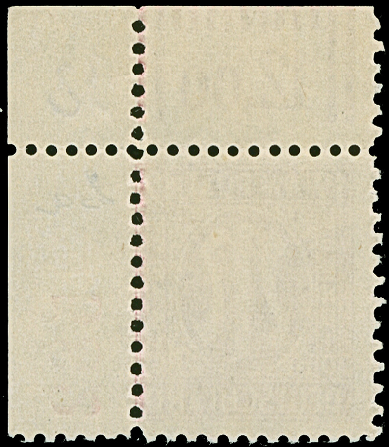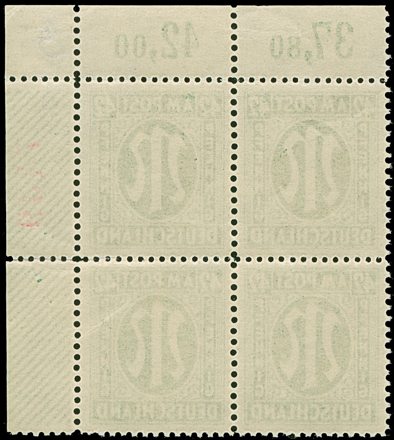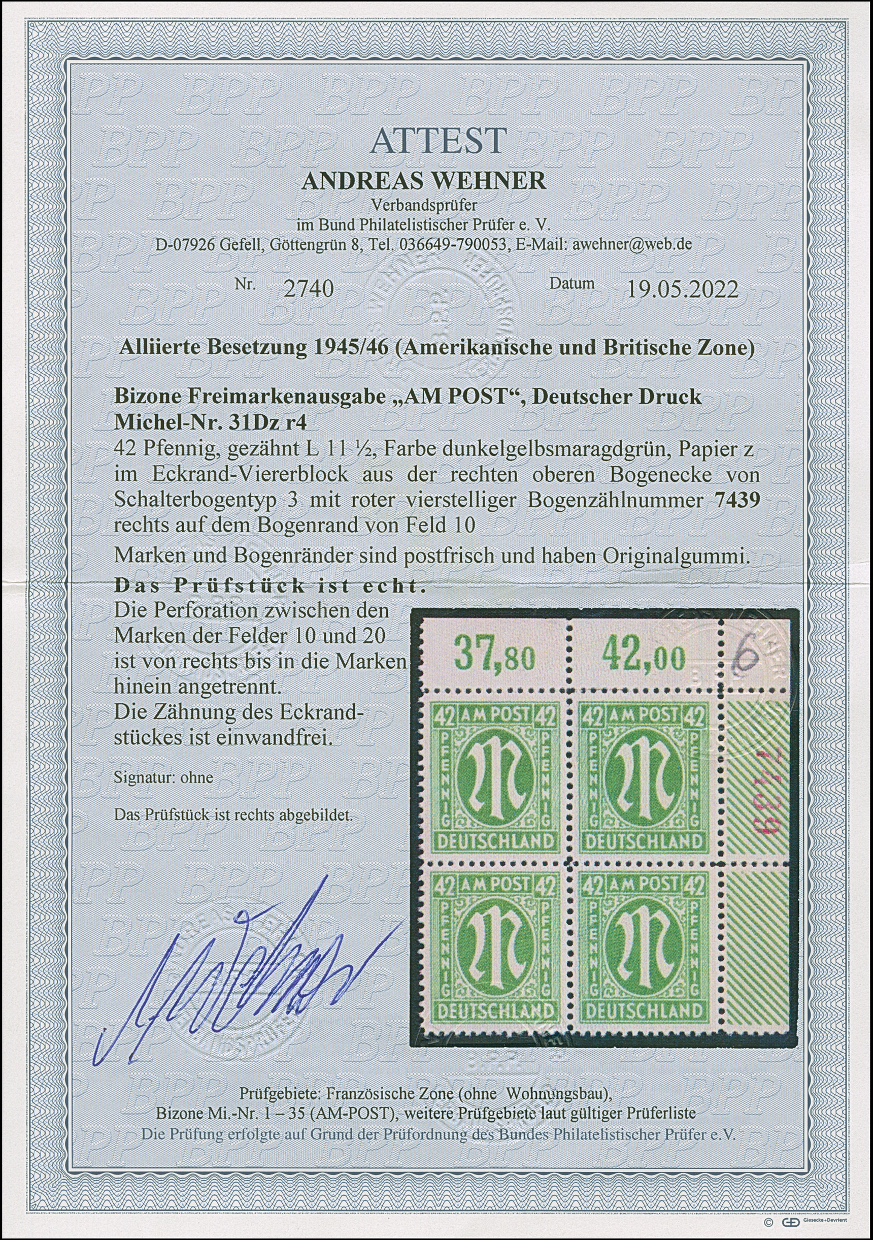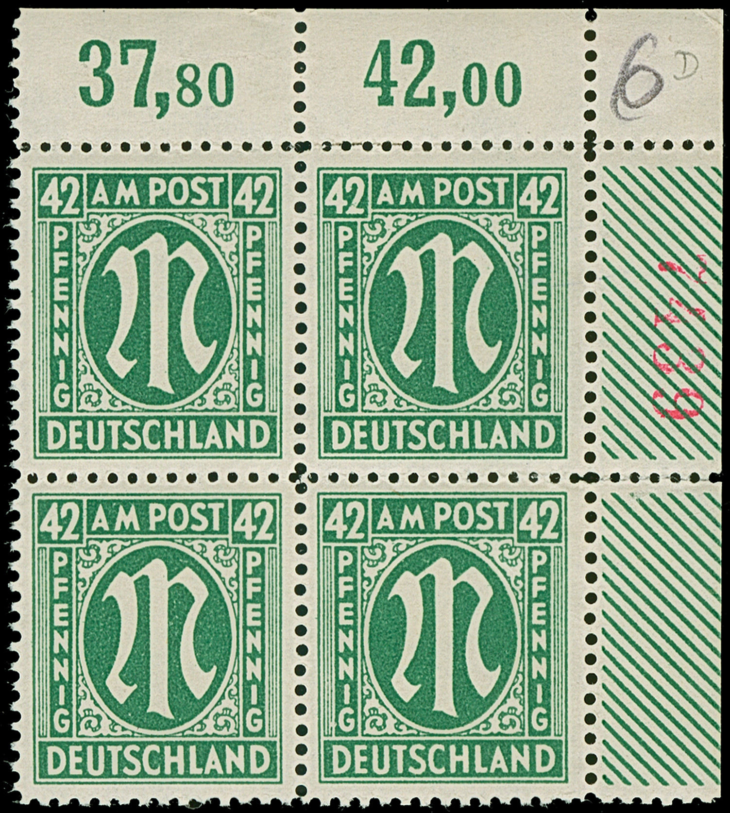 1945, Deutscher Druck, 42 Pfg., gez. 11½, Viererblock aus der rechten oberen Bogenecke, mit roter, vierstelliger Bogenzählnummer “7439”, postfrisch, waagerecht zwischen Feld 10 und 20 etwas angetrennt, tadellos, Fotoattest Wehner BPP (2022)