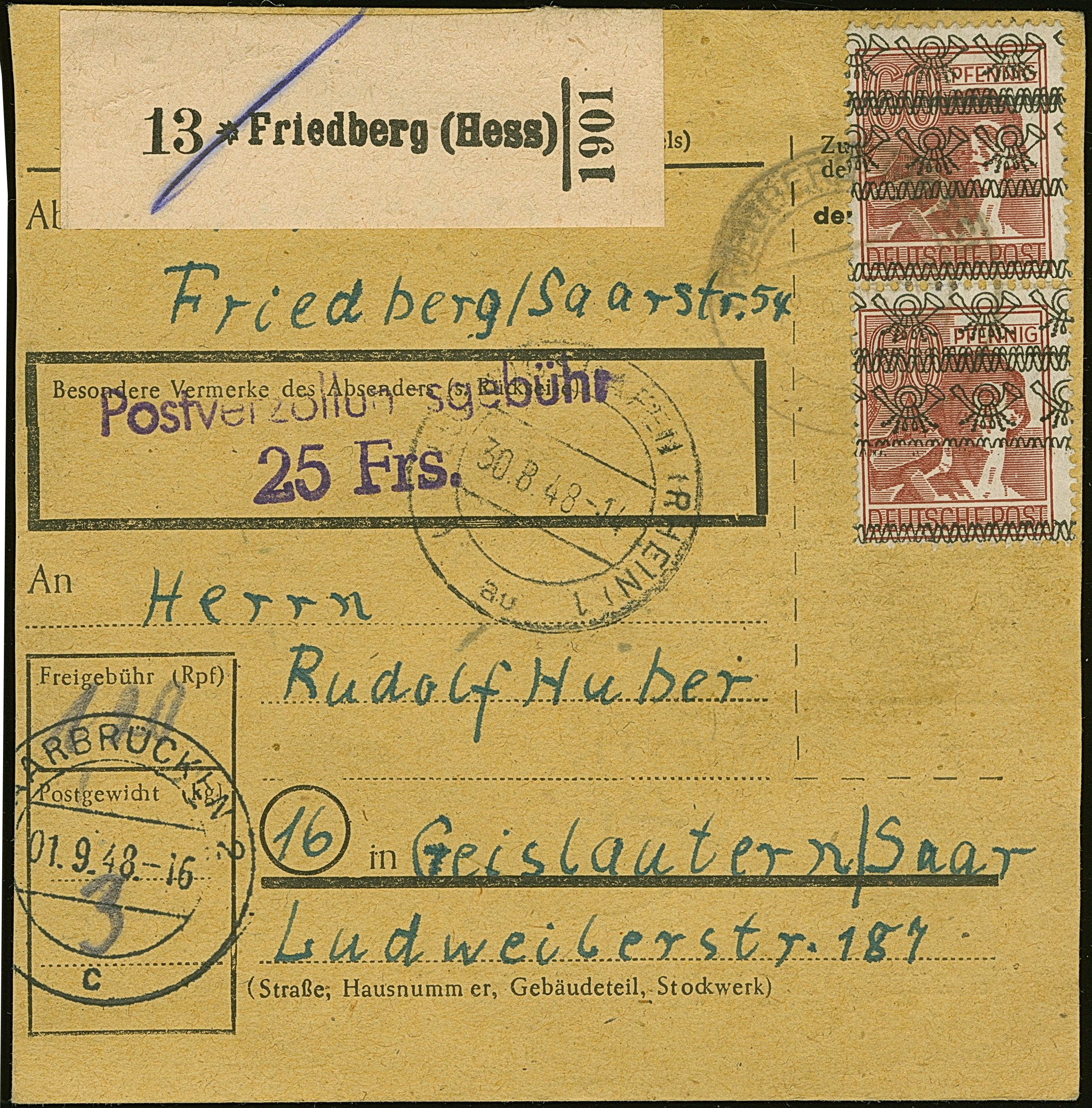 Band auf Arbeiter 60 Pfg. karminbraun mit doppeltem Aufdruck im senkrechten Paar mit Stempel “FRIEDBERG…8.48” als tarifgerechte Mehrfachfrankatur auf Paketkarte via Ludwigshafen und Saarbrücken mit violettem L2 “Postverzollungsgebühr 25 Frs.” nach Geislautern mit Ankunftsstempel von Völklingen, gute Erhaltung. Eine Mehrfachfrankatur mit dieser Aufdruck-Abart ist aus dem Bedarf selten