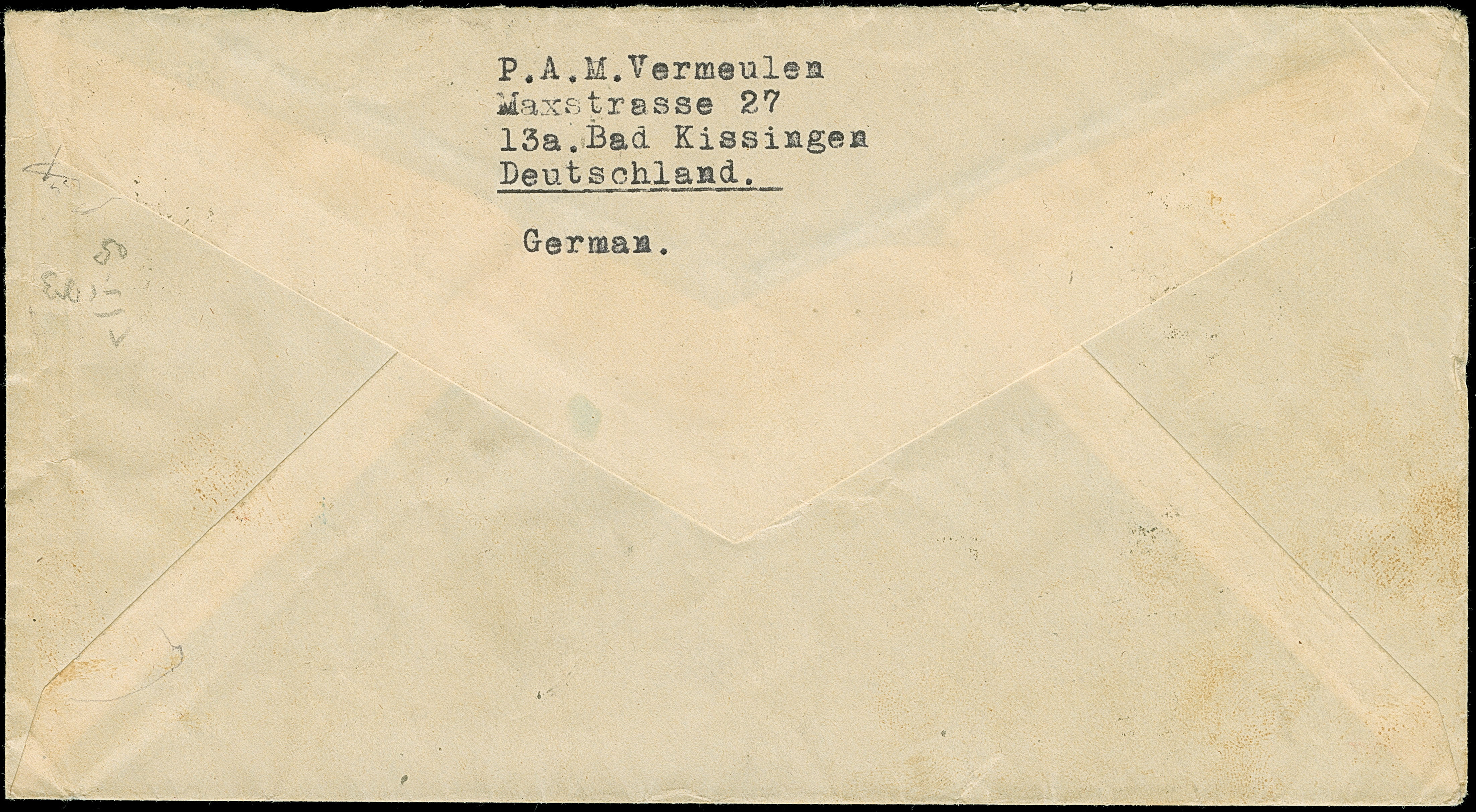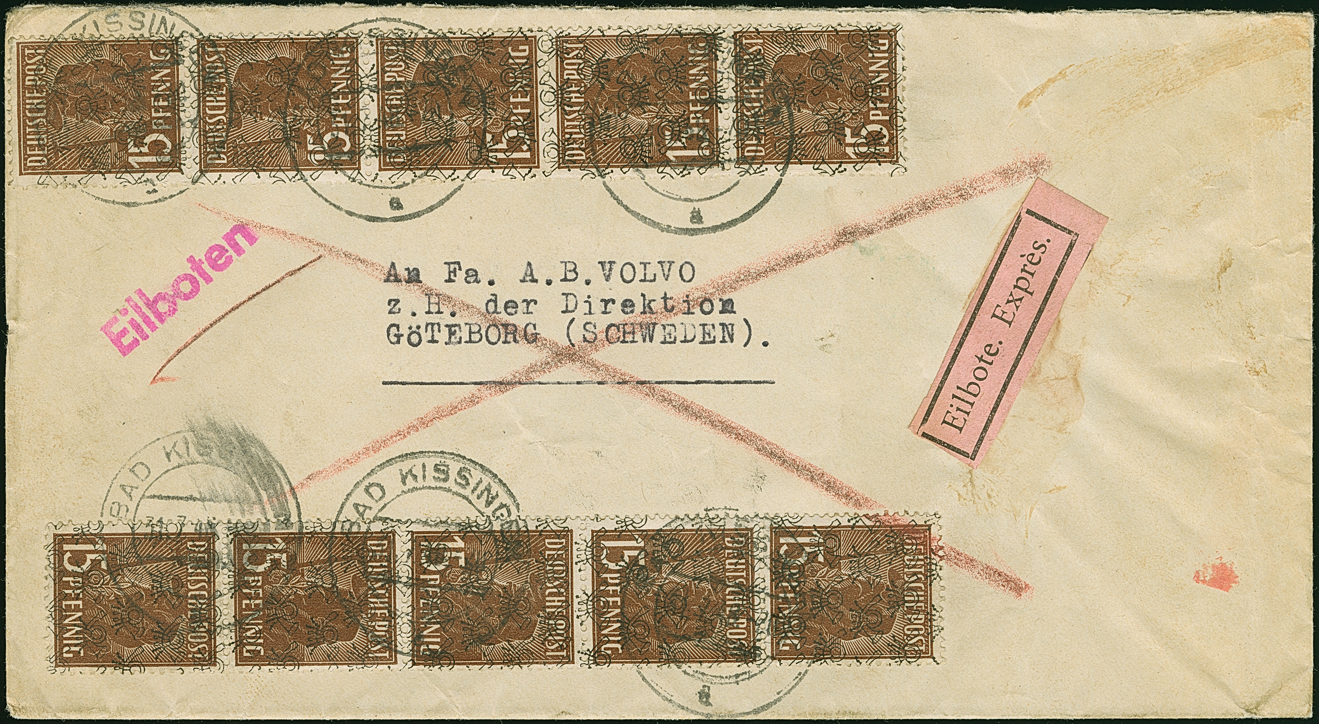 Netz auf Arbeiter 15 Pfg., zwei senkrechte 5er-Streifen je mit Stempel “BAD KISSINGEN 31.7.48” als tarifgerechte Frankatur auf Eilboten-Briefe bis 20 g nach Göteborg. Der Umschlag mit Beförderungsspuren und etwas verschmutzt sowie zwei Marken mit kleinen Eckzahnbügen, ansonsten in guter Erhaltung. Mit dieser Verwendung eine außergewöhnliche Mehrfachfrankatur