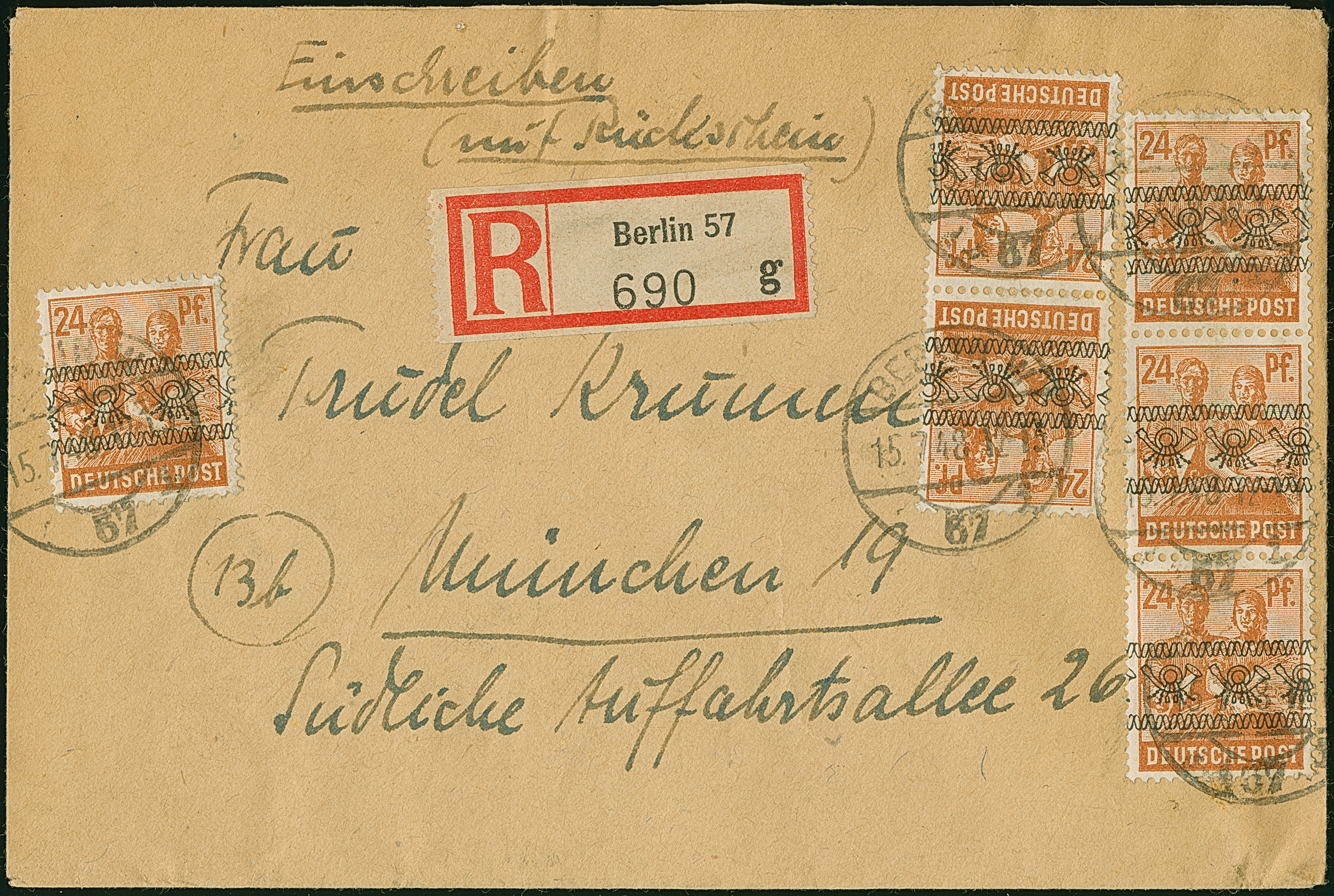Band auf Arbeiter 24 Pfg. im senkrechten Dreierstreifen und Paar sowie Einzelmarke je mit Stempel “BERLIN W57 15.7.48" als tarifgerechte Mehrfachfrankatur auf R-Rückschein-Brief nach München mit Ankunftsstempel. Eine Marke mit kleinem Eckzahnbug, ansonsten in einwandfreier Erhaltung. Eine nicht häufige Mehrfachfrankatur