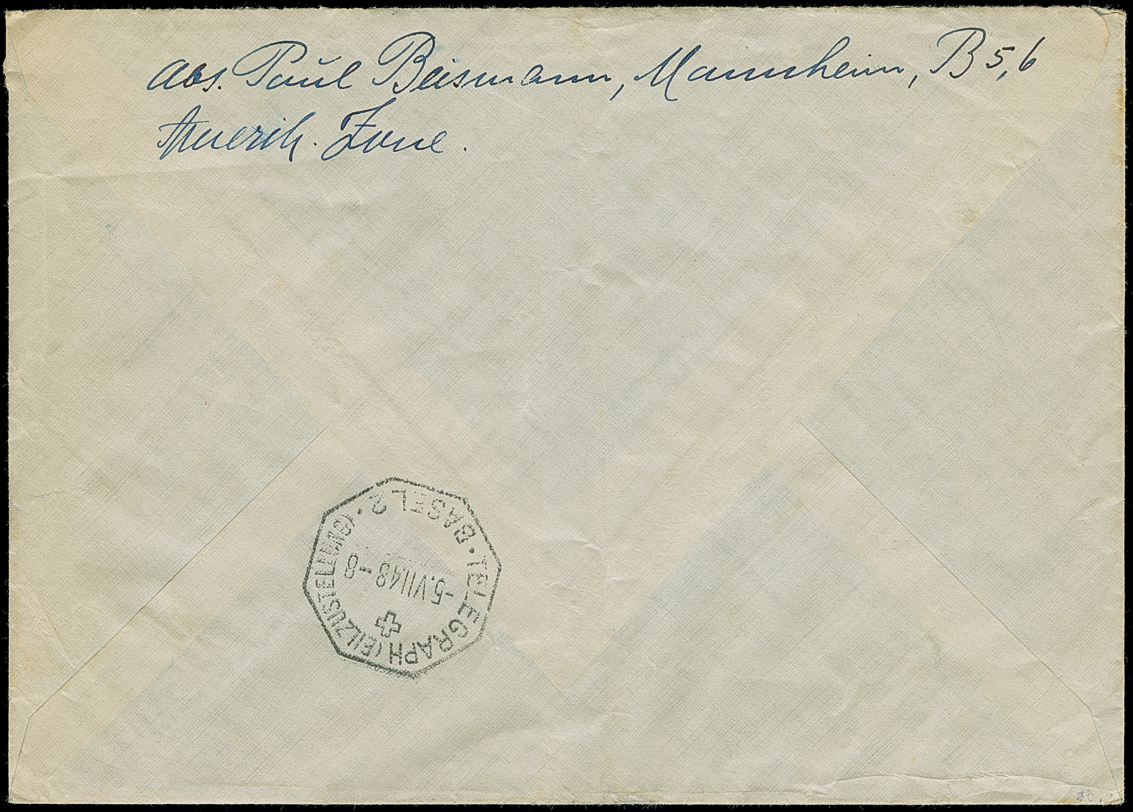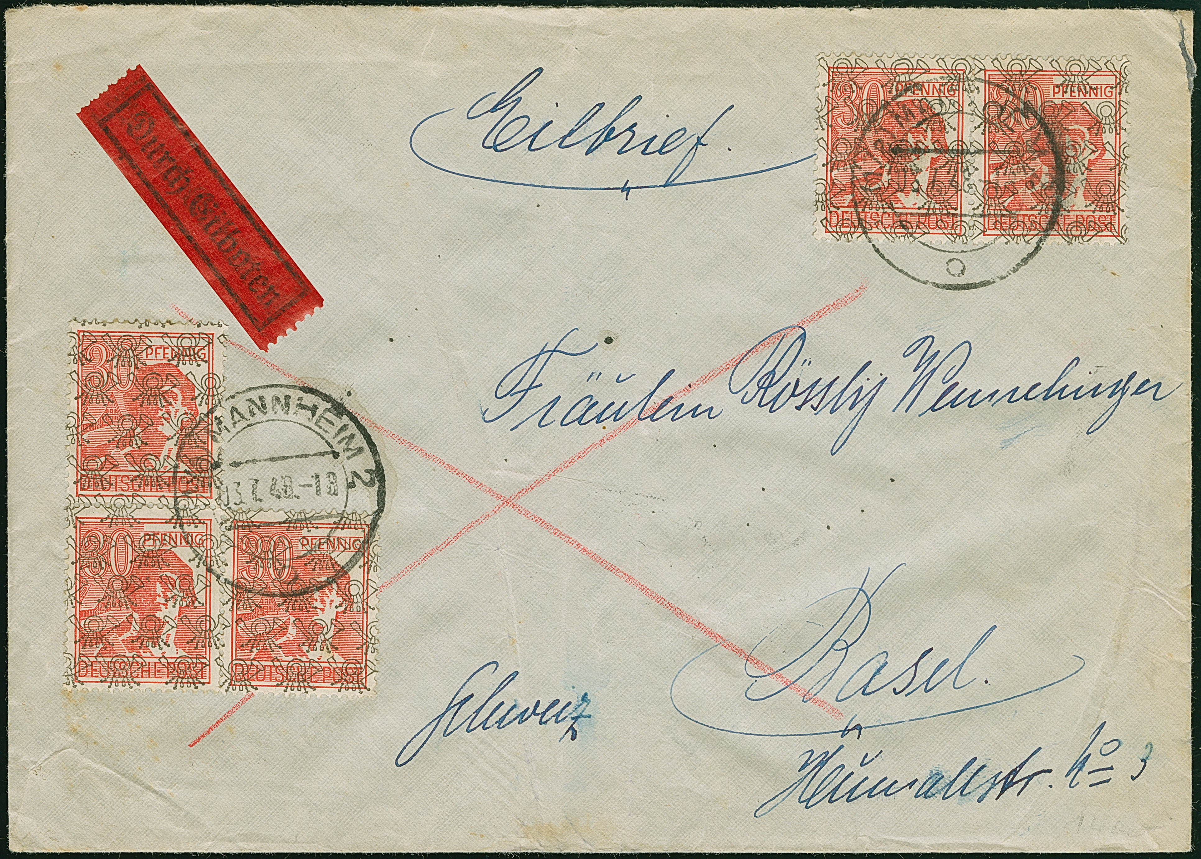 Netz auf Arbeiter 30 Pfg. im waagerechten und senkrechten Paar sowie Einzelmarke je mit Stempel “MANNHEIM 3.7.48” als tarifgerechte Mehrfachfrankatur auf Eilboten-Brief bis 20 g nach Basel mit Ankunftsstempel. Der Umschlag mit senkrechten Faltspuren und Beförderungsspuren im Rand, ansonsten in guter Erhaltung