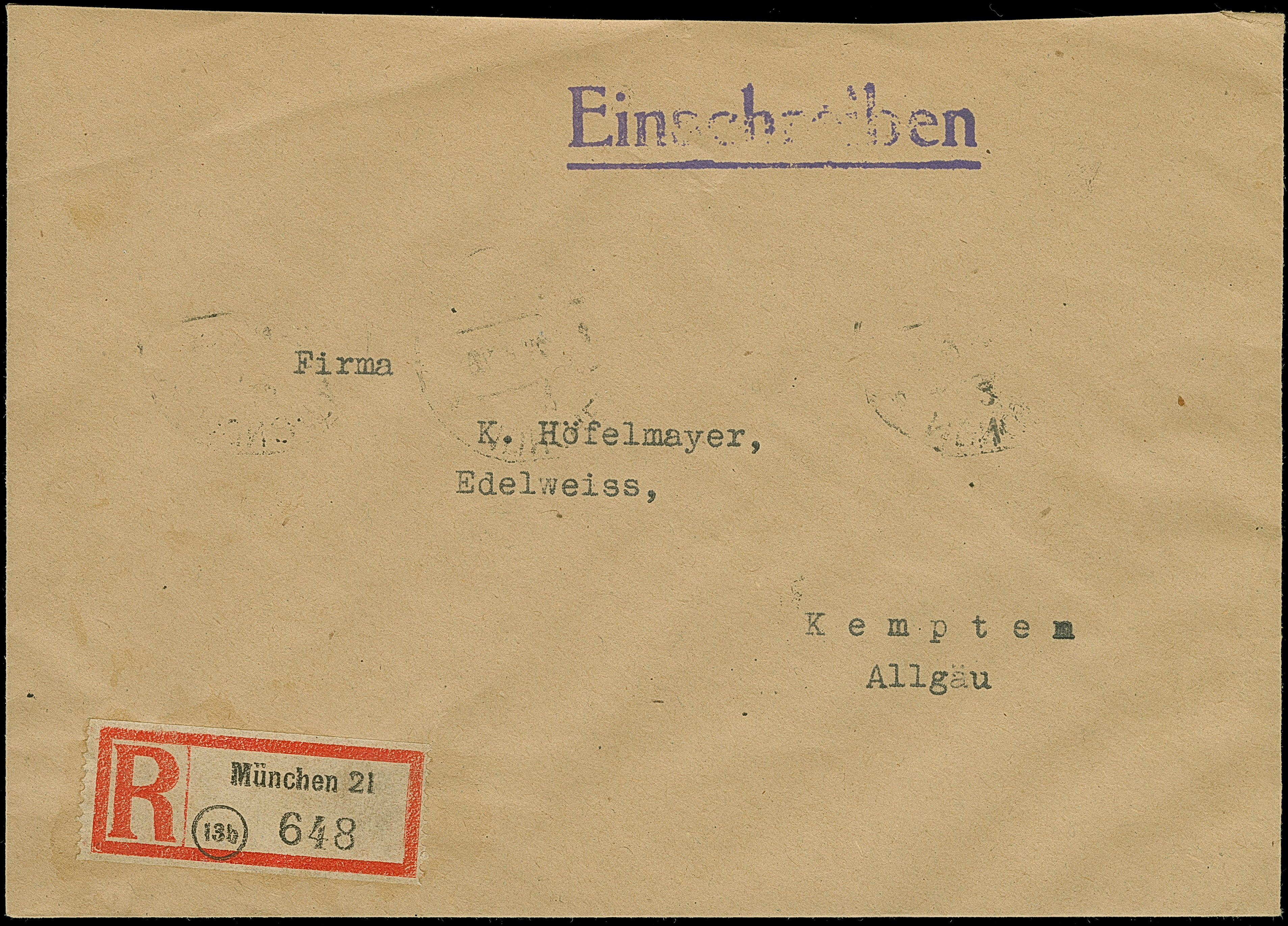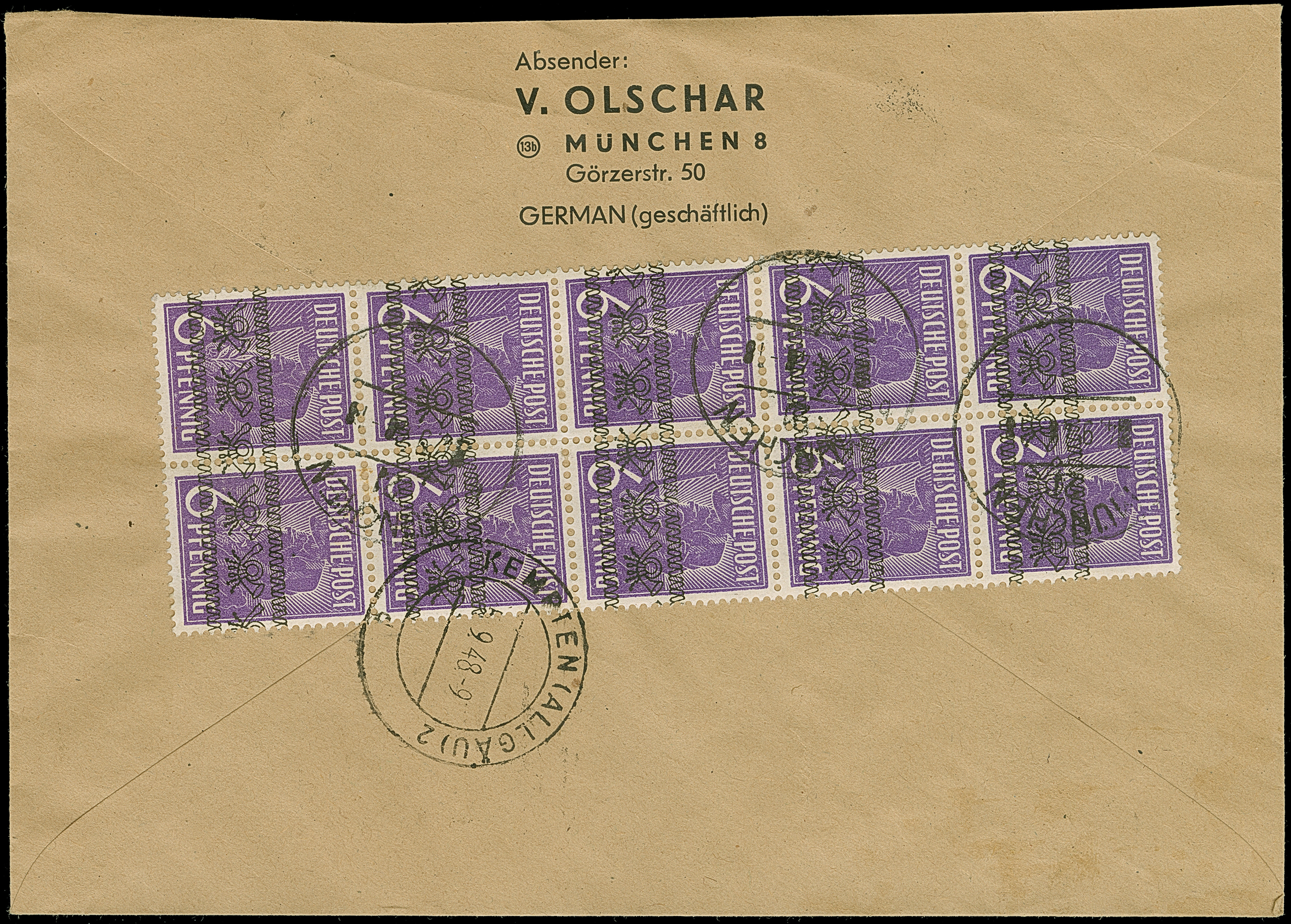 Band auf Arbeiter 6 Pfg. im senkrechten 10er-Block mit Stempel “MÜNCHEN 4.9.48” als tarifgerechte Mehrfachfrankatur rückseitig auf R-Brief nach Kempten mit Ankunftsstempel, in einwandfreier Erhaltung