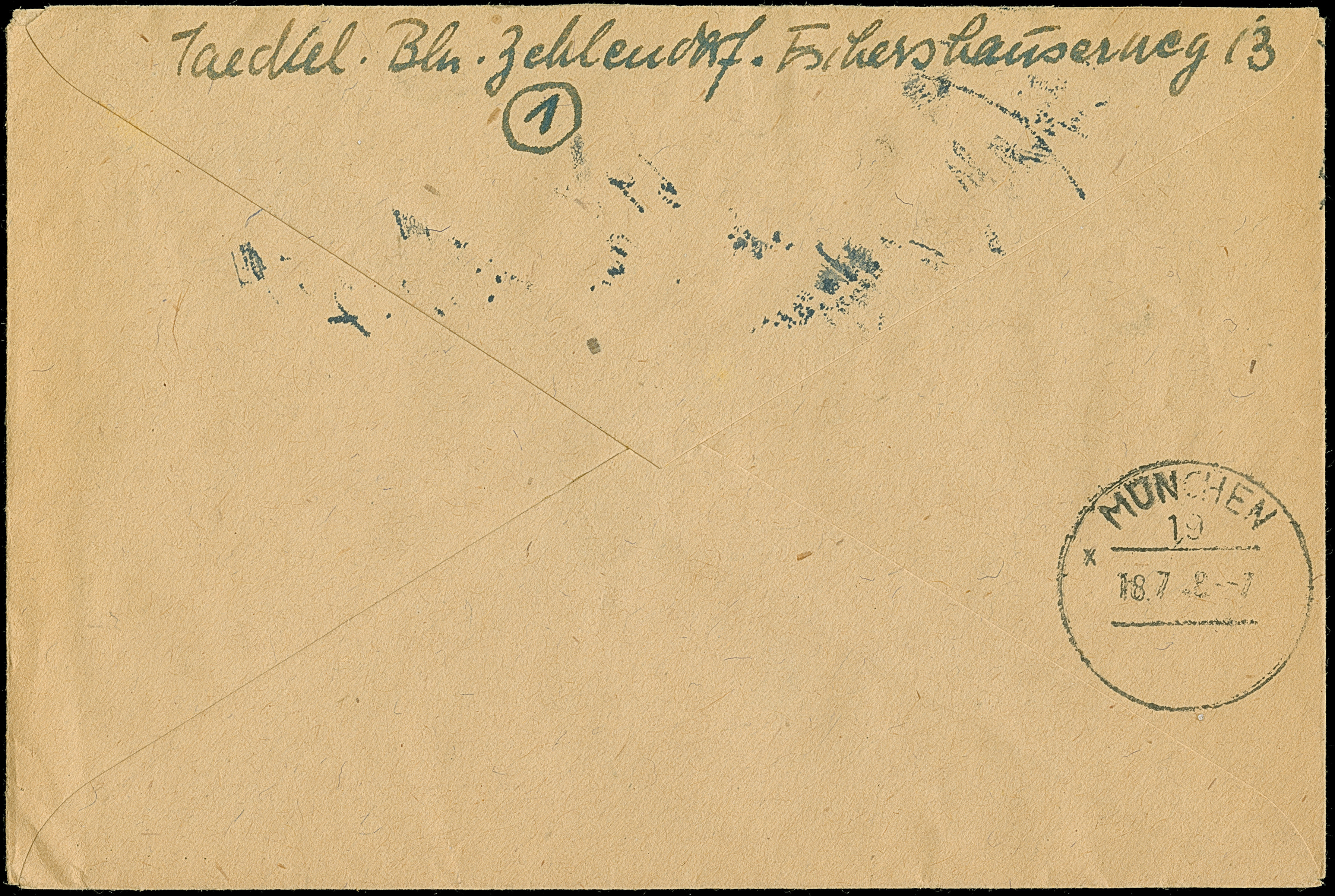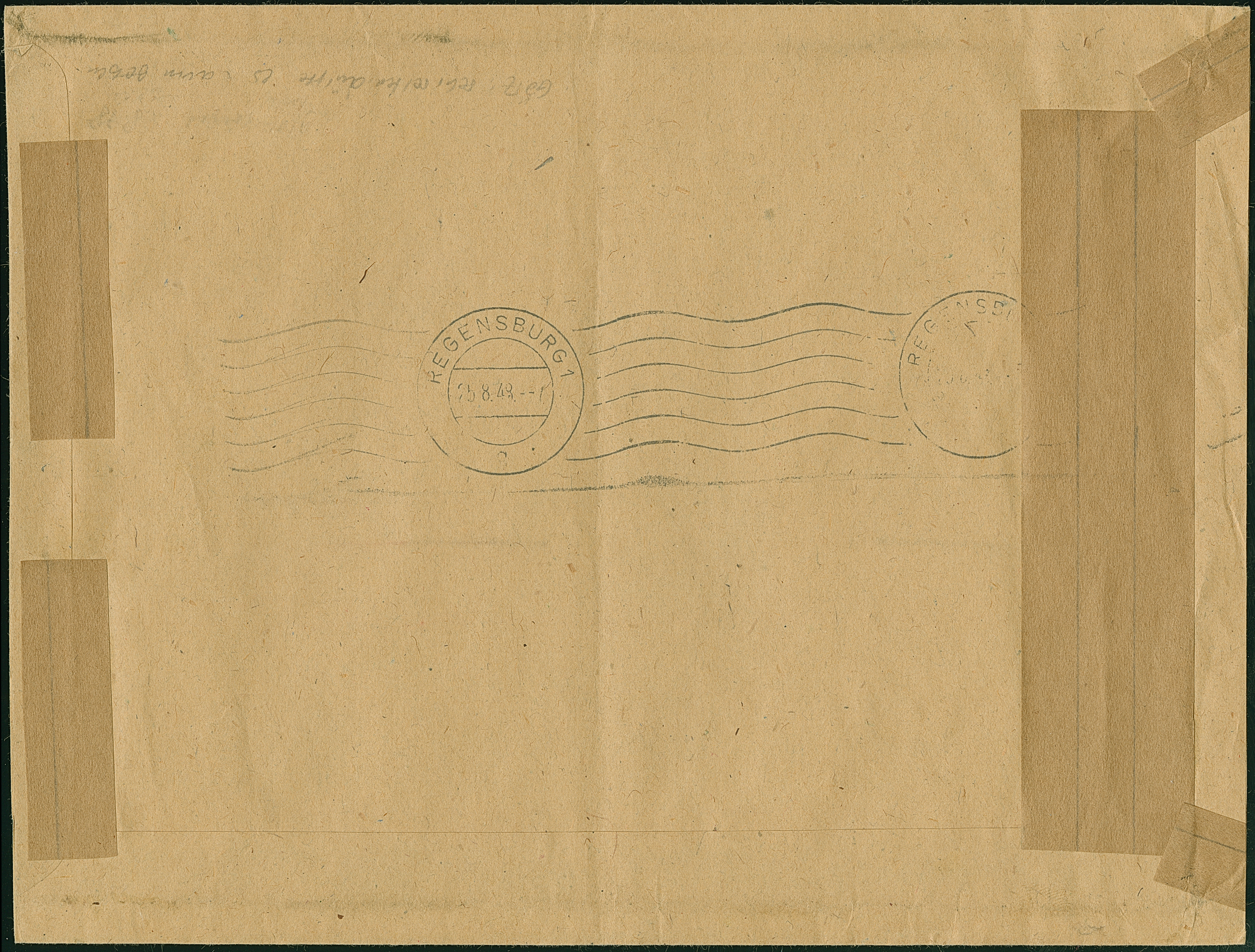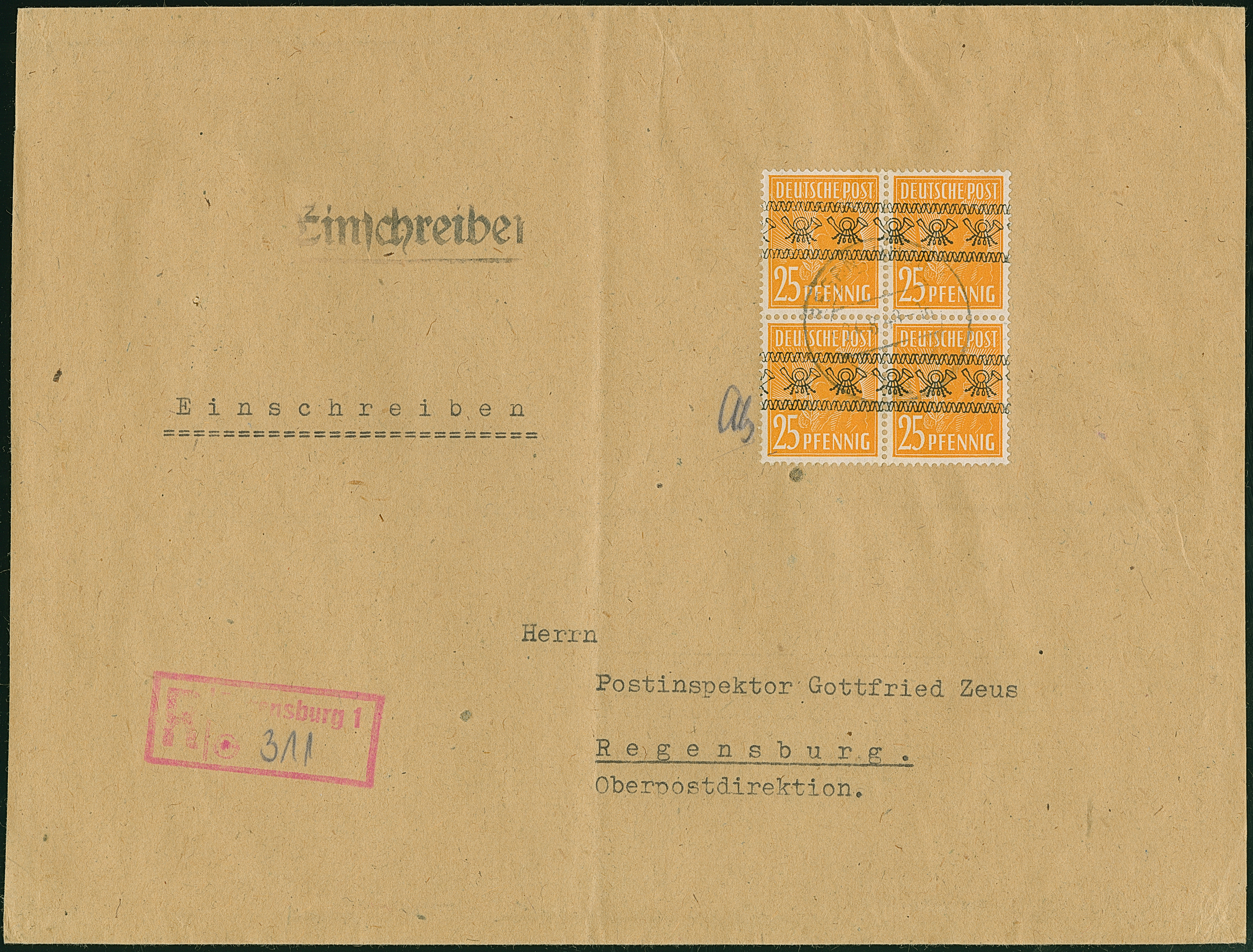 Band auf Arbeiter 25 Pfg. im Viererblock mit Stempel “REGENSBURG 24.8.48” als tarifgerechte Mehrfachfrankatur auf R-Ortsbrief über 251 g. mit Handrollstempel als Ankunftsstempel. Der Umschlag mit senkrechter Faltung, ansonsten in einwandfreier Erhaltung