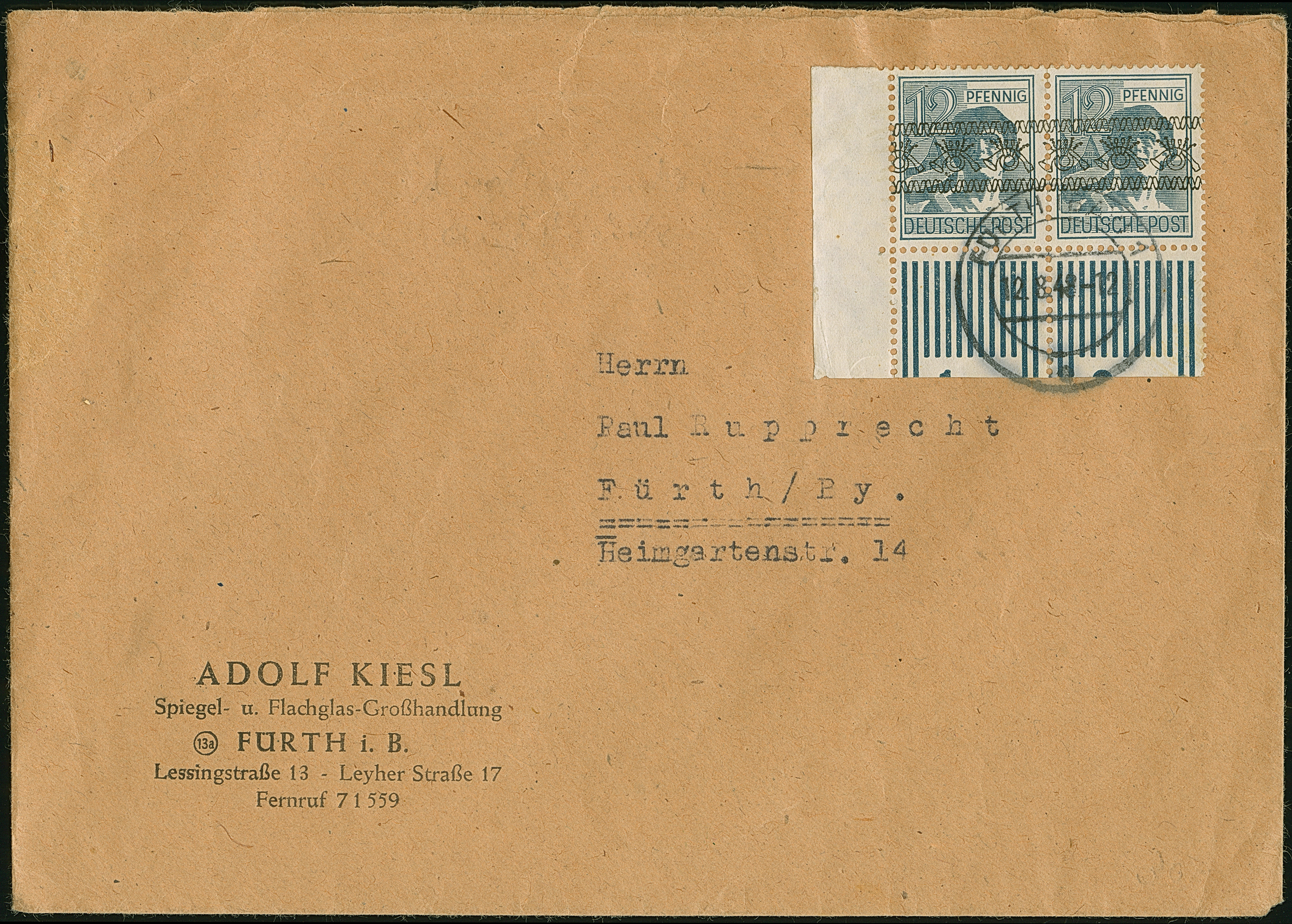 Band auf Arbeiter 12 Pfg. mit kopfstehendem Aufdruck im waagerechten Paar aus der linken unteren Bogenecke mit Stempel “FÜRTH 12.8.48” auf Brief nach Fürth. Durch Bogenverschnitt sind unten ein Teil der Reihenwertzahlen sichtbar. In dieser Form auf Brief selten
