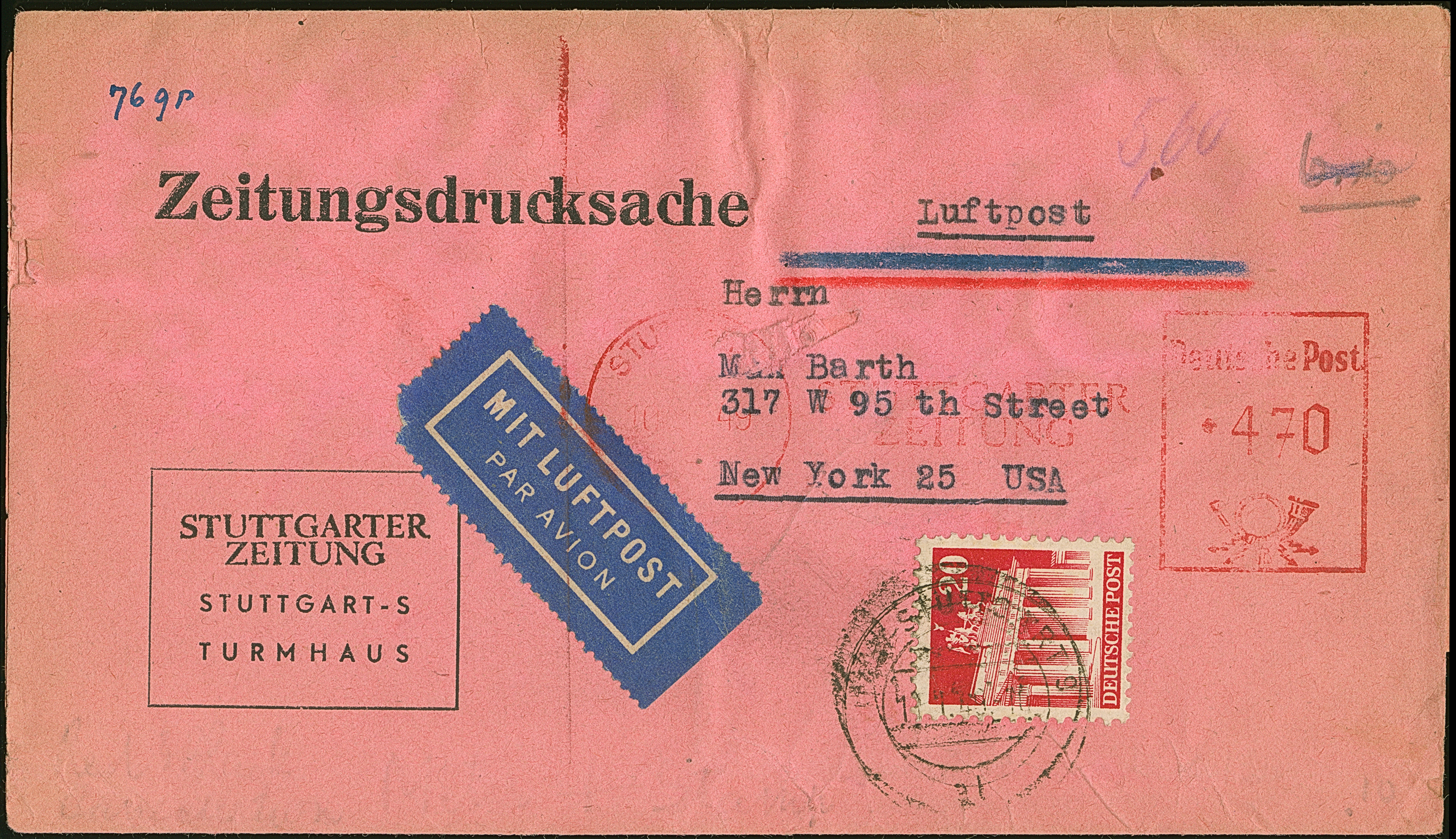 1948, Bauten 20 Pfg. rot mit Stempel “STUTTGART 11.10.49” auf Luftpost-Streifband bis 80 g mit Absenderfreistempel 470 Pfg. “STUTTGART 10.10.49 - Stuttgarter Zeitung” nach New York. Zu diesem Zeitpunkt waren Luftpost-Drucksachen noch nicht zugelassen, hier zum Jeia-Luftpost-Tarif für Briefe freigemacht und befördert. Das Streifband mit Beförderungsspuren im Rand, in guter Gesamterhaltung. Eine außergewöhnliche Verwendung aus der Frühzeit der Luftpost nach 1945