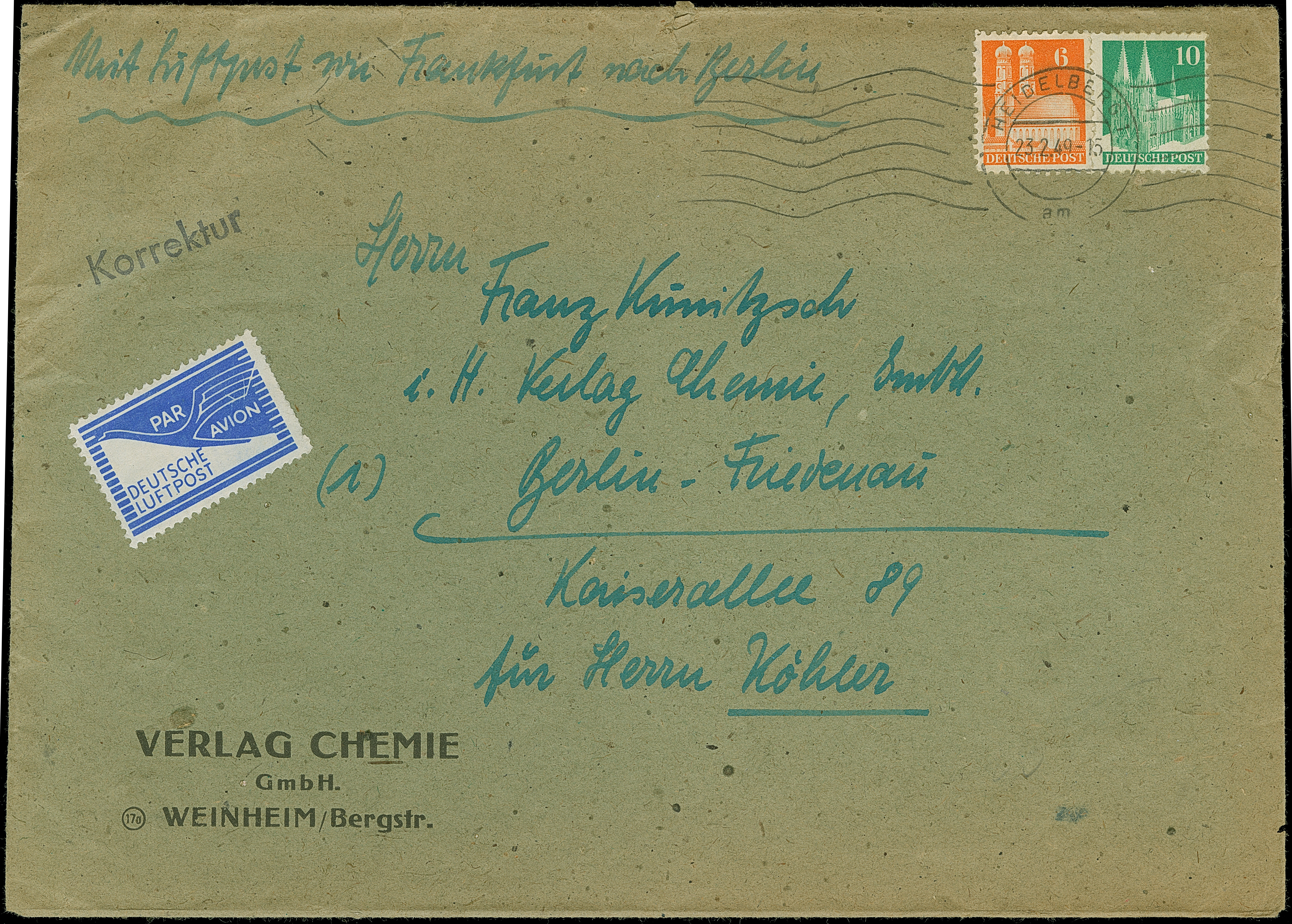 1948, Bauten 6 Pfg. orange und 10 Pfg. grün mit Handrollstempel “HEIDELBERG 23.2.49” als portogerechte Frankatur auf großformatigem Luftpost-Drucksachen-Umschlag bis 50 g mit L1 “Korrektur” nach Berlin. Der Umschlag mit leichten Randspuren, ansonsten in guter Erhaltung. Eine nicht häufig 16 Pfg.-Frankatur