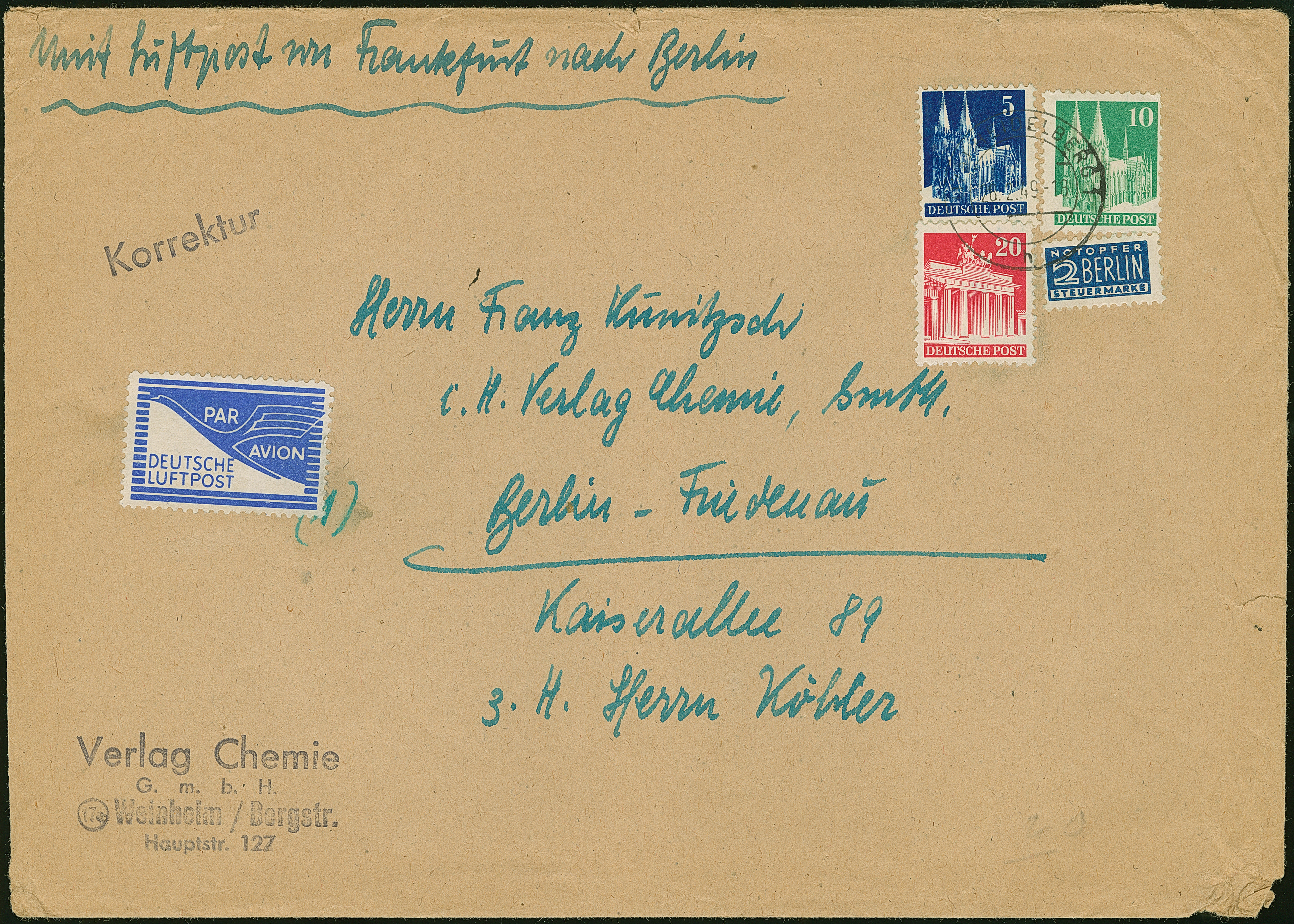 1948, Bauten 5 Pfg., 10 Pfg. und 20 Pfg. grün mit Stempel “HEIDELBERG 26.2.49” als portogerechte Frankatur auf großformatigem Luftpost-Drucksachen-Umschlag bis 100 g mit L1 “Korrektur” nach Berlin. Der Umschlag mit Randspuren und die Verschlußklappe ist fehlerhaft, ansonsten in guter Erhaltung. Eine äußerst seltene 35 Pfg.-Frankatur