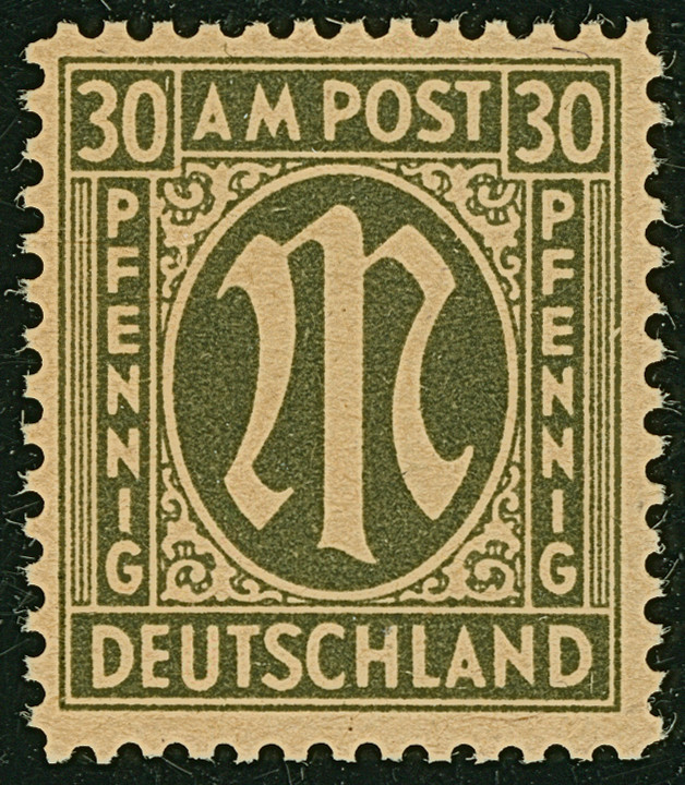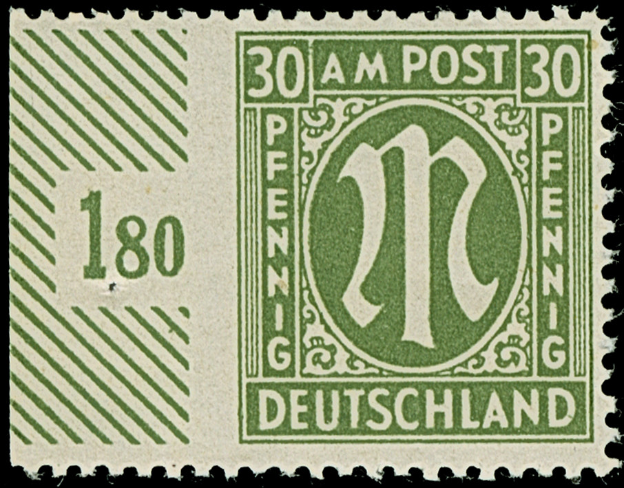 1945, Deutscher Druck, 30 Pfg. grünoliv, gez. 11½:11, linkes Seitenrandstück, links ungezähnt, postfrisch, tadellos, Befund Wehner BPP (2022)