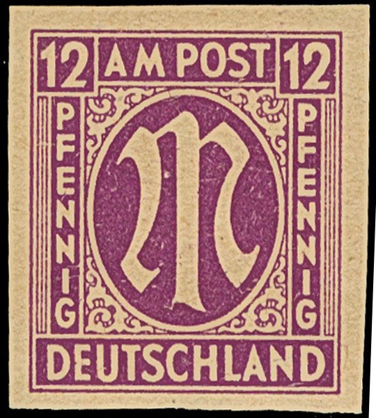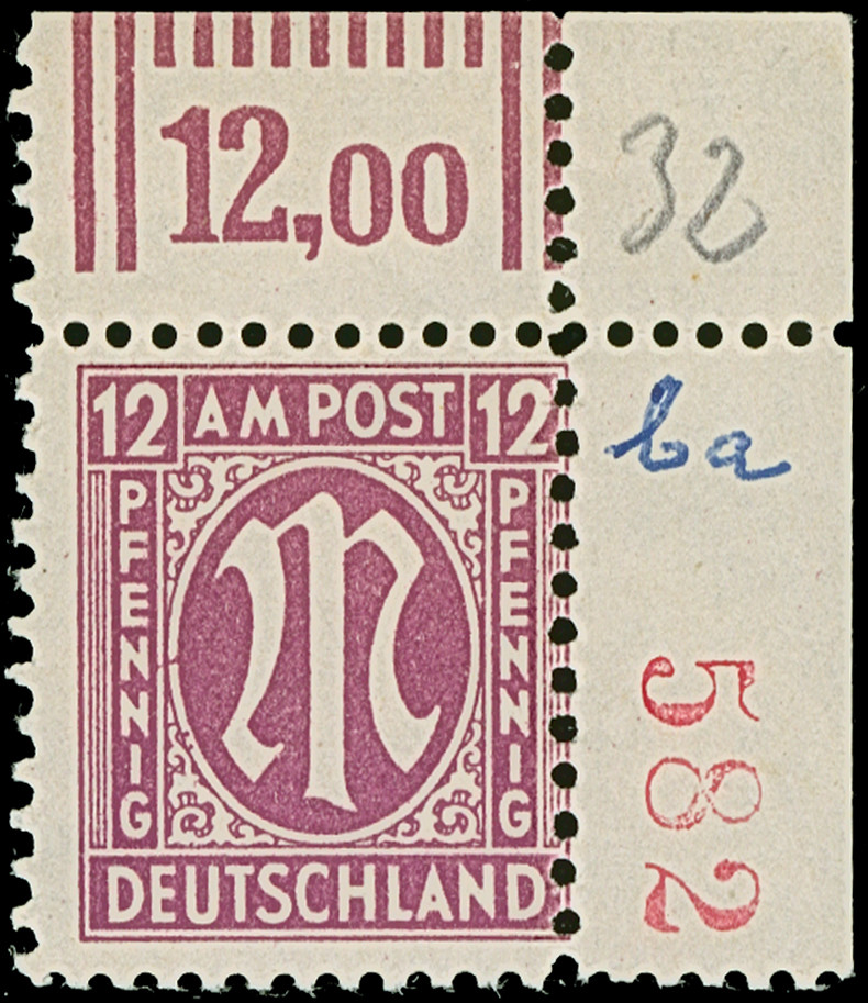 1945, Deutscher Druck, 12 Pfg., gez. 11, rechte obere Bogenecke mit roter, dreistelliger Bogenzählnummer “635”, postfrisch, nur im Oberrand Falz, tadellos, Befund Wehner BPP (2019)