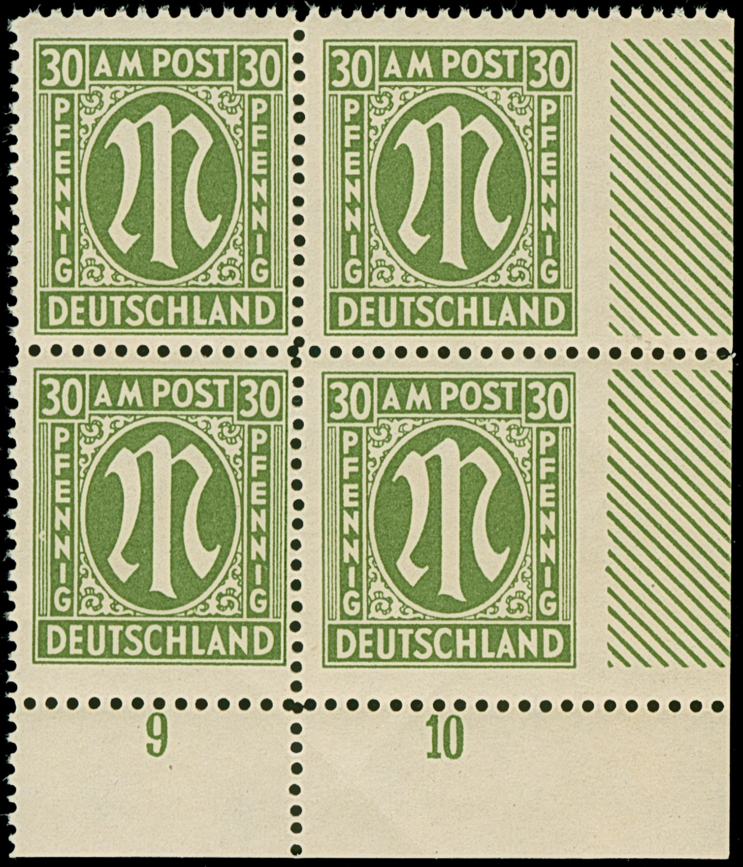 1945, Deutscher Druck, 30 Pfg. dunkelgrünoliv, gez. 11:11½, Viererblock aus der rechten unteren Bogenecke, rechts ungezähnt, postfrisch, winzig bügig, sonst tadellos, Fotoattest Wehner BPP (2023)
